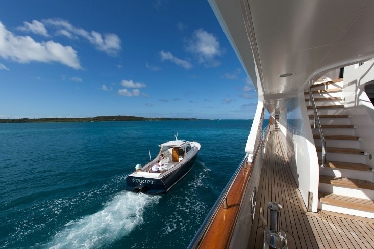 As she supports a heli-pad area on the superstrcuture this means further transport for STARFIRE. This motor yacht has a teak deck.