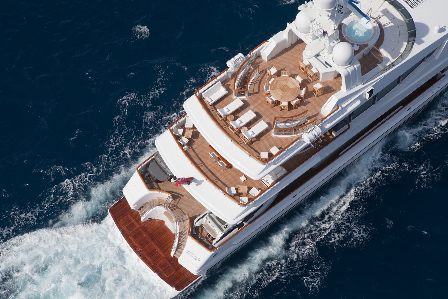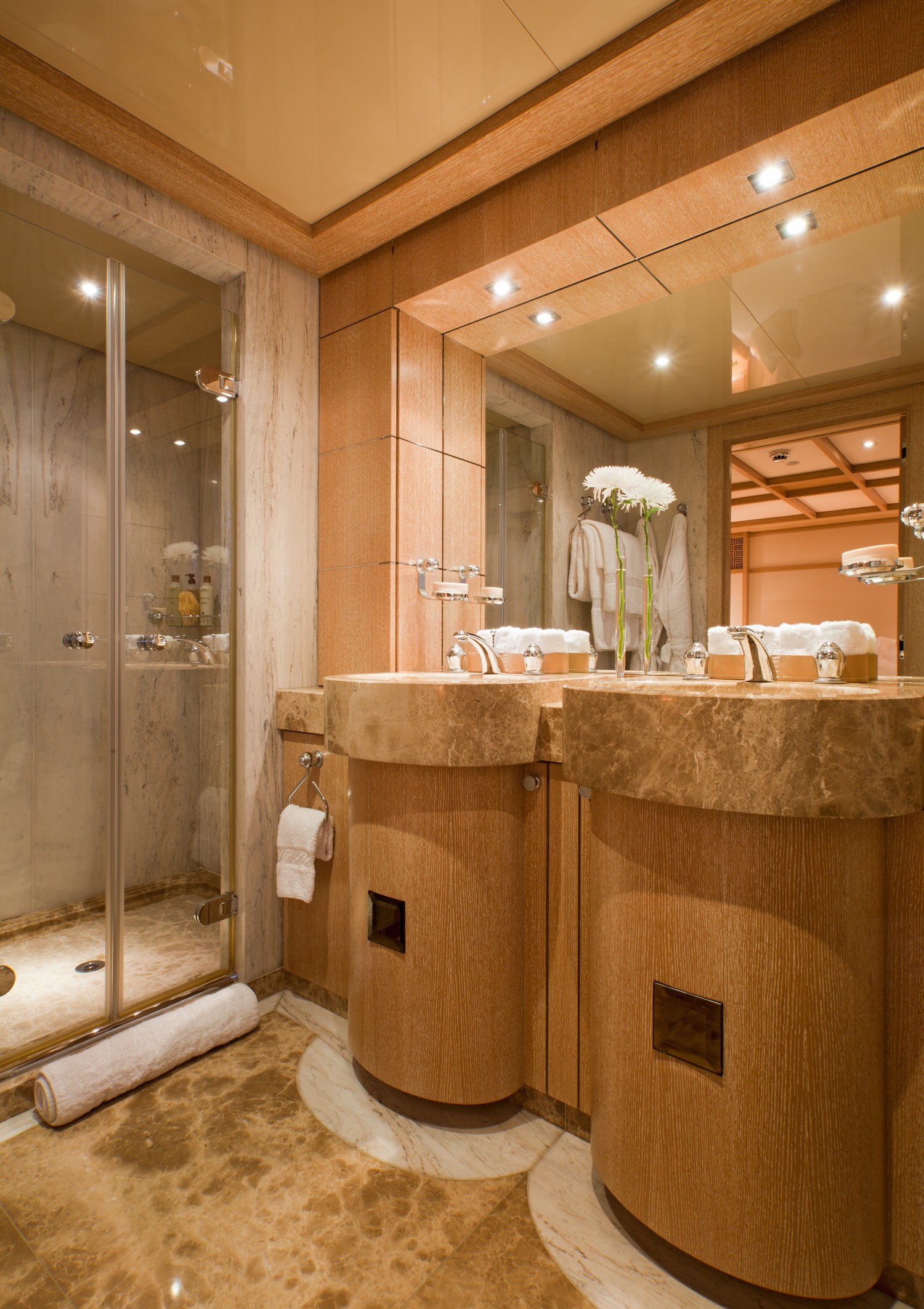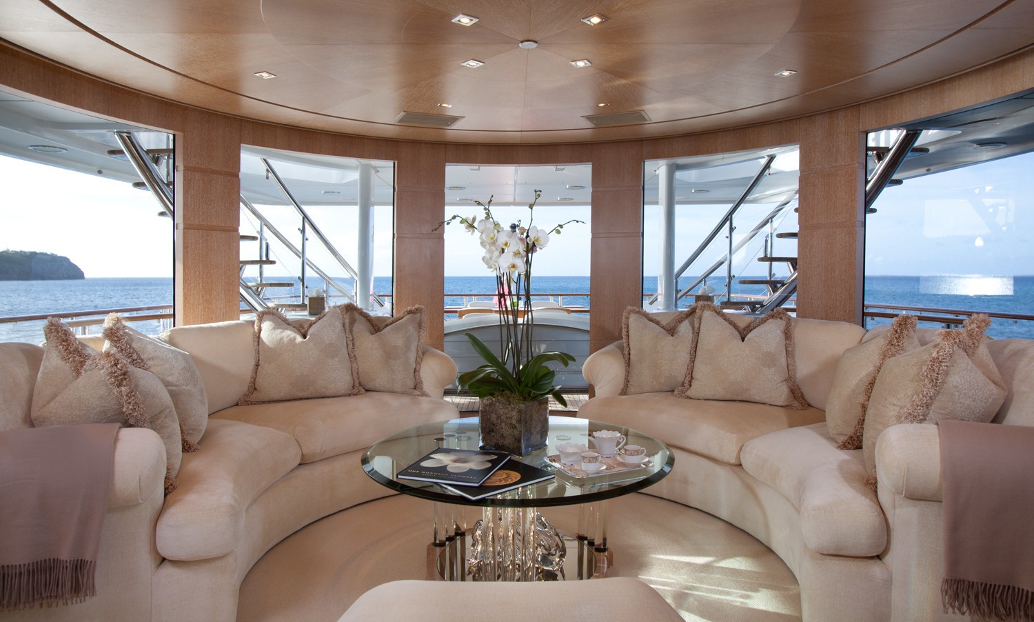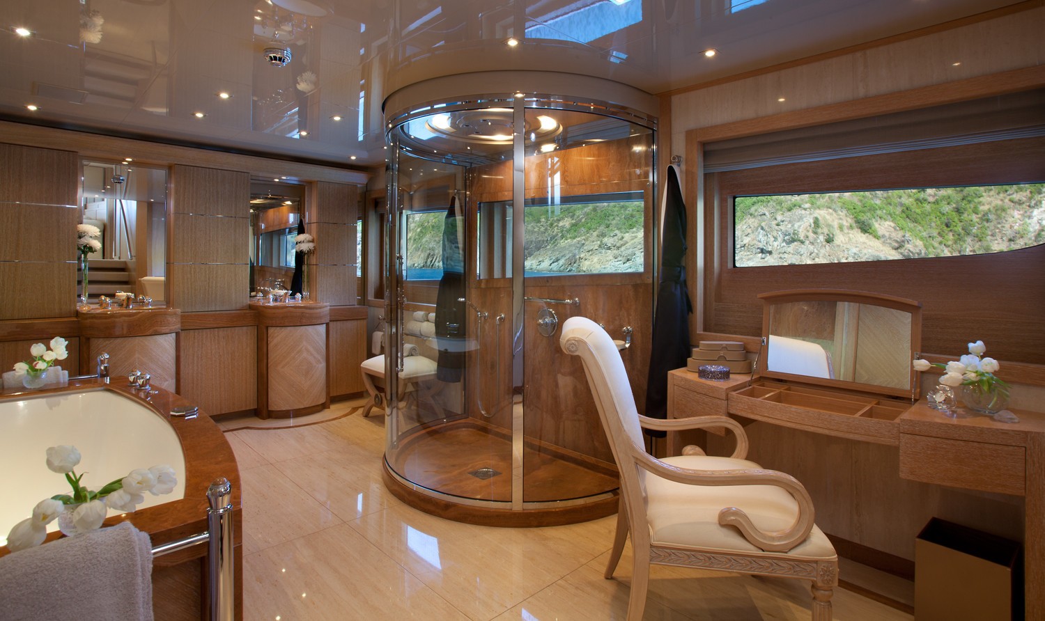 M/Y SUNRISE has a noticeable transom where a spiral staircase winds down to the aft deck. Two tenders are positioned here to lower the centre of gravity and to keep the upper deck free and uncluttered. The owner’s suite is divided into 3 luxurious spaces including a n office, a round suite with panoramic windows and an ensuite with spa tub and dressing area.