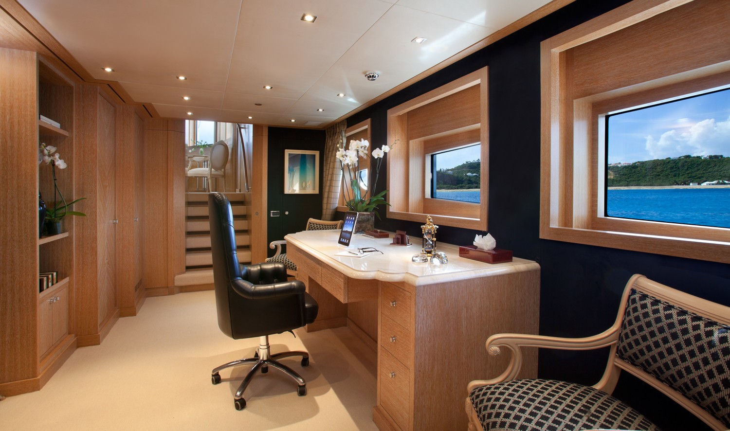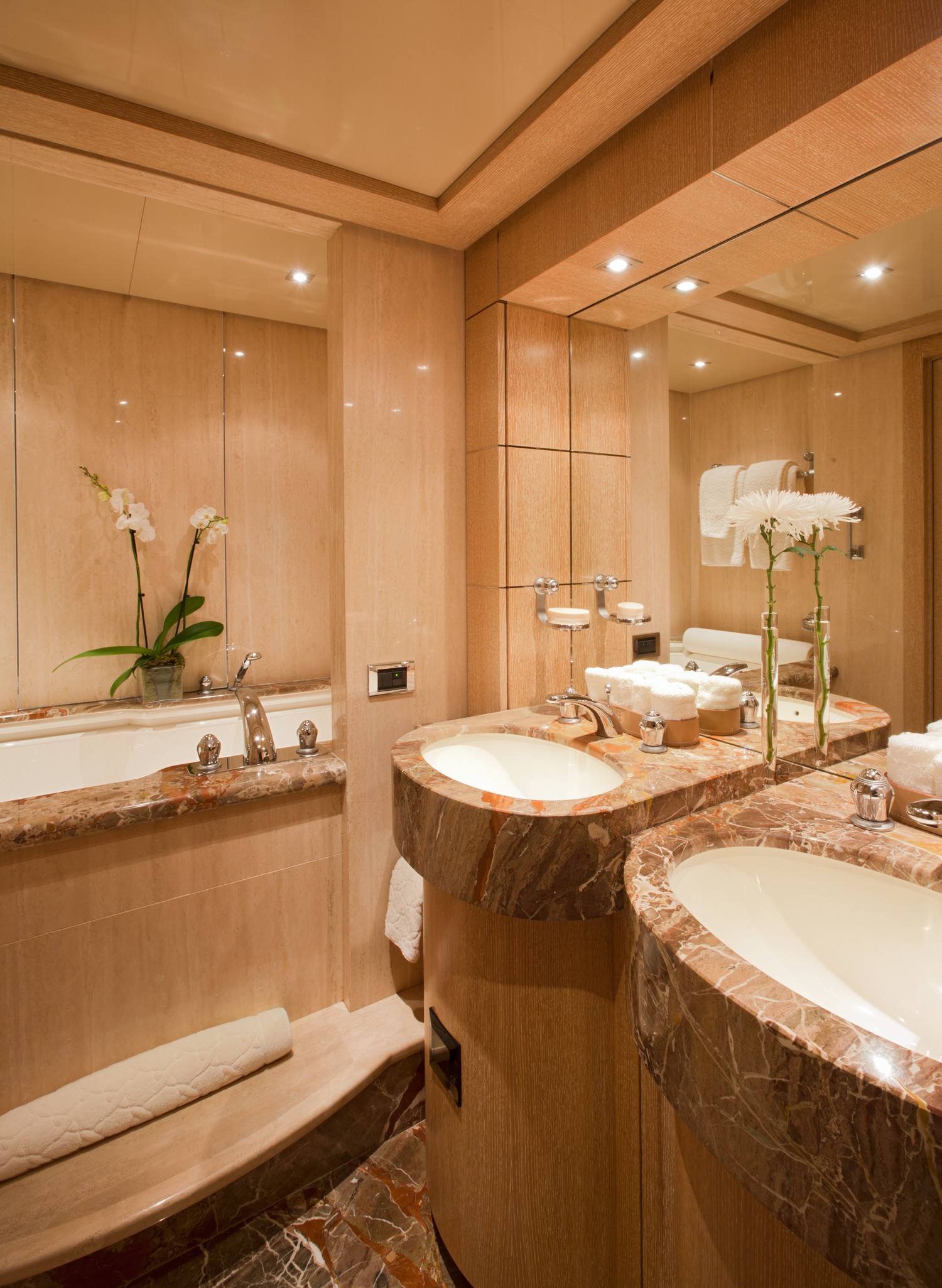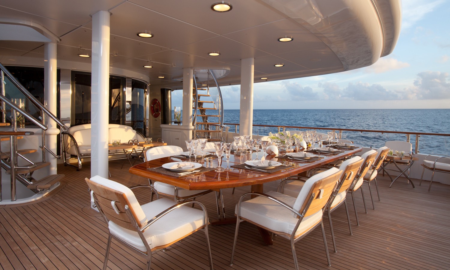 M/Y SUNRISE has a noticeable transom where a spiral staircase winds down to the aft deck. Two tenders are positioned here to lower the centre of gravity and to keep the upper deck free and uncluttered. The owner’s suite is divided into 3 luxurious spaces including a n office, a round suite with panoramic windows and an ensuite with spa tub and dressing area.