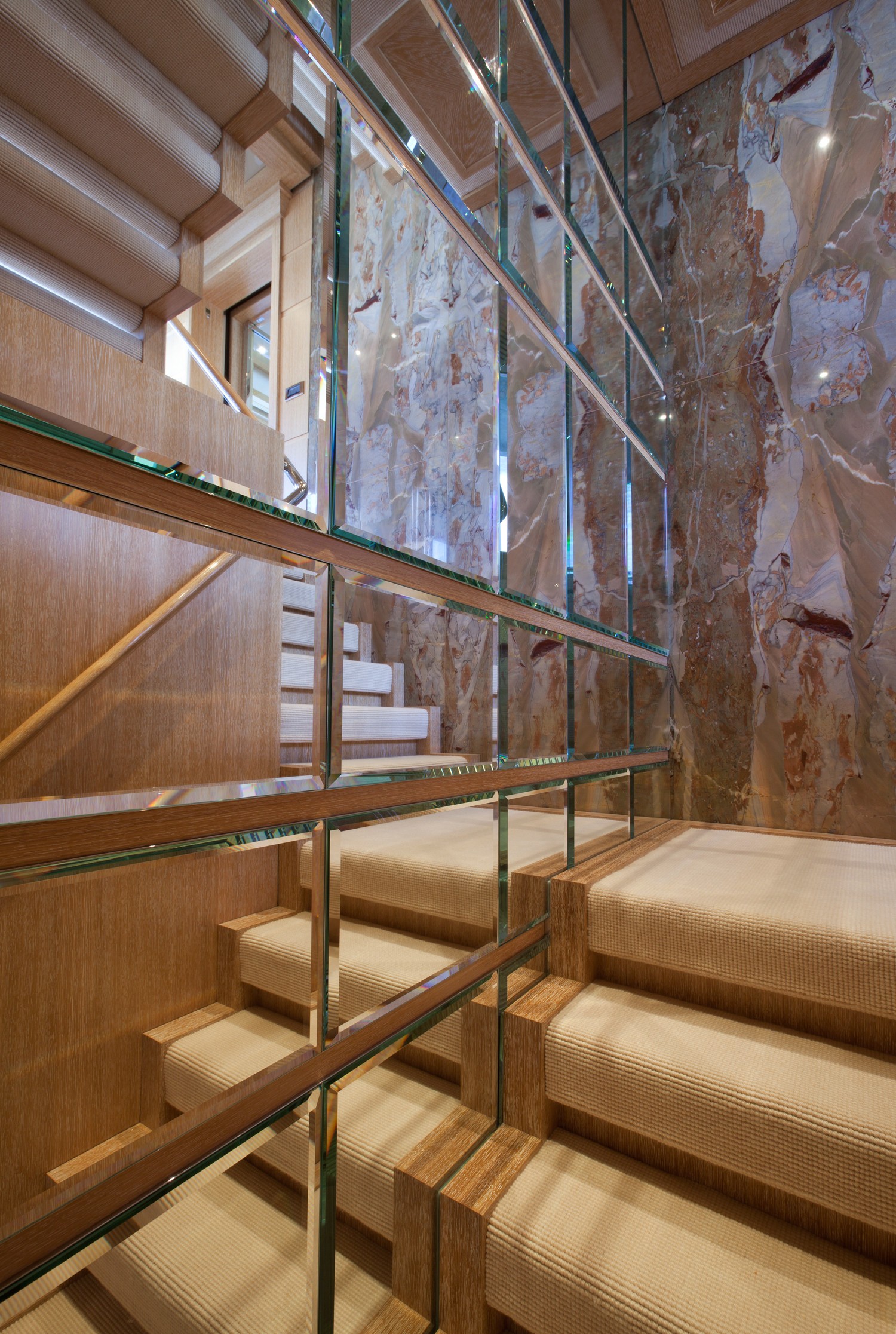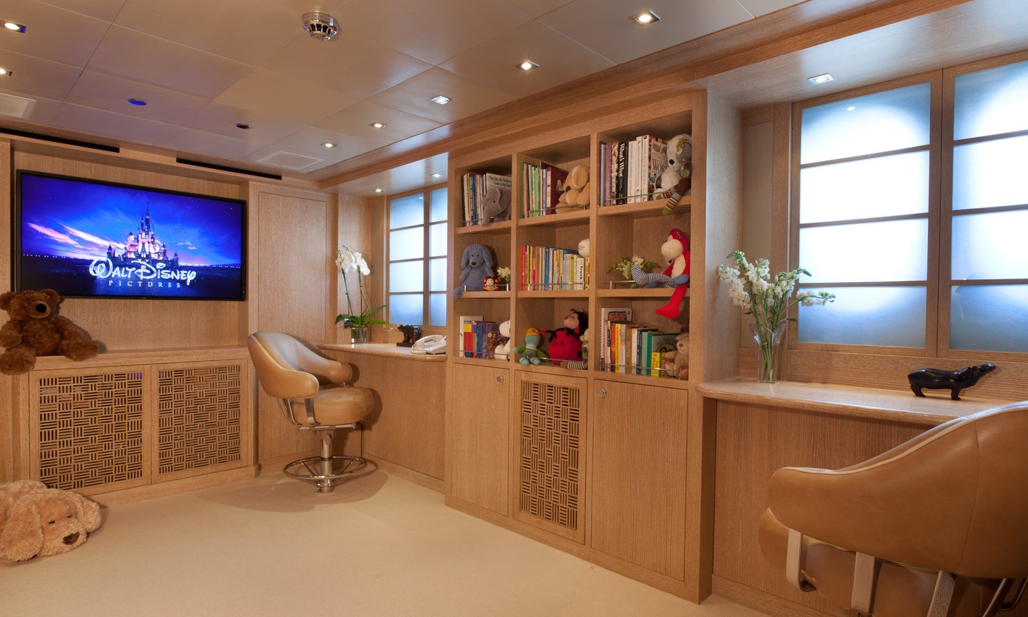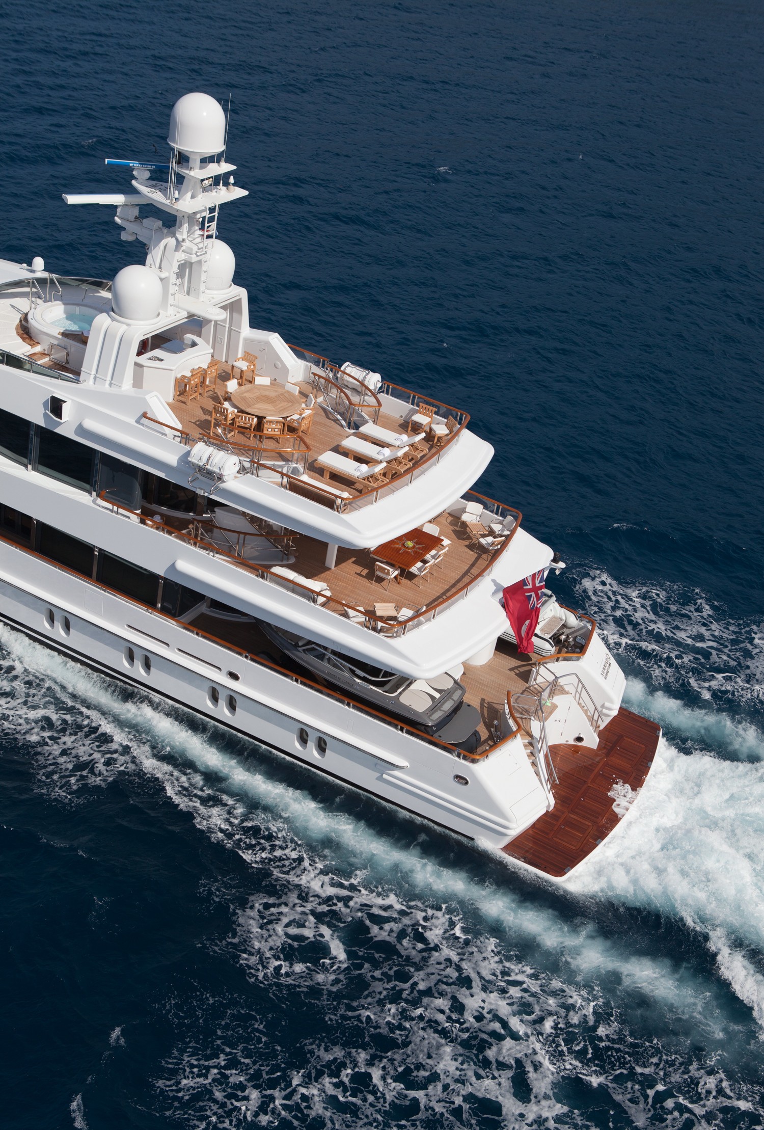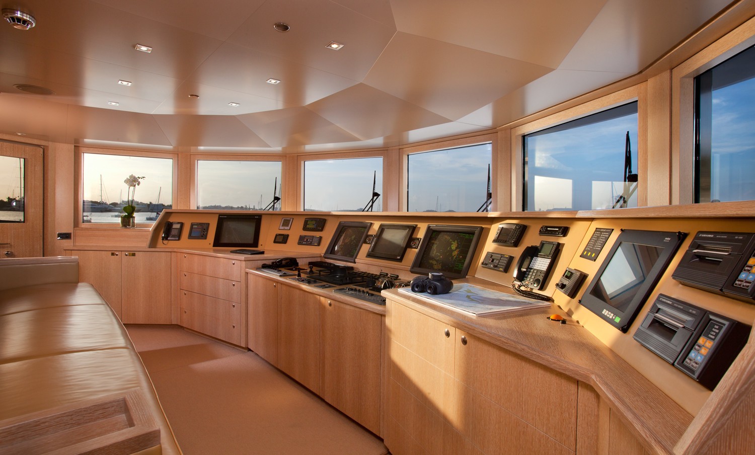 M/Y SUNRISE has a noticeable transom where a spiral staircase winds down to the aft deck. Two tenders are positioned here to lower the centre of gravity and to keep the upper deck free and uncluttered. The owner’s suite is divided into 3 luxurious spaces including a n office, a round suite with panoramic windows and an ensuite with spa tub and dressing area.