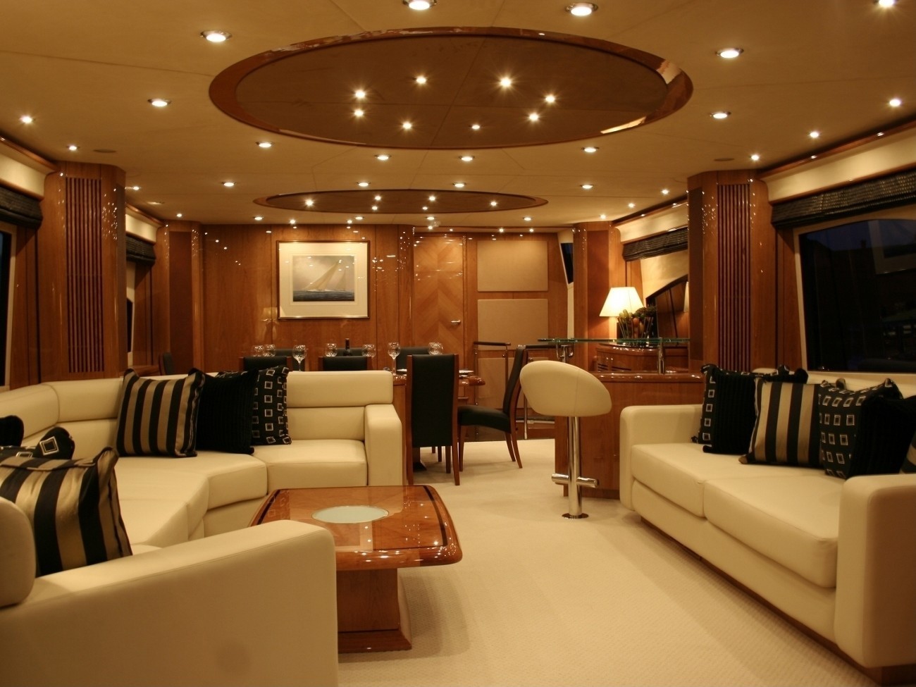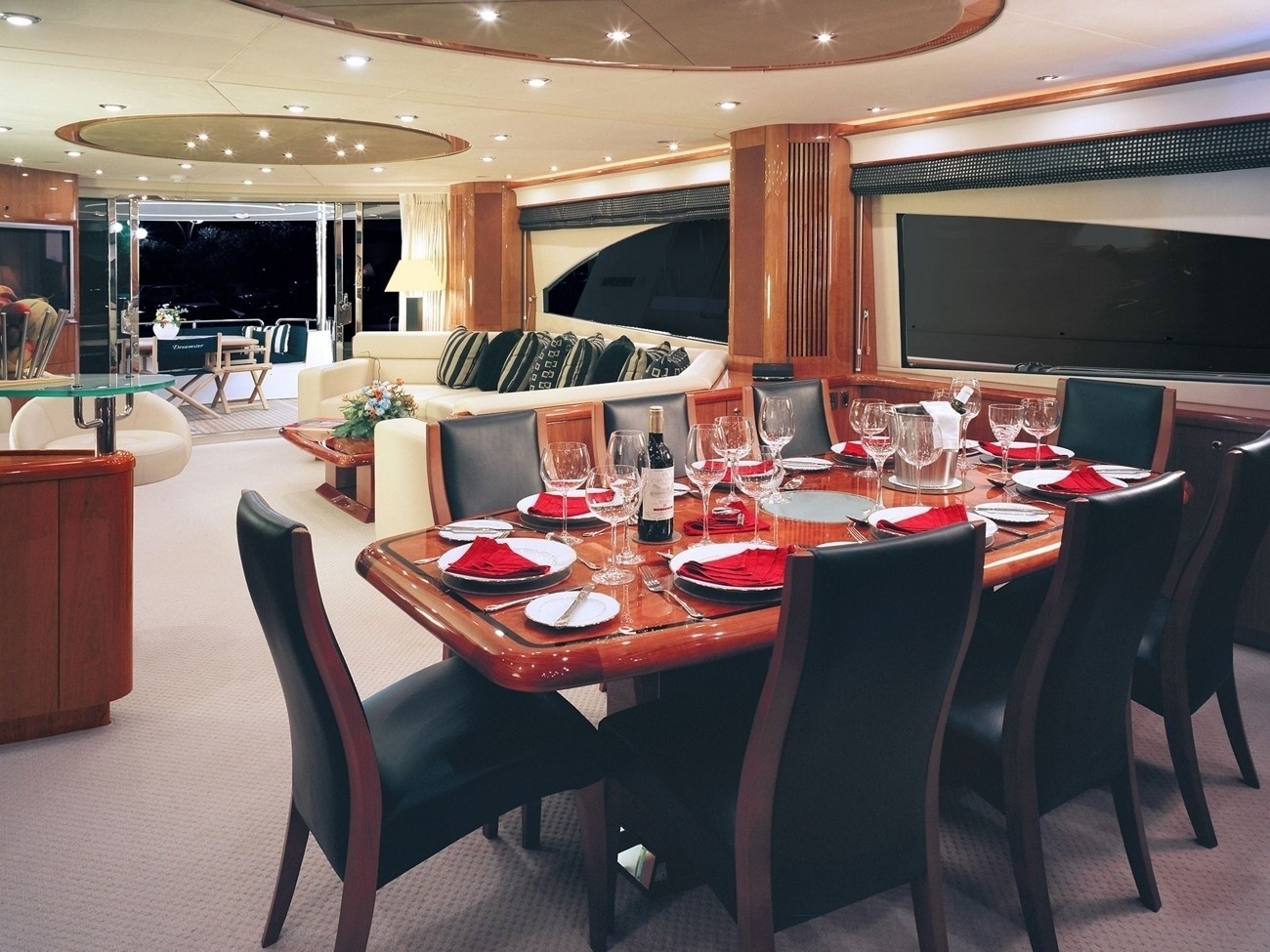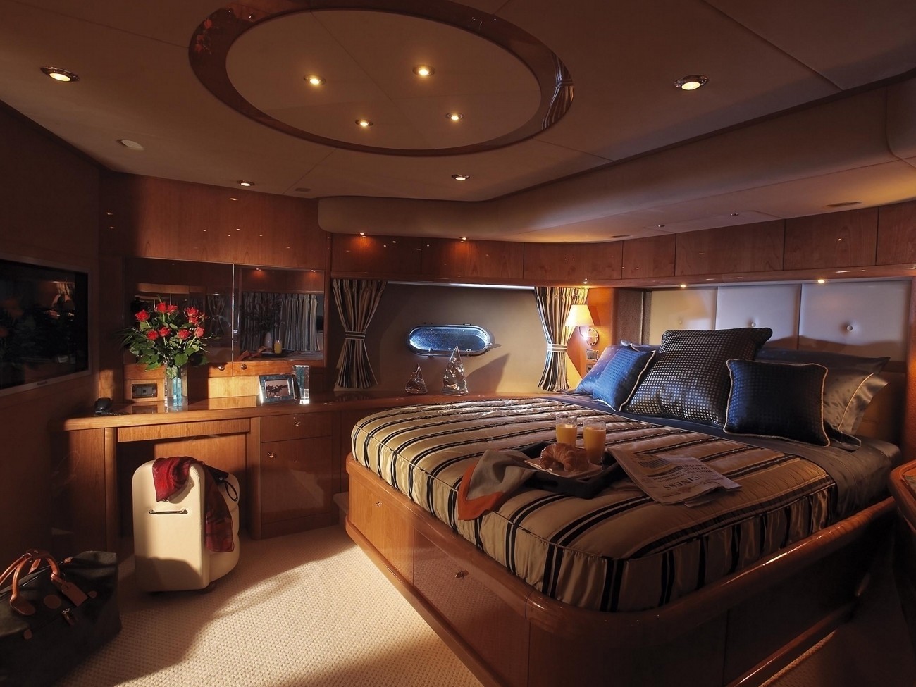Charter Yacht Dreamster accommodates up to nine guests in 4 cabins: Full width owner's cabin situated aft has an en-suite bath/Spa Pool), walk-in wardrobe, dressing table and two seater sofa. Entertainment: A plasma TV 42" TV and radio/CD/DVD surround sound system and satellite TV system with decoded. Forward VIP cabin with ensuite shower, wardrobe, dressing room and 42" Sony Plasma TV, surround sound CD/DVD/VHS and satellite TV system with decoded. Portside Double cabin with en suite shower, wardrobe and 17" LCD flatscreen TV, Sony CD/DVD and Alpine CD/Radio unit. Starboard Triple cabin: bunks and one berth fixed with wardrobe,en suite shower, 17" LCD flatscreen TV, CD/DVD and Alphine CD/Radio unit. The head in the triple cabin will be used as the head for the main saloon.