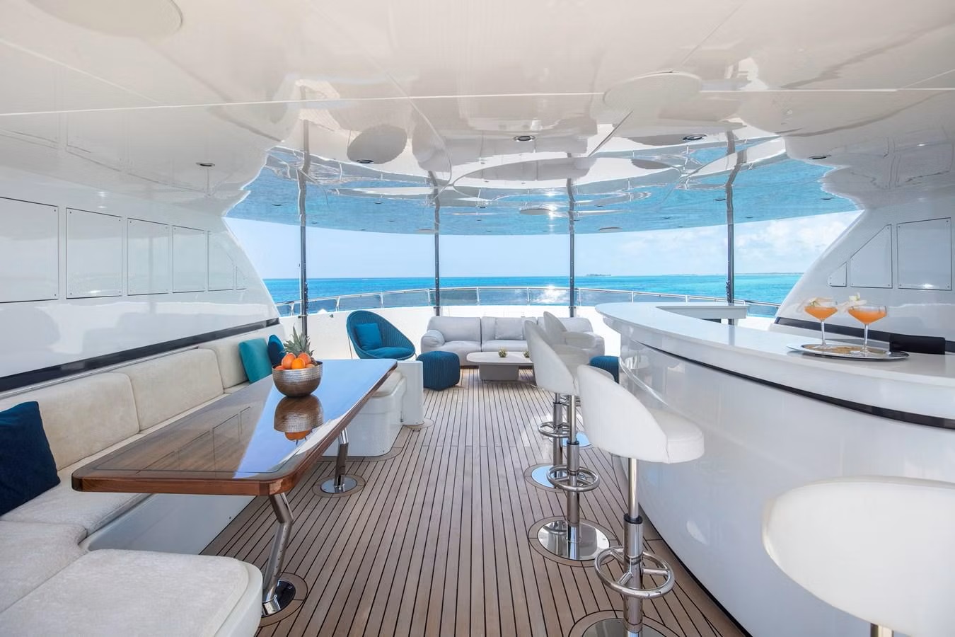 The vessel features a fairly unique layout. Her master suite is situated on the upper deck in the area, which would normally be dedicated to sky-lounge. On the other hand, the usual place for the master suite, which would be on the main deck, is substituted by a spacious gymnasium and cinema for owners' entertainment.