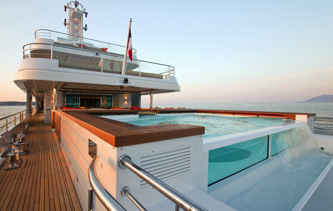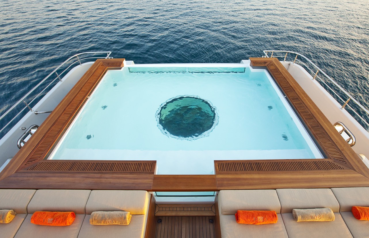 Luxury yacht YOGI features an innovative design and boasts a large swimming pool on the main deck stern. Integrated into the floor of the swimming pool is a large circular glass port that will create a magical atmosphere with a spectacular, aquarium-like iridescent light penetrating the Beach Club directly below. Forward of the Beach Club, there is a garage for a large tender to be stowed across the beam.