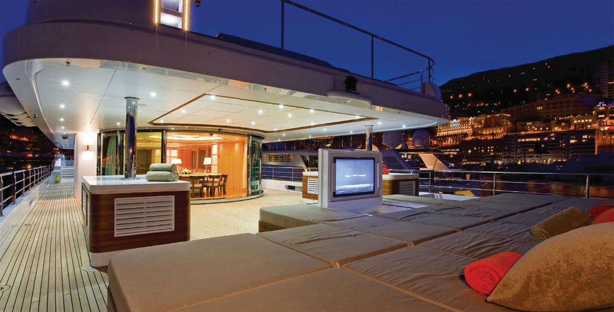 Superyacht YOGI’s sun deck features built in sunbeds and a Spa Pool aft which mimics the shape of the pool on the lower level. Forward on the sundeck there is a large al fresco dining table. Motor yacht YOGI also boasts a sun deck Teppanyaki bar, two beach clubs, a massage room, and a multimedia play lounge along with a large main salon, formal dining area and skylounge.