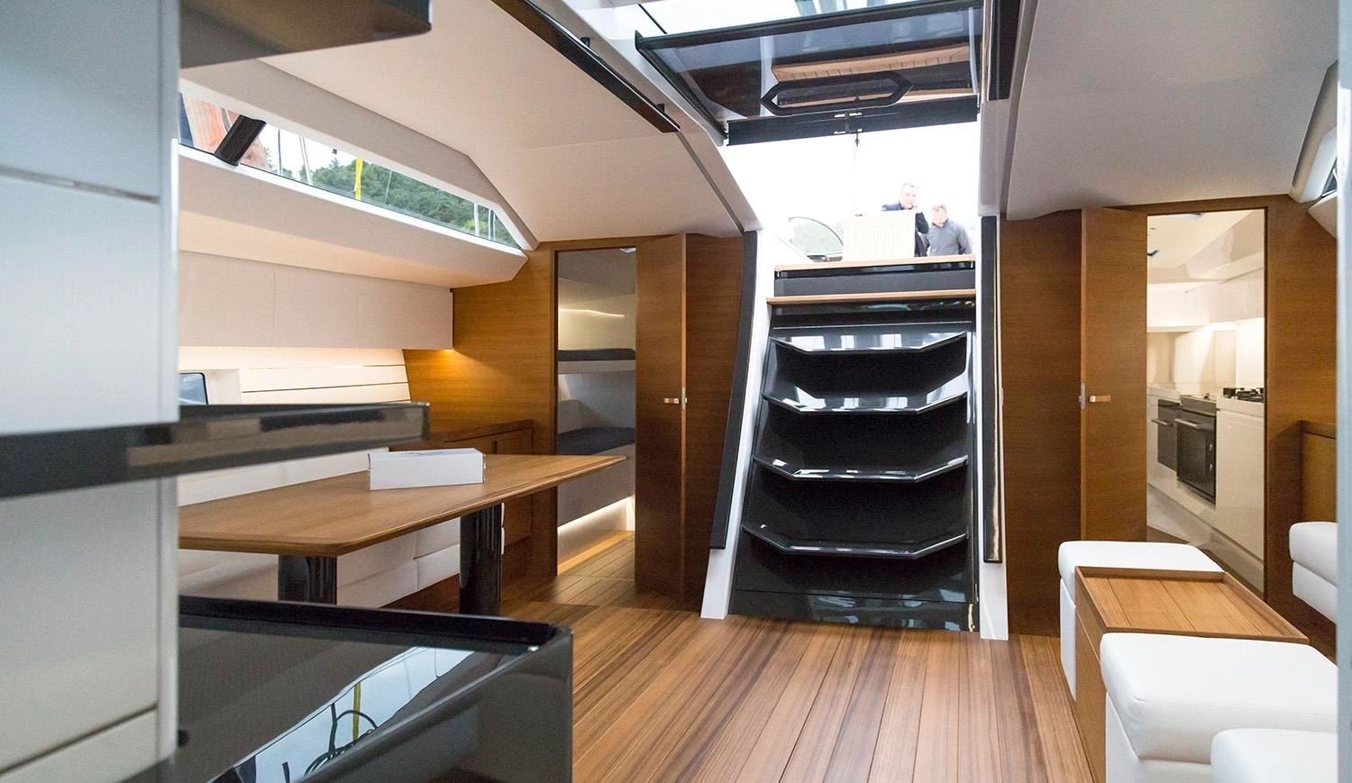 Inside, O2 surprises with her generous volume and sophisticated design. Her interiors strike a refined balance between contemporary comfort and the lightweight ethos of a performance yacht. Clean lines, premium finishes, and a neutral colour palette create a serene, inviting atmosphere. Natural light floods the salon through wide hatches and sleek windows, enhancing the open-plan layout.