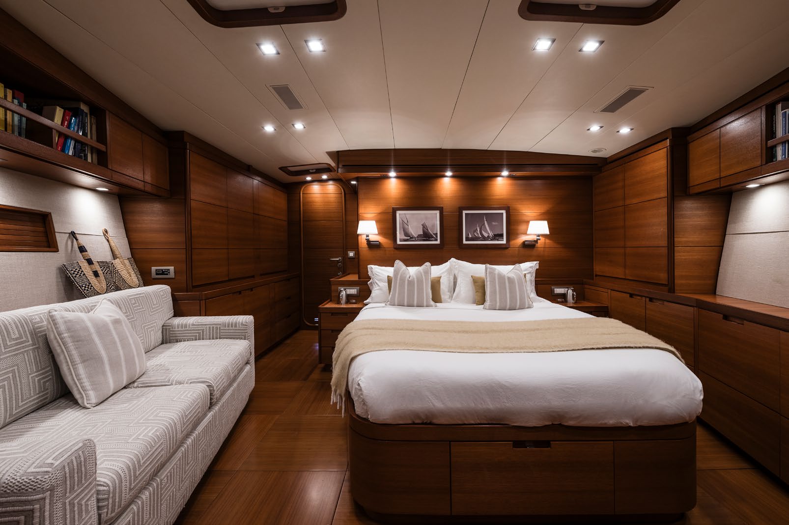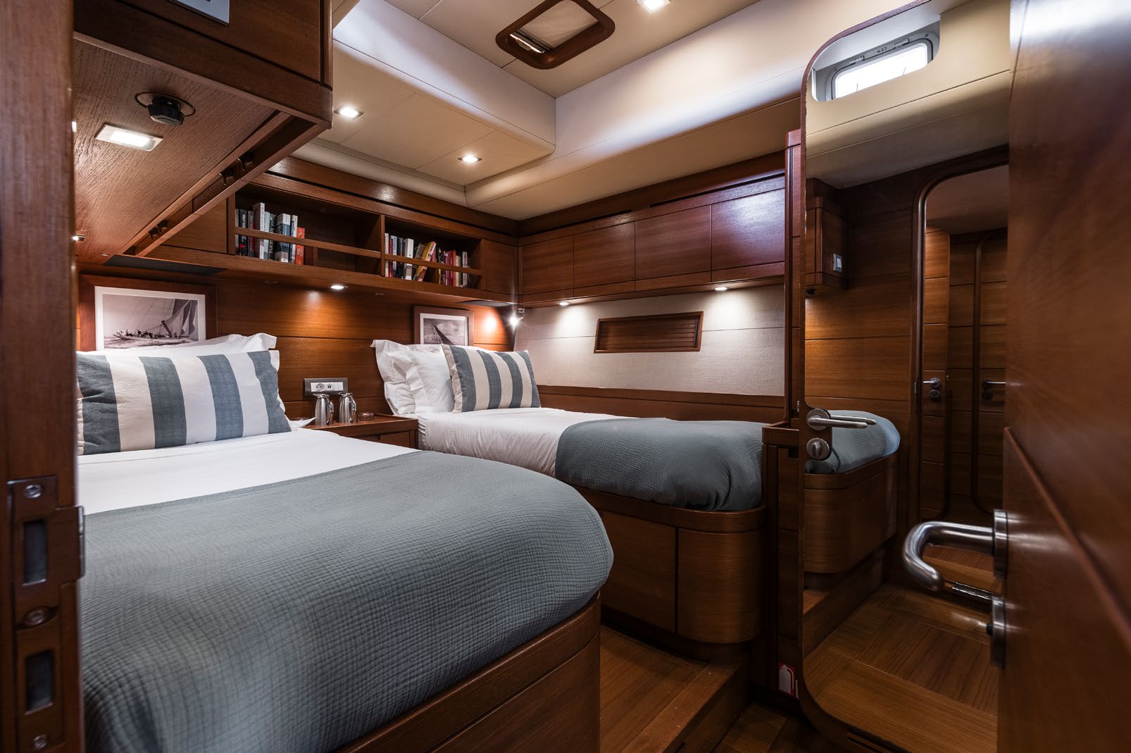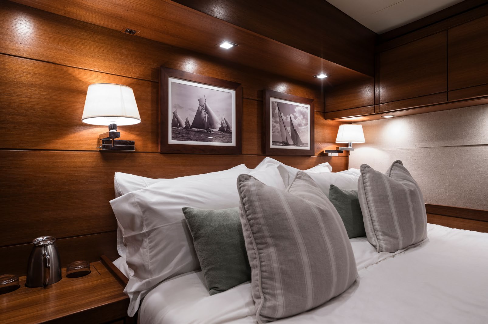 Accommodation is for up to eight guests in four suites with the master and VIP cabins placed forward of the main salon and the two twin guest cabins located aft. All the suites benefit from the luxury and privacy of ensuite bathroom facilities and echo the décor and atmosphere of the communal spaces.