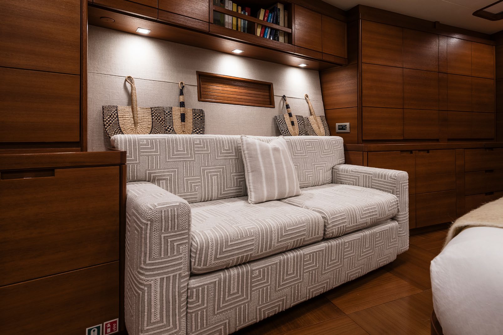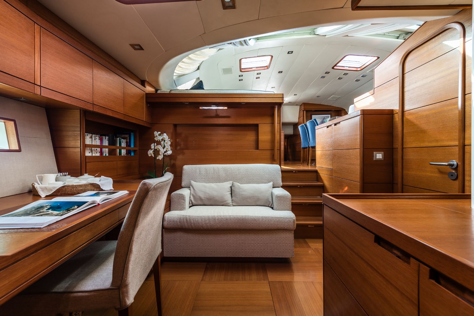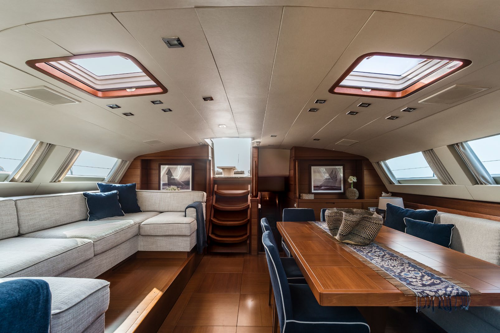 The beautiful interior design offers a nod to a nautical theme including warm wood finishes, comfortable neutral sofas and accents of blue. Guest will descend the ladder steps from the deck to find a split-level main salon with a u-shaped sofa to starboard and a port side dining area. On the lower level there is an office space and a cosy armchair.