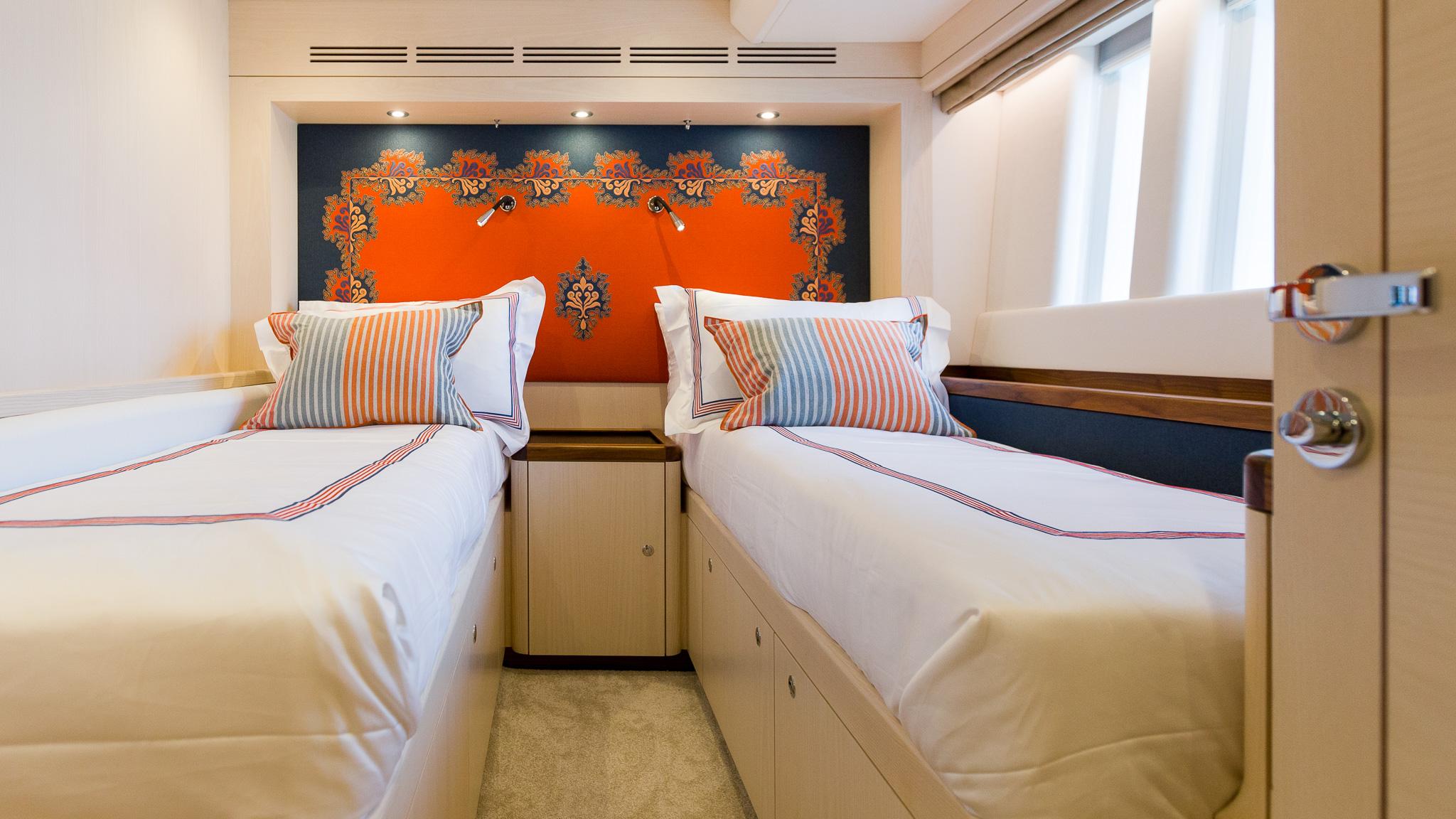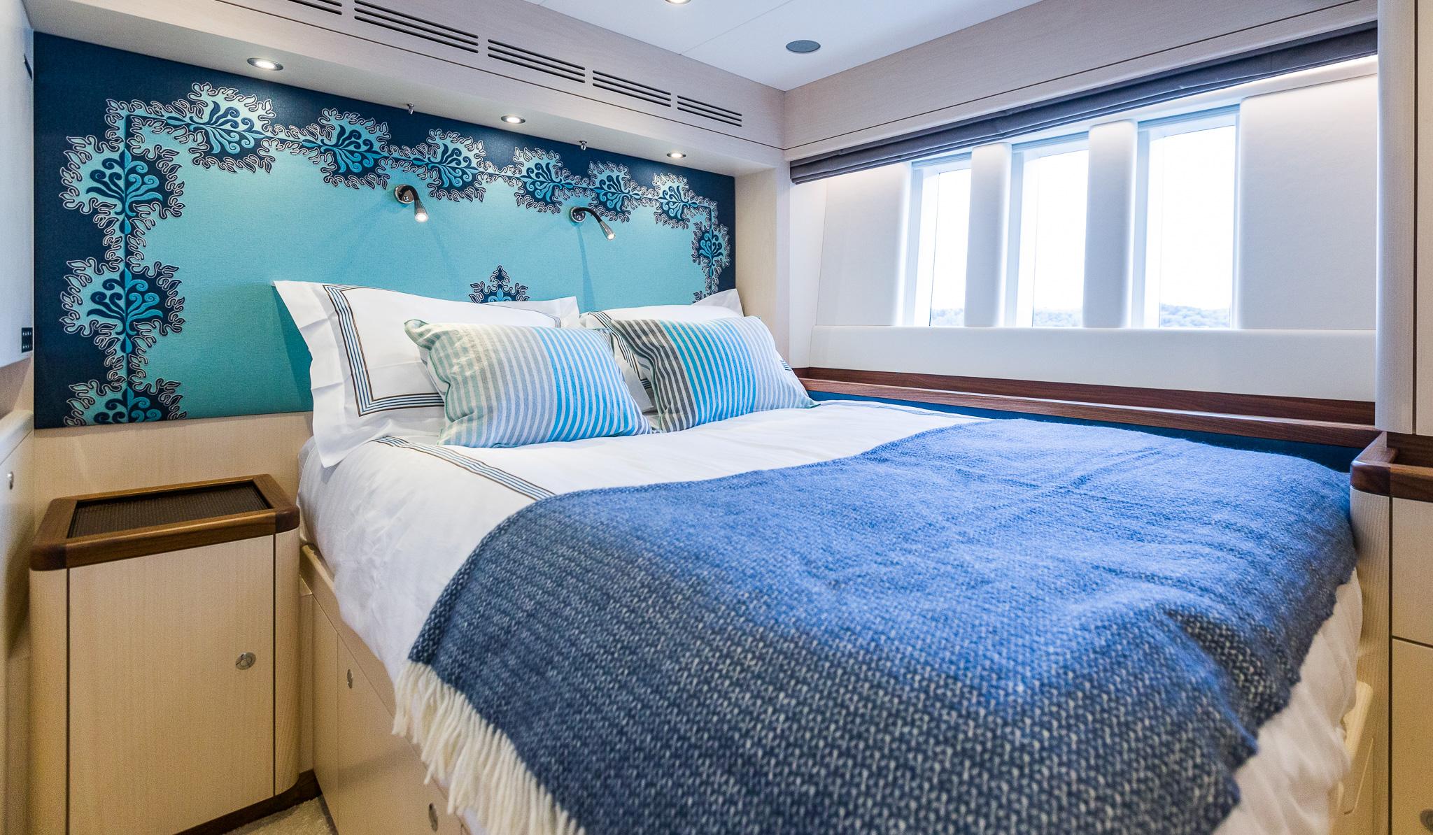The guest accommodation is aft while the crew cabins and galley are forward.