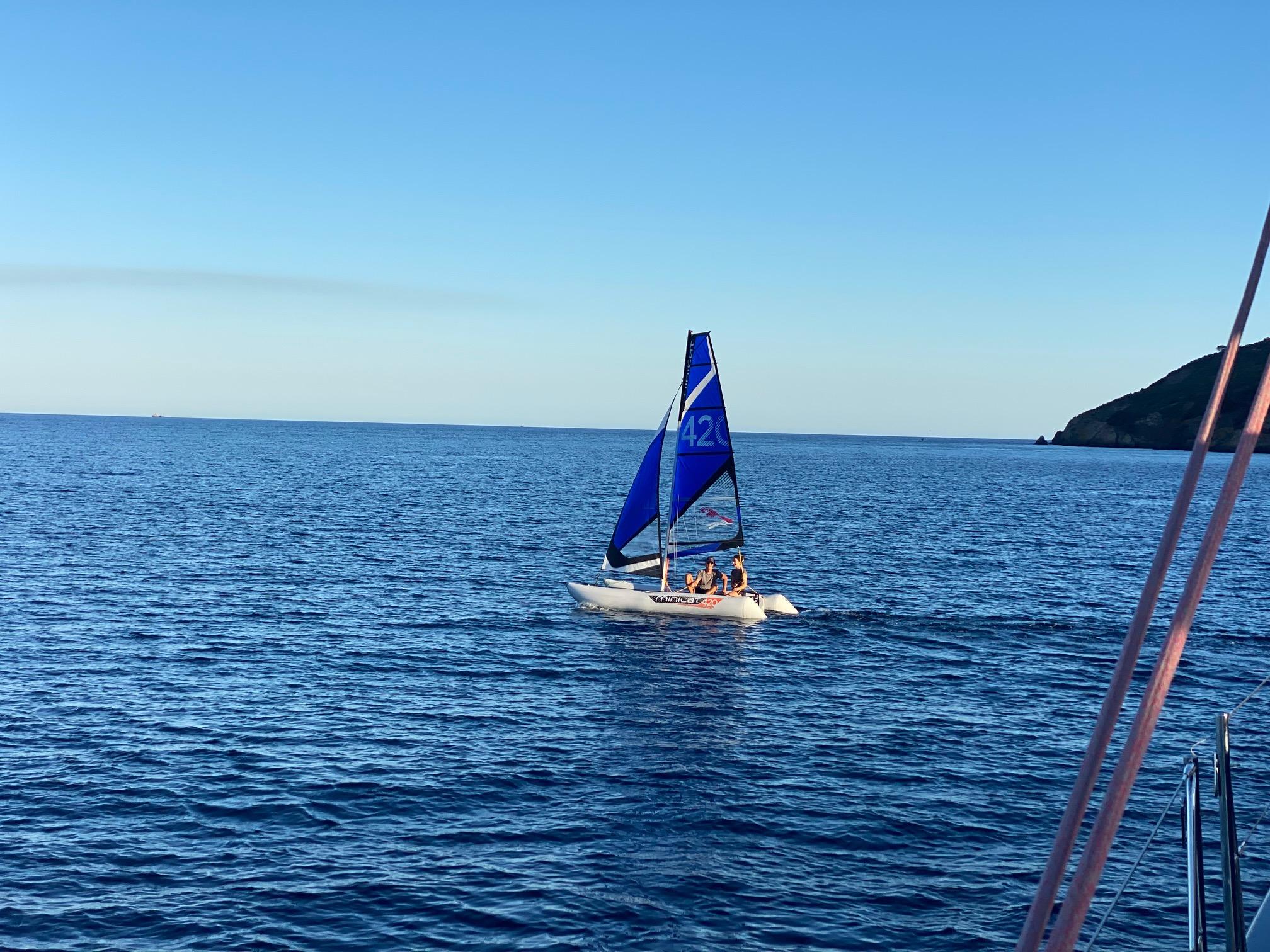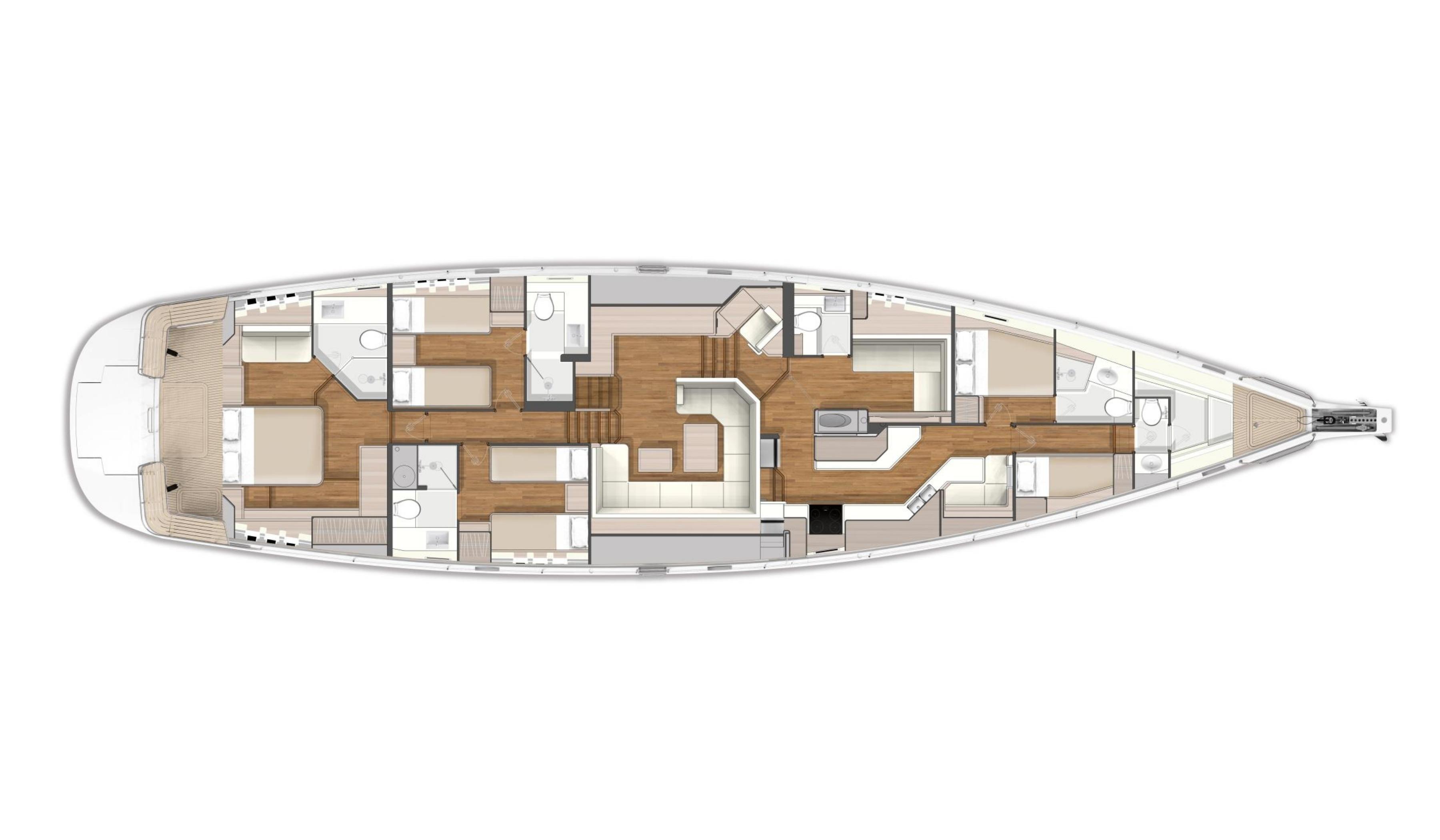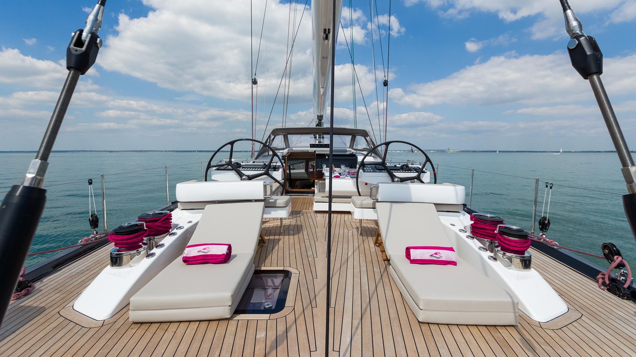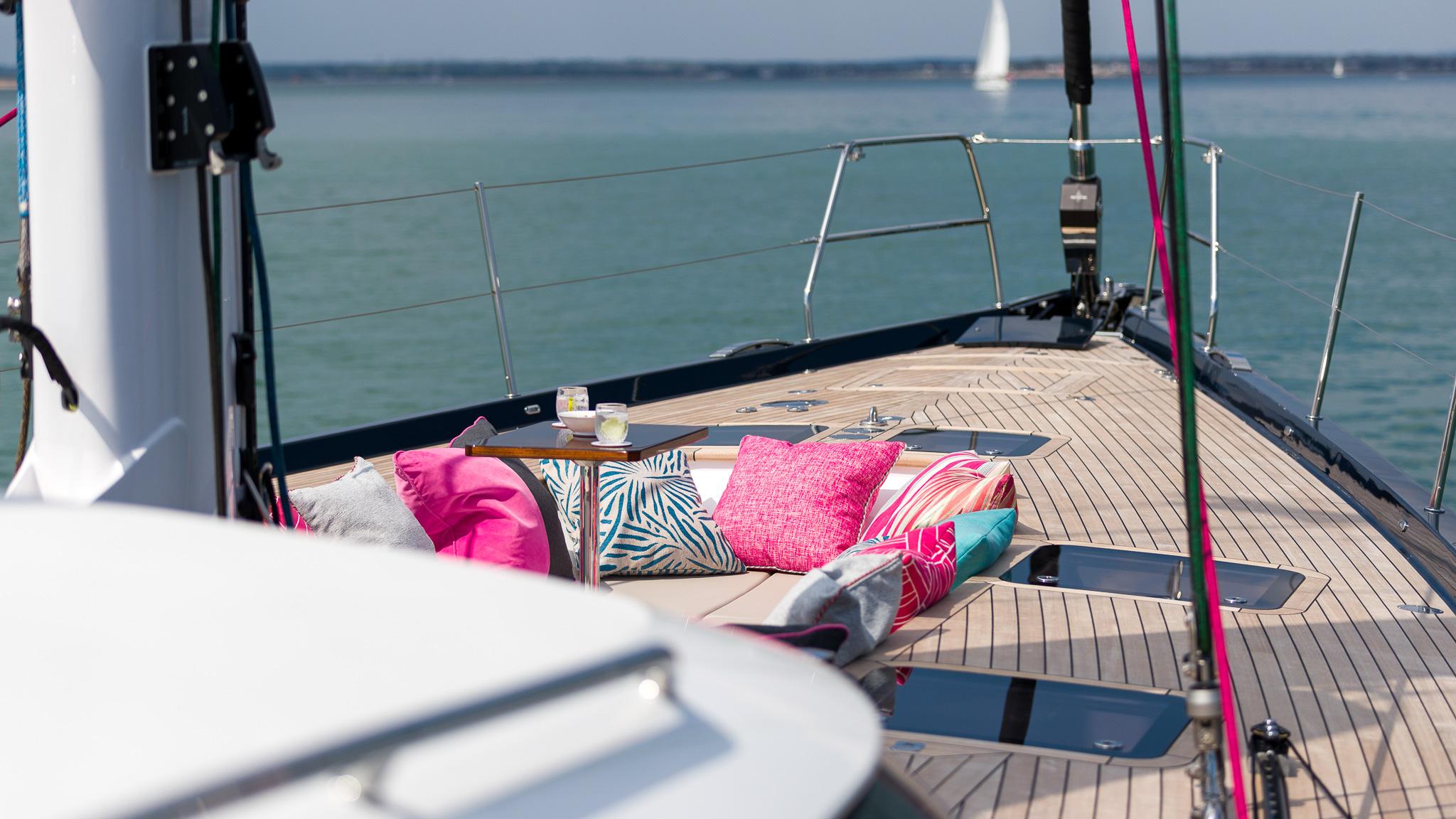 On deck finds sociable guest spaces both on the foredeck and the aft cockpit. The sunken sunbathing zone on the foredeck is filled with sun pads and loads of comfortable cushions – there is also a convenient table, so you don’t spill your drink!
