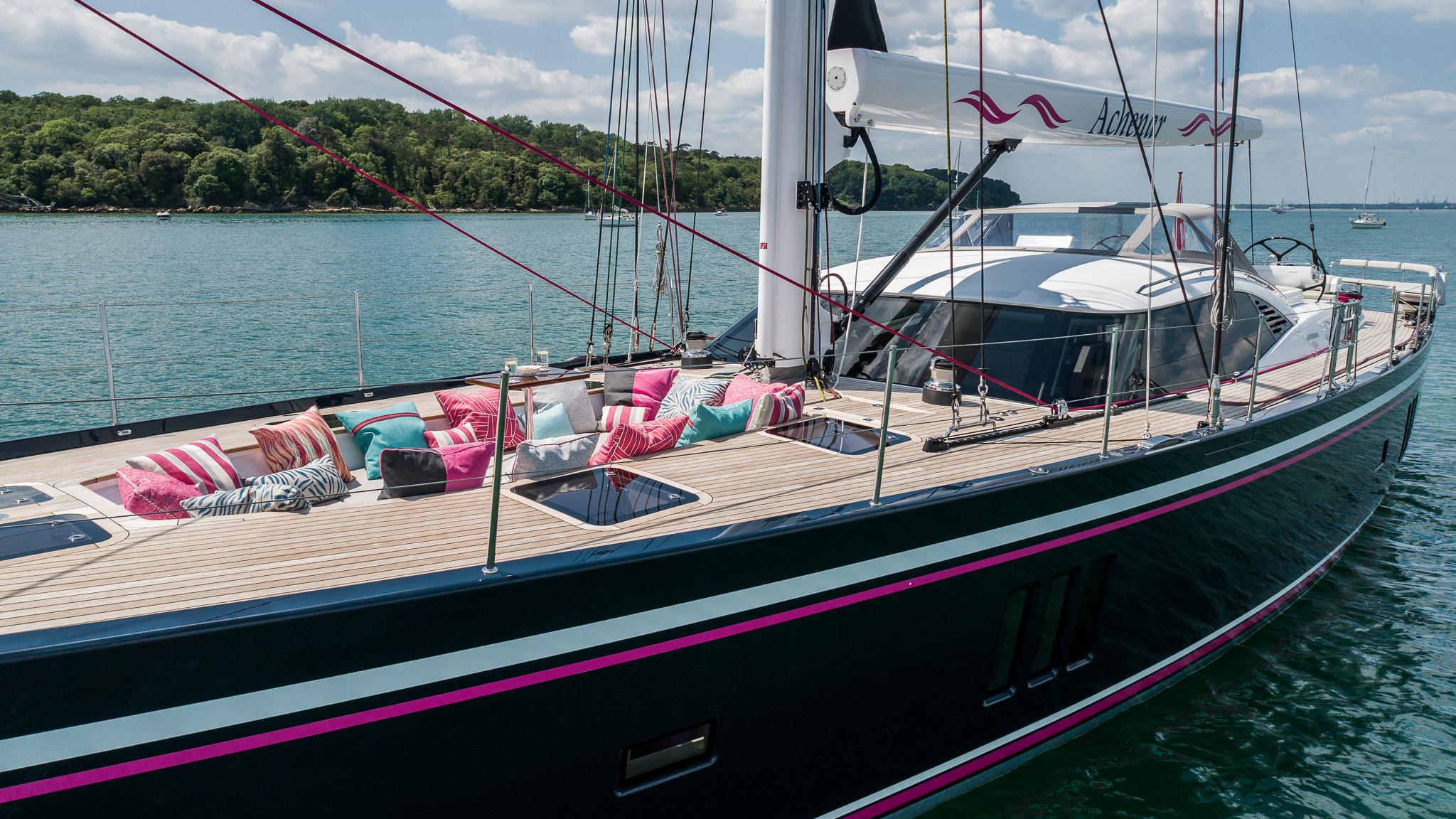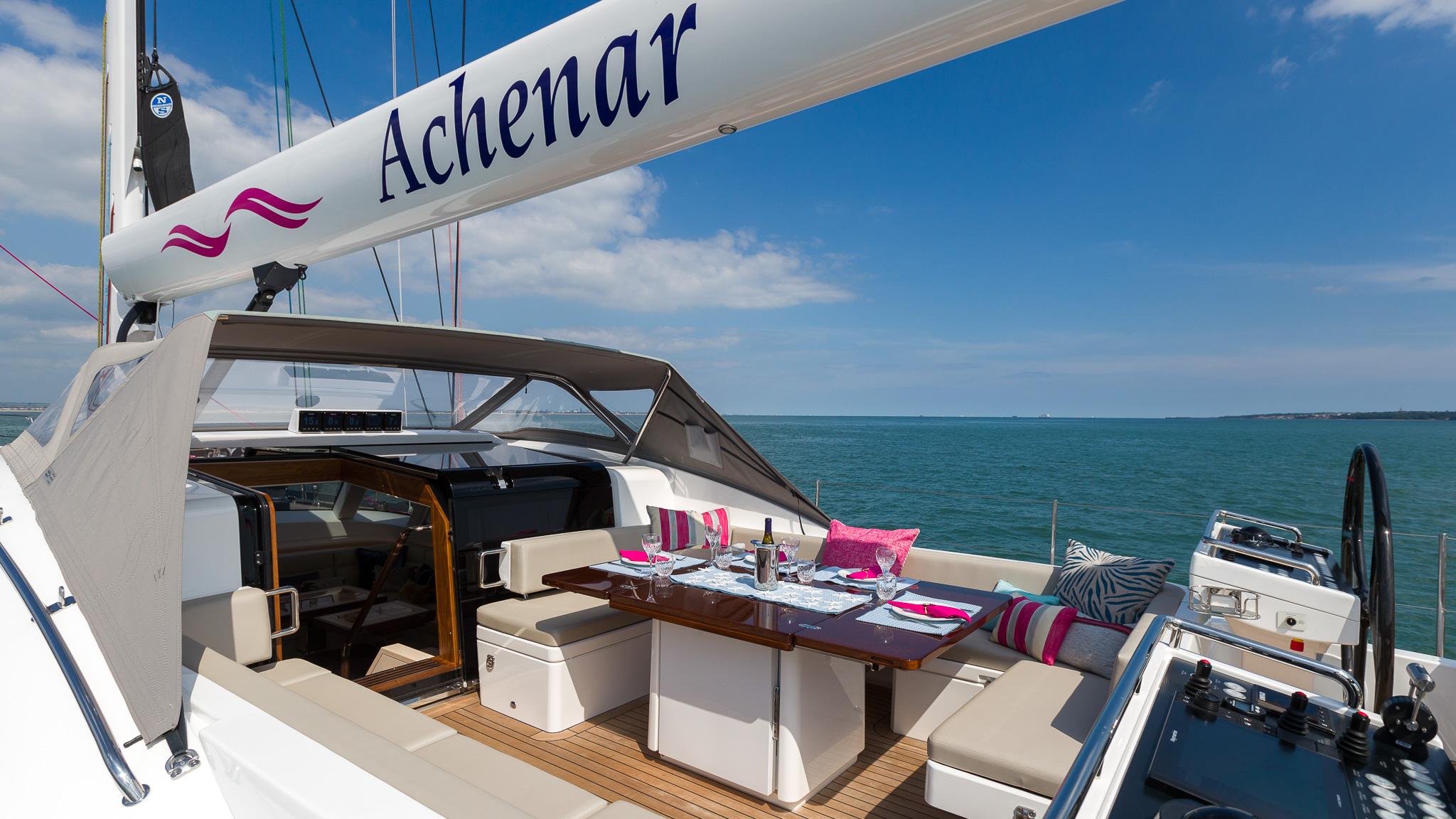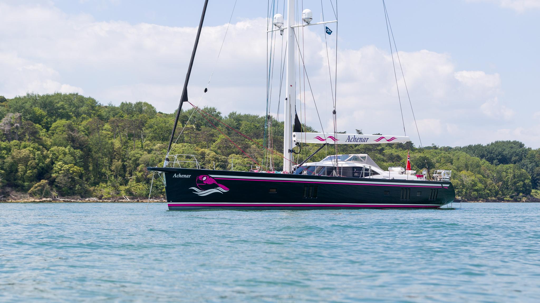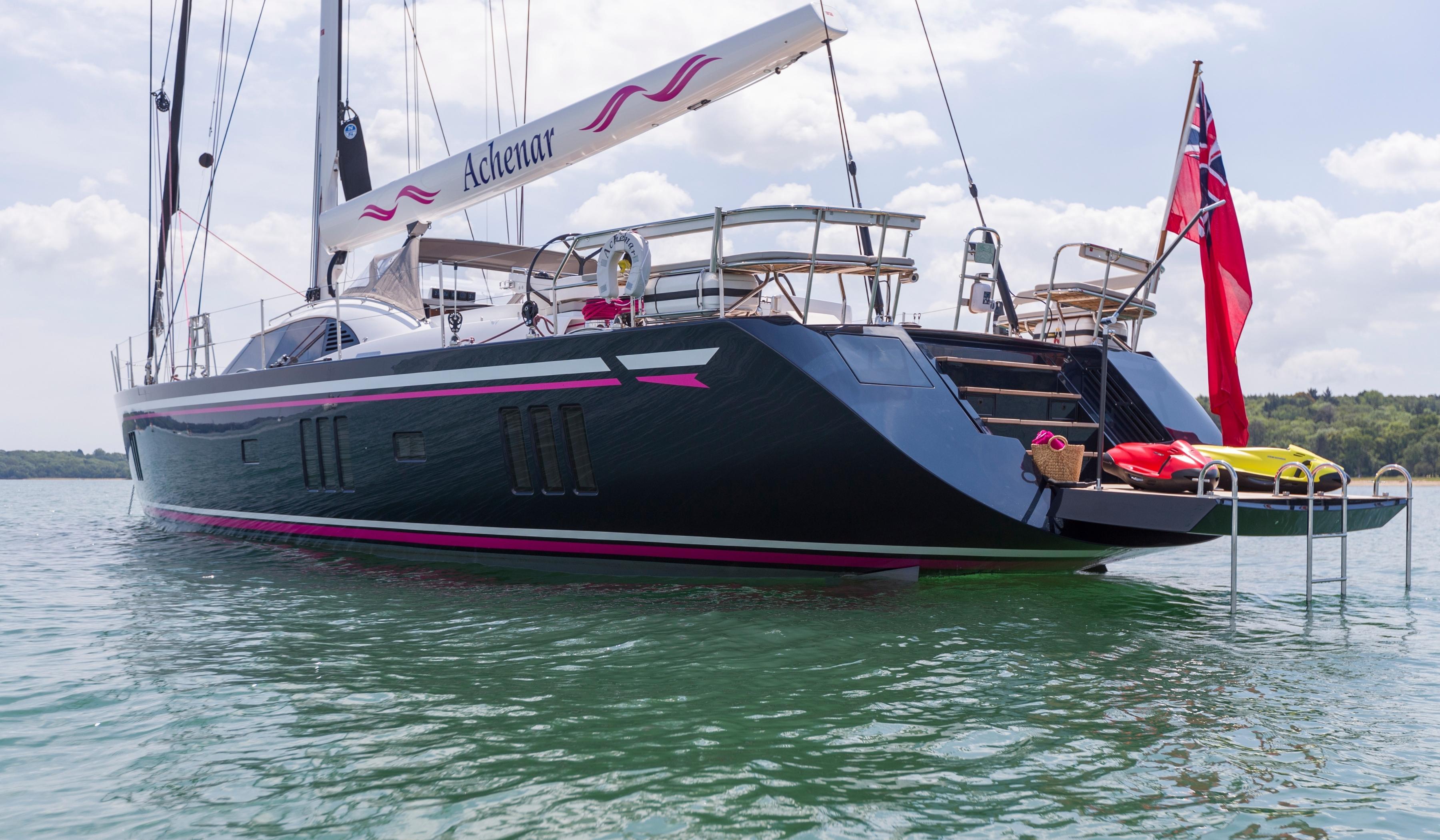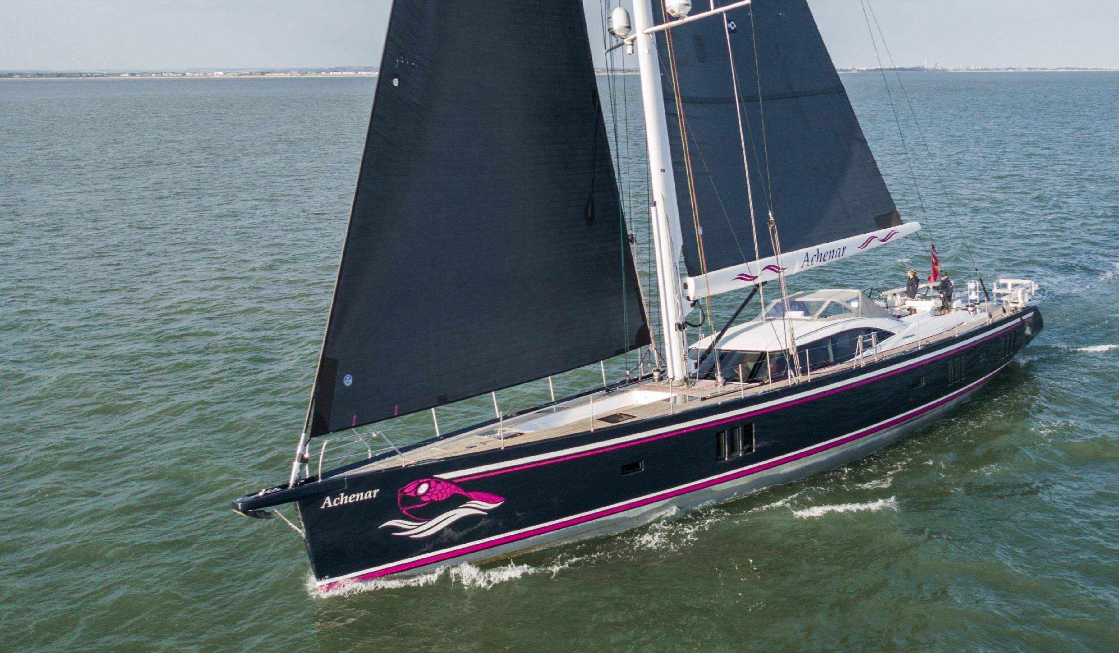 Sailing yacht ACHENAR is a 2021 built Oyster 885 with a length of 27.00m (88' 7") and the ability to effortlessly host guests for a charter focussing on luxury performance sailing. Her eye-catching good looks feature a deep blue hull and sails complemented by bright decals and waterline stripe. Accommodation is for up to eight guests in four suites with additional cabins for the four crew members.