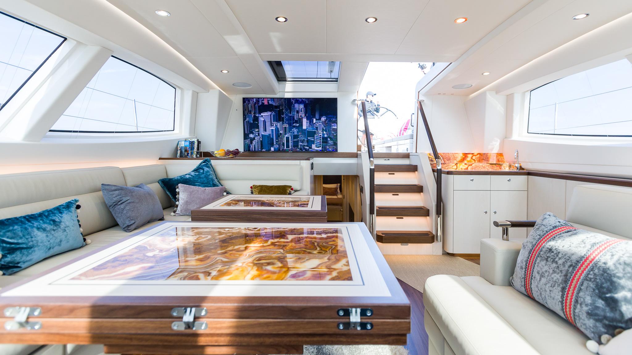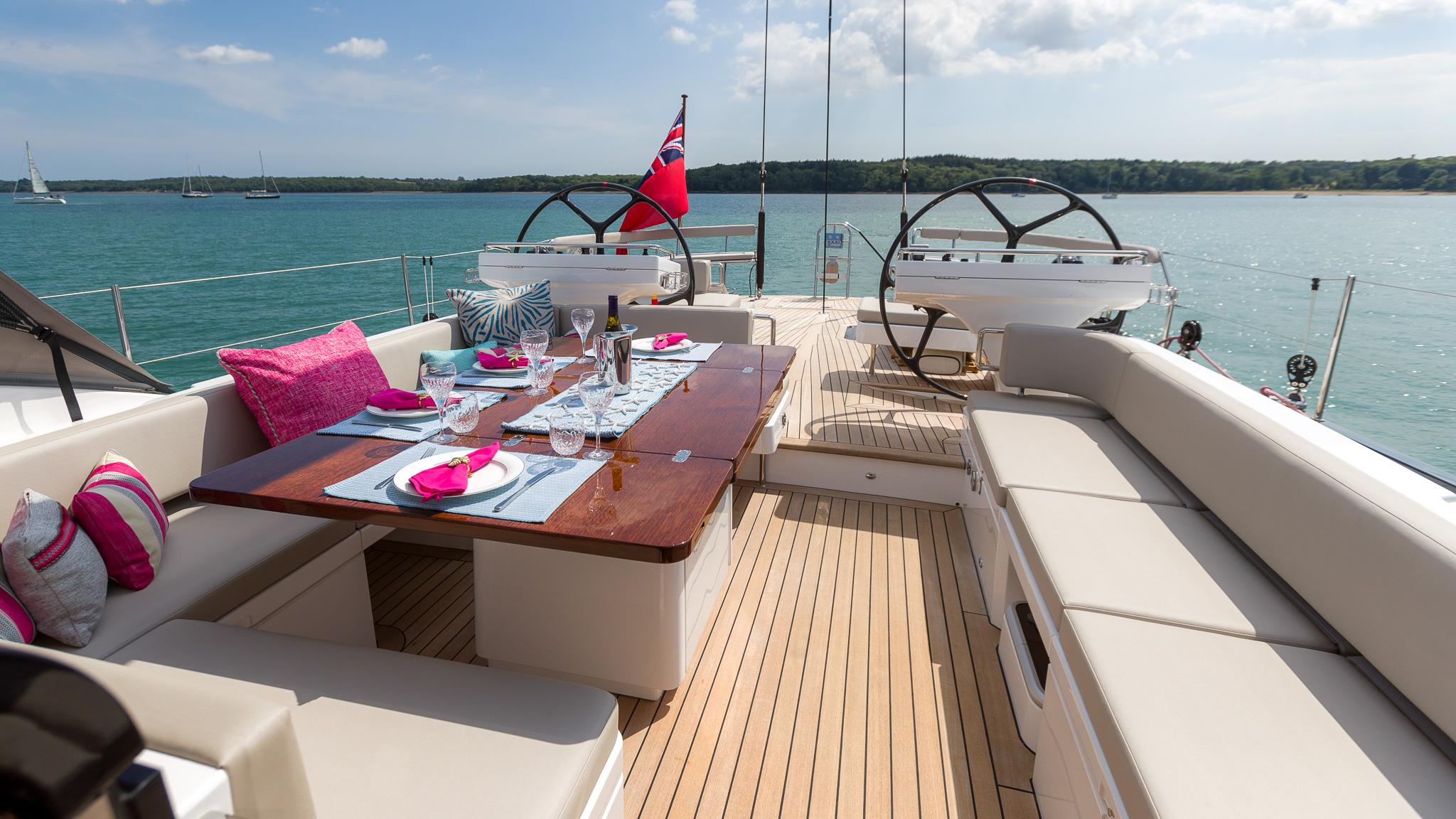 The aft cockpit is home to the dual helm controls and seating, moveable sun pads as well as the flexible seating / dining area with an adjustable table surrounded by a u-shaped sofa. From here there is access into the main salon.