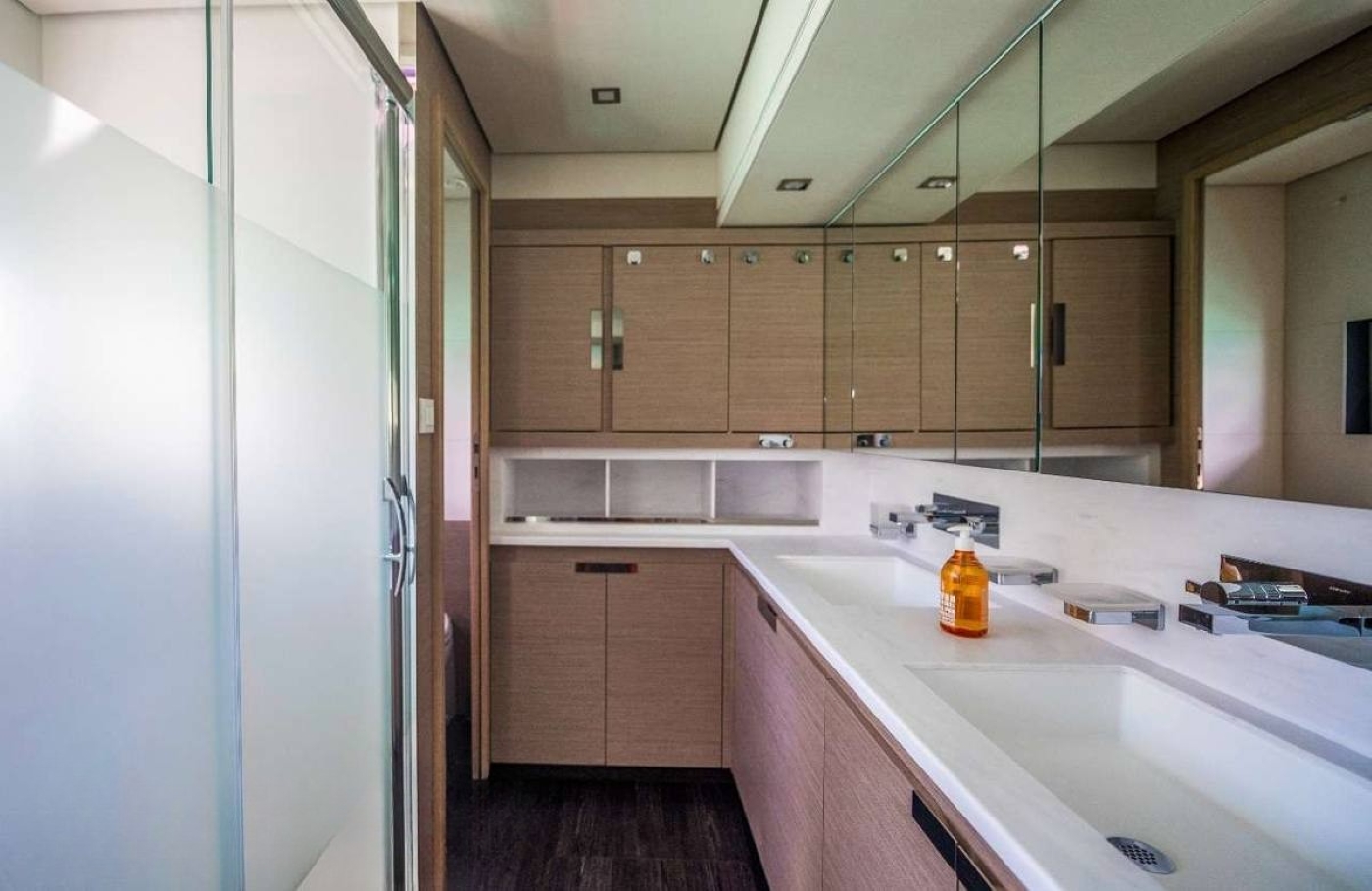 The clean contemporary lines of the interior blend dark wood with cream leather furniture and neutral finishes. The main salon utilises the wide beam with its open plan layout which places the galley and pantry to port and a flexible dining / lounge area to starboard. There is a technical navigation station forward to starboard and a door leading out to the foredeck. Plenty of light floods in thanks to the surrounding windows, but blinds can be lowered to shelter the space if needed.