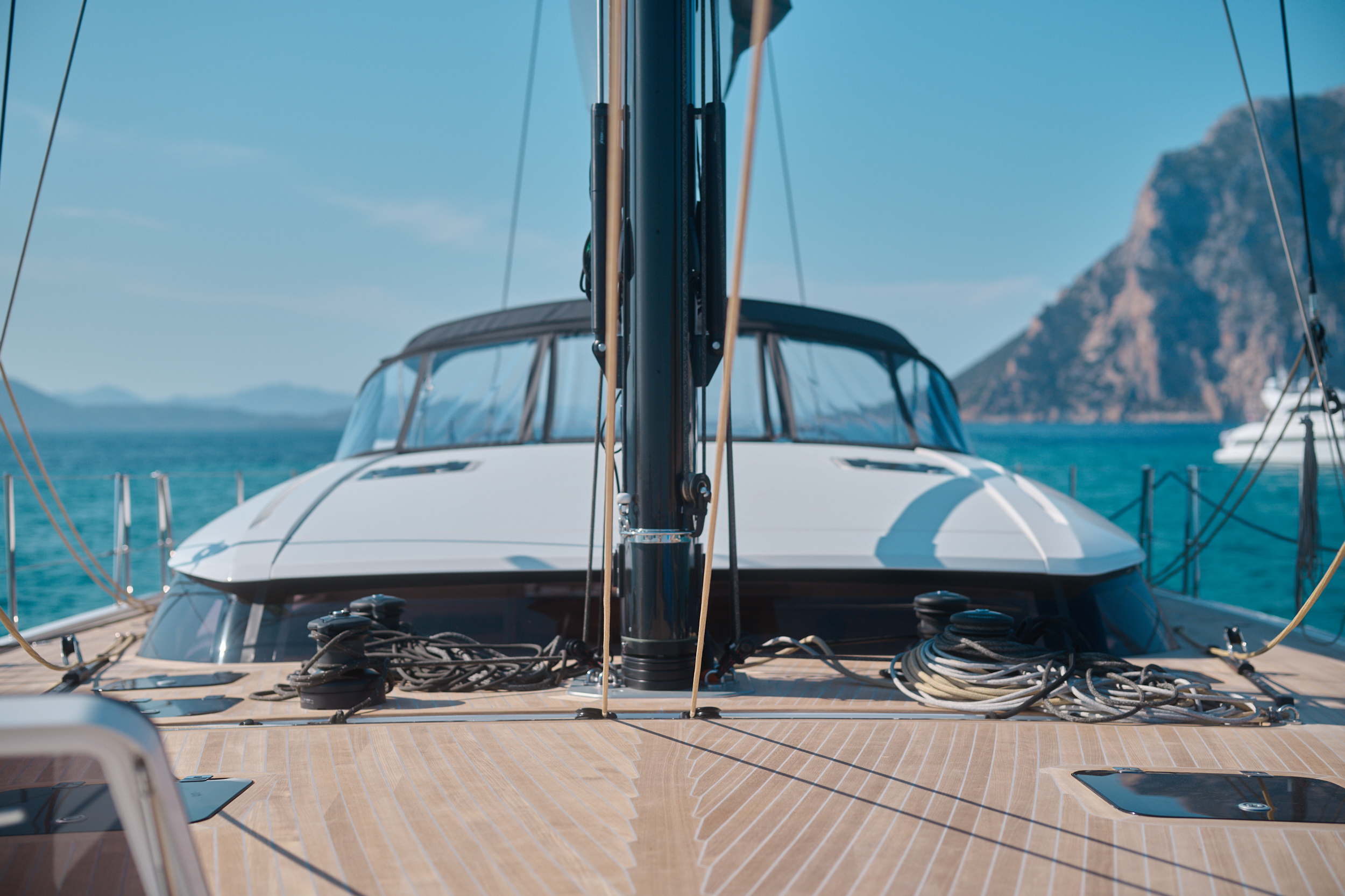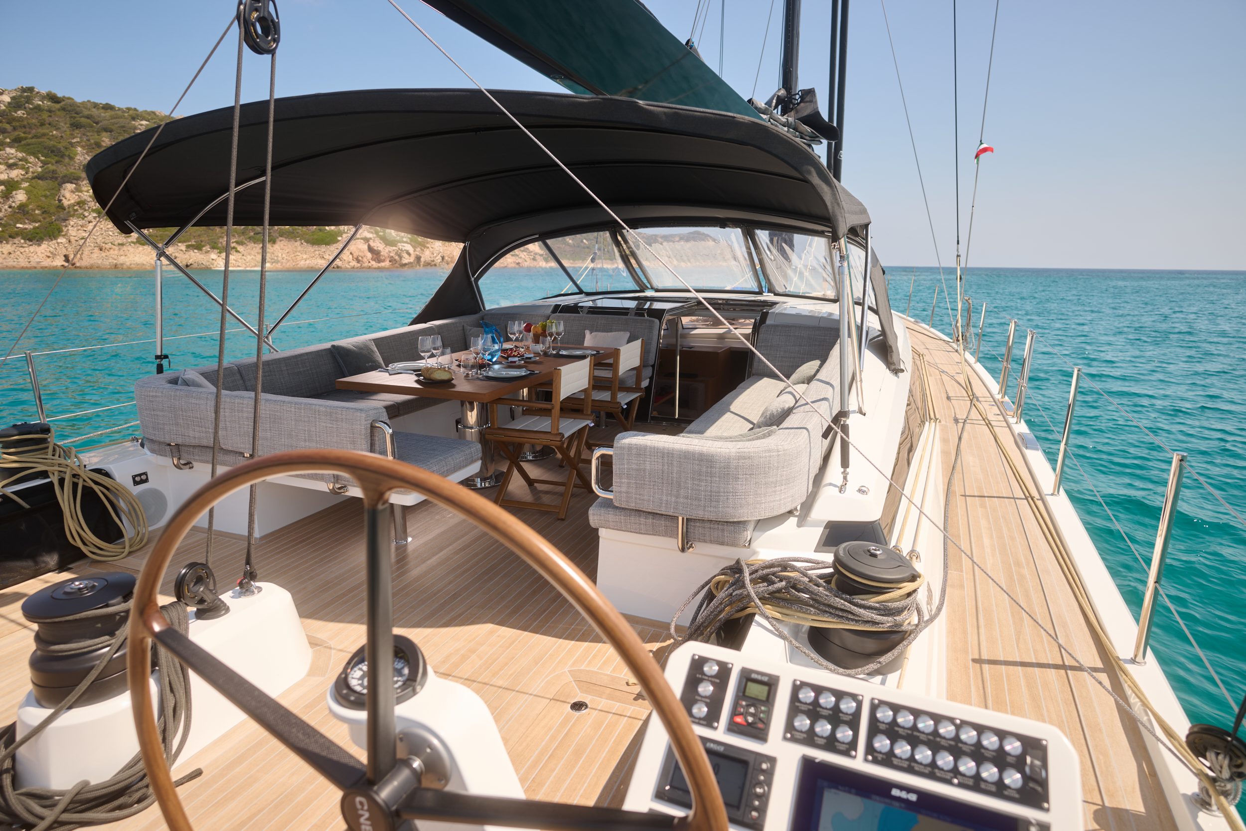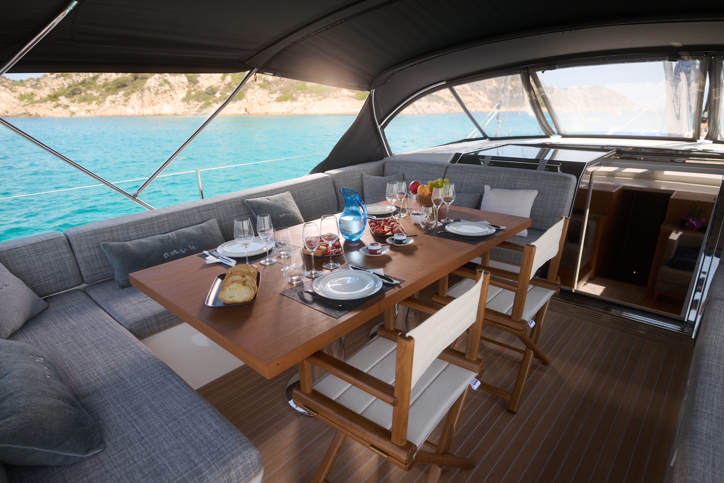 The flush decking creates ample exterior space for guests to sunbathe while the aft cockpit is perfect for socialising. The area is fitted with cushioned benches and a flexible table to port creates a dining setting which can be covered by a soft bimini for shade. Dual helm controls are to aft where steps also lead down to the swim platform. Central steps in the cockpit lead into the main salon.