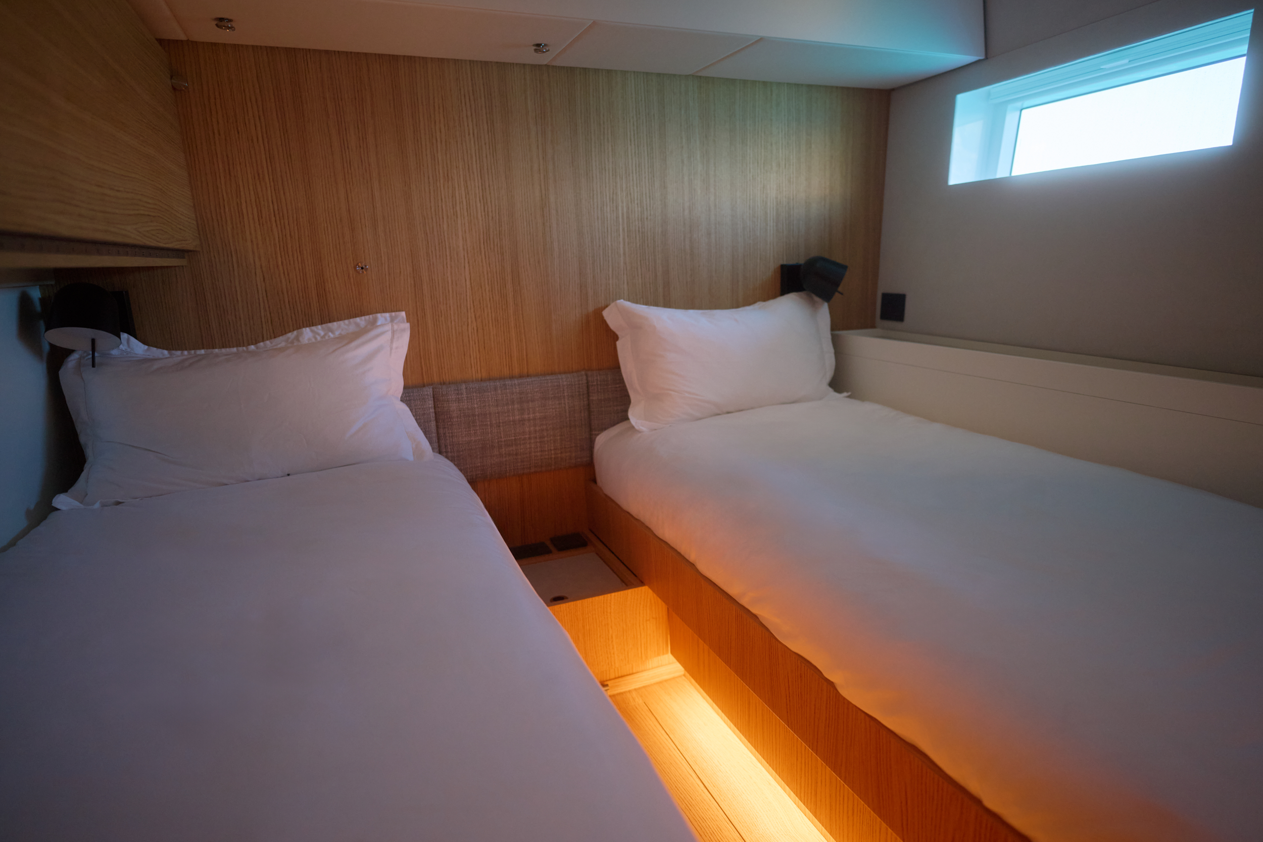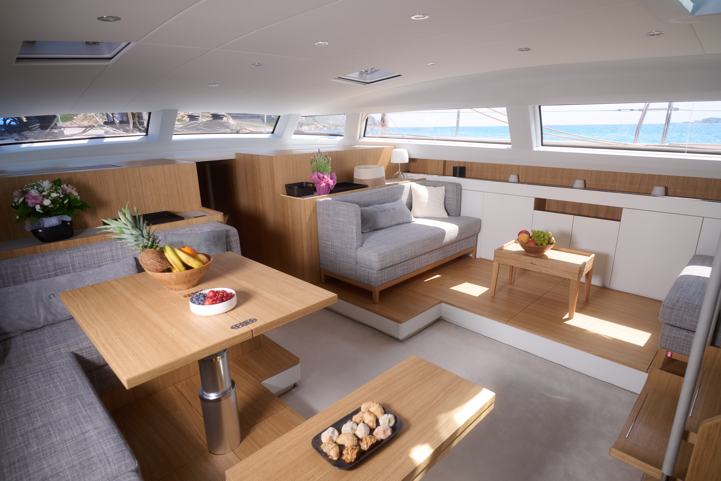 The modern interior benefits from lots of natural light from the skylights and high-level windows. The space is configured with fitted sofa seating with a cosy lounge area to starboard and a dining setting with flexible up / down tables to port. Blonde wood and neutral soft furnishings add to light atmosphere.
