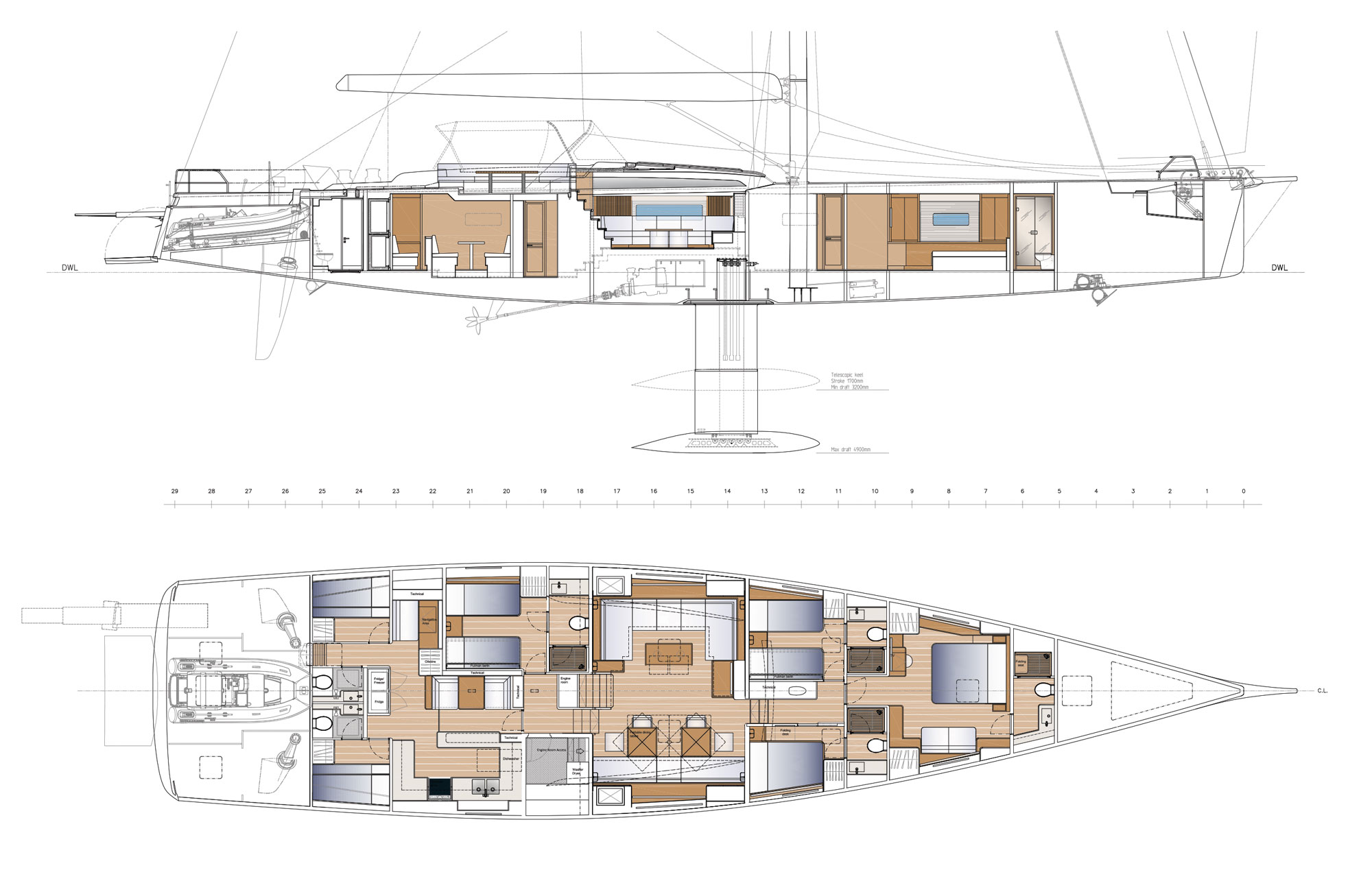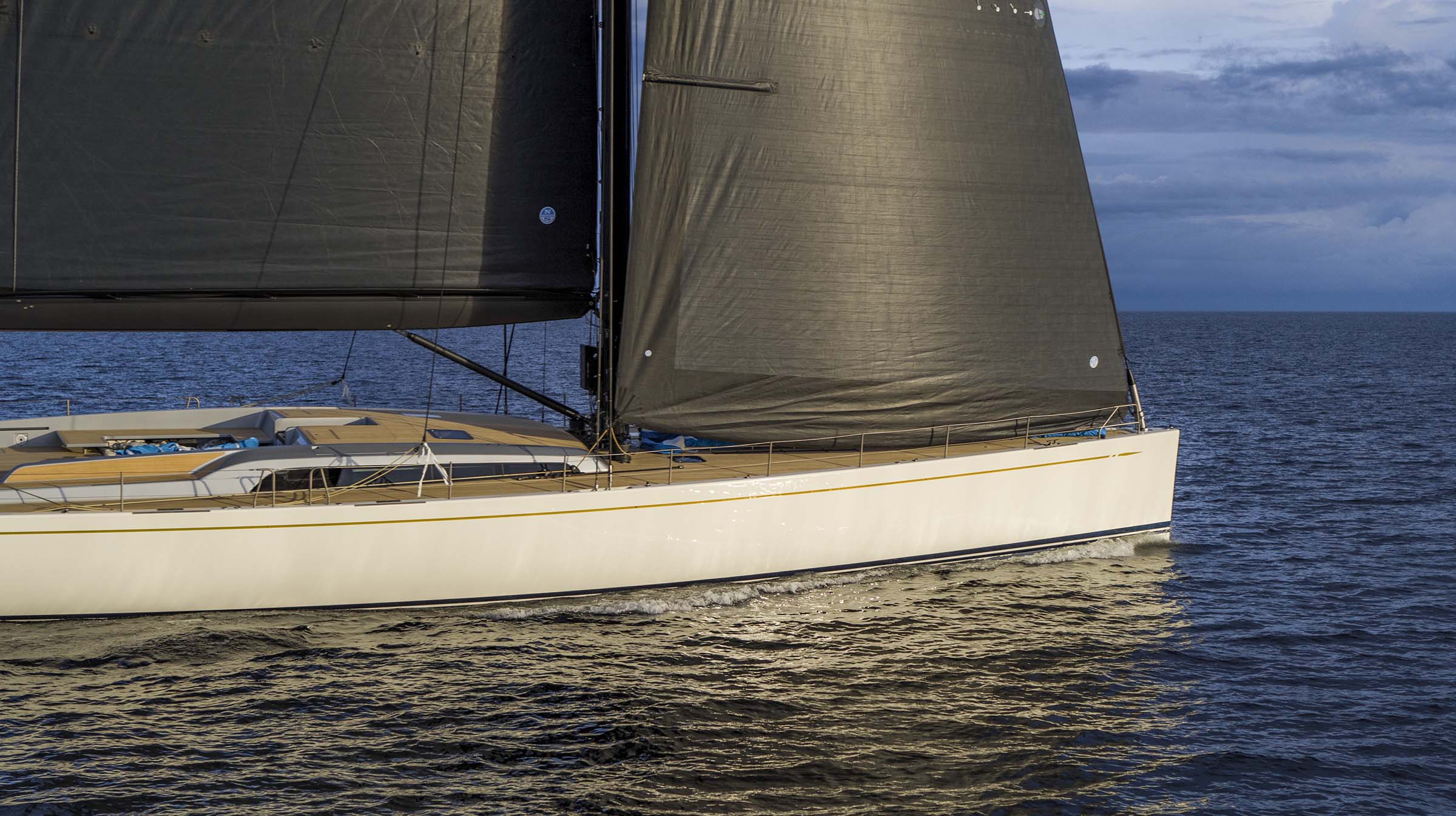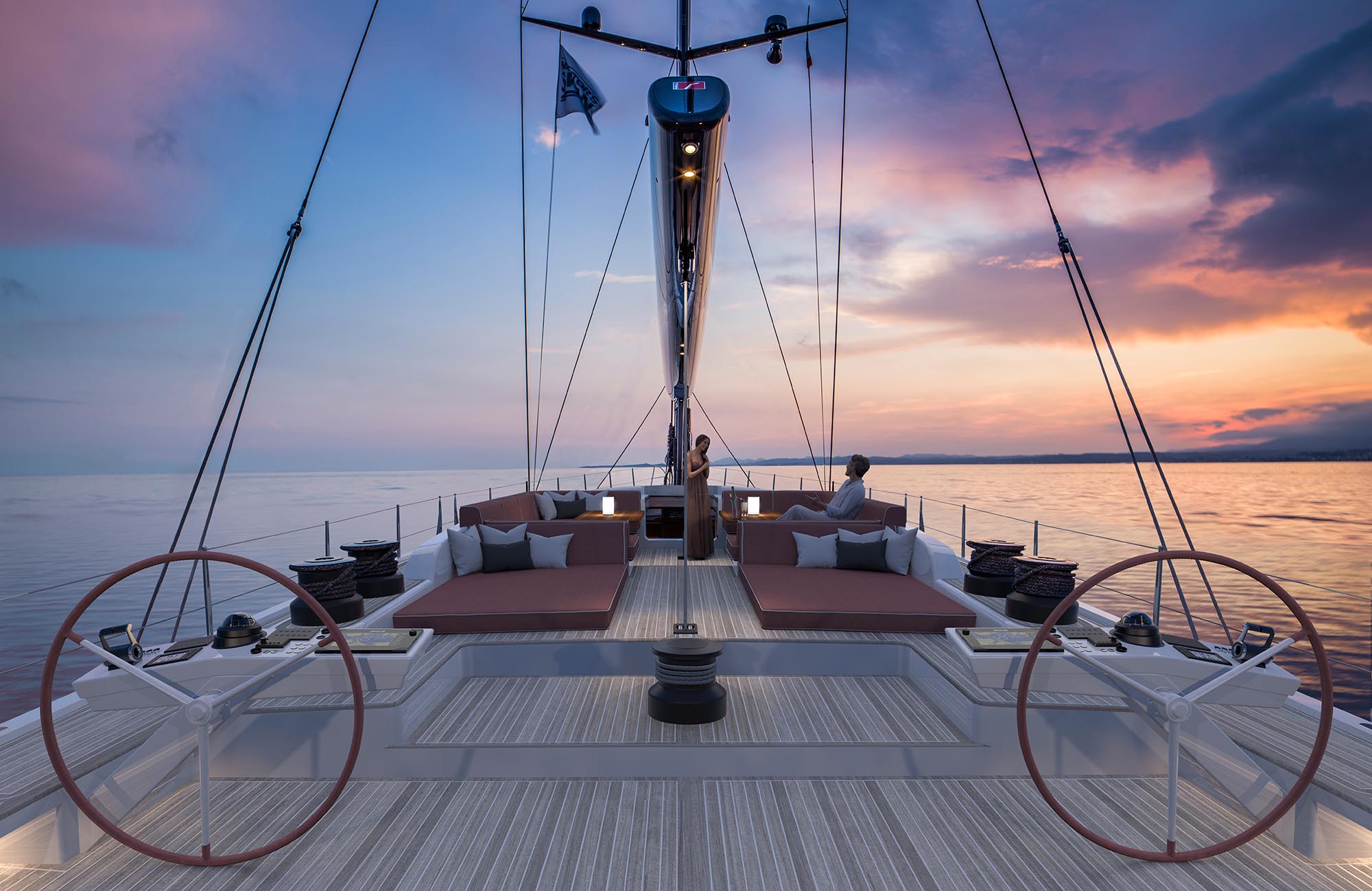 At the stern are the twin helm positions, from which the skipper manages all the sail handling thanks to the yacht’s genuine pushbutton sailing build.