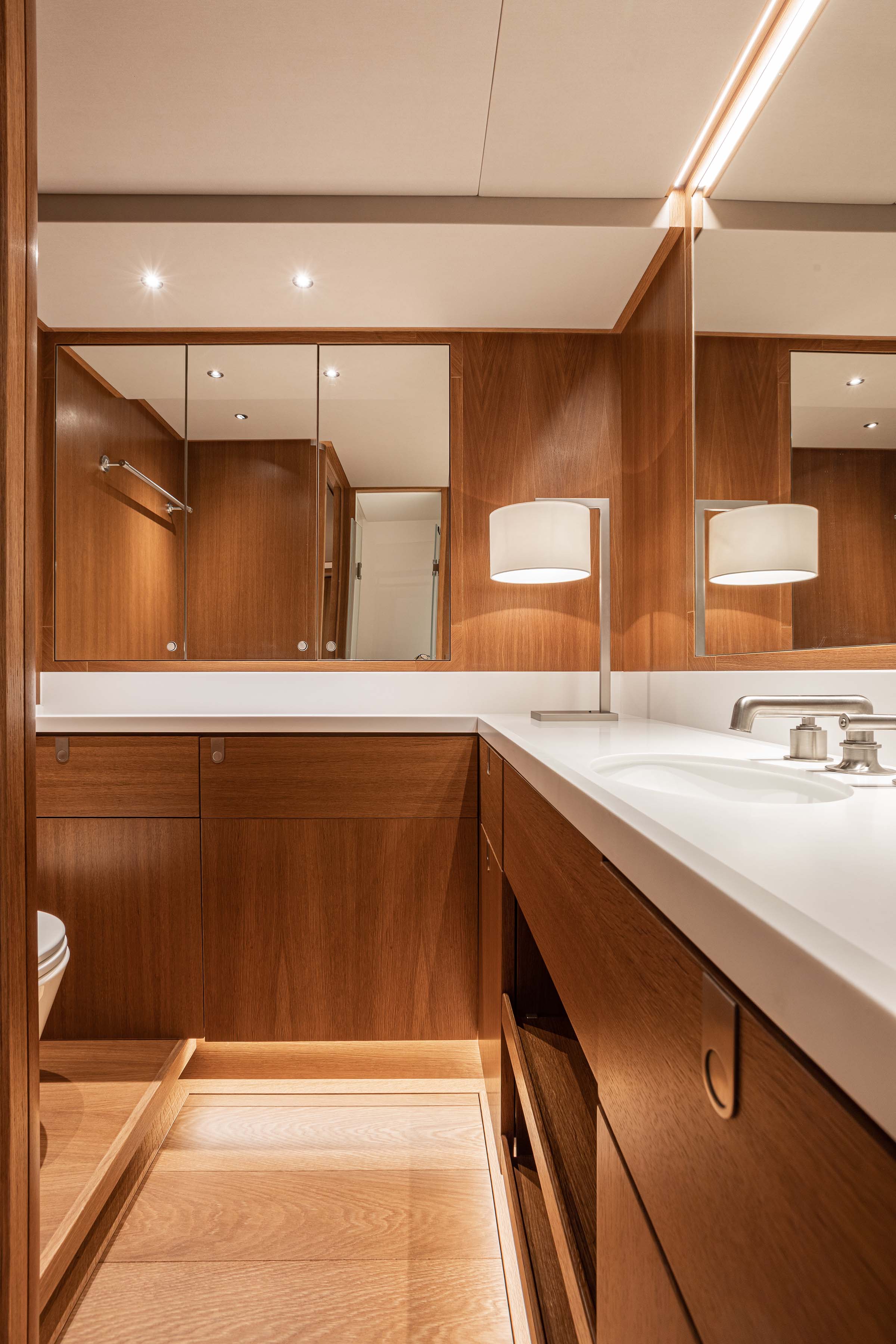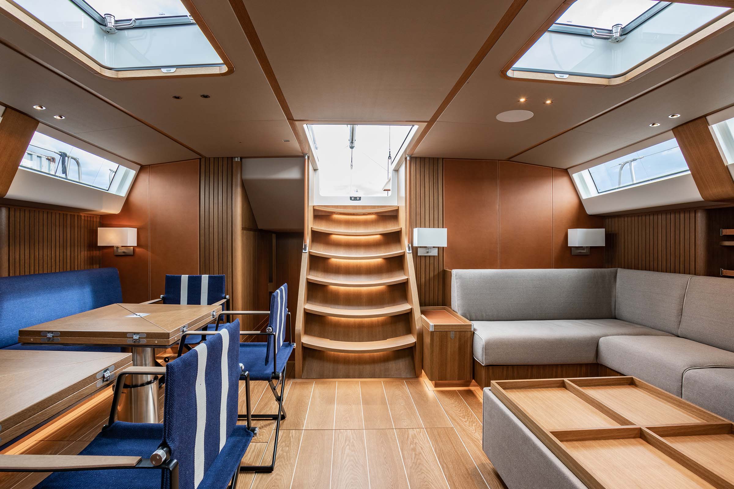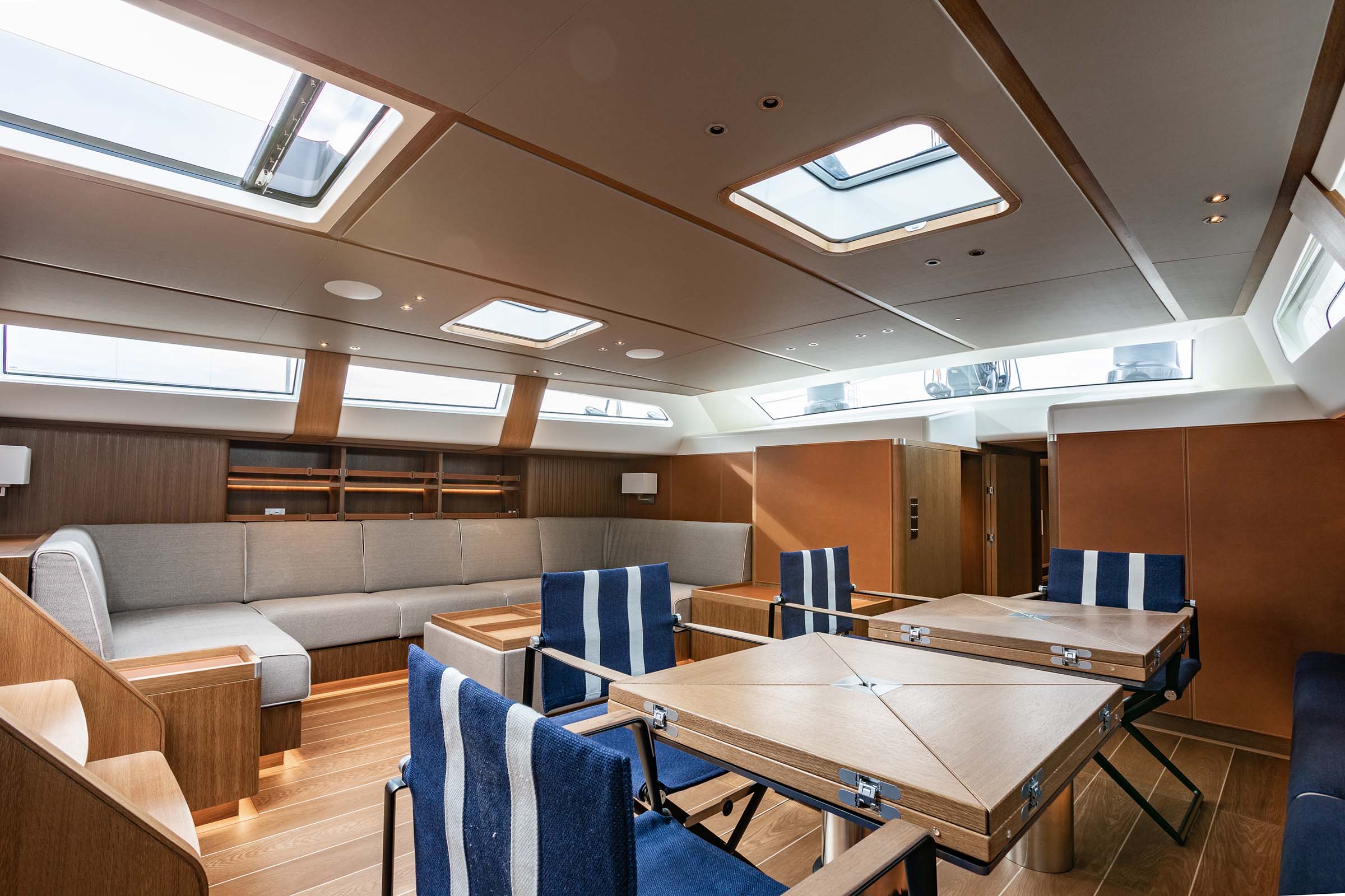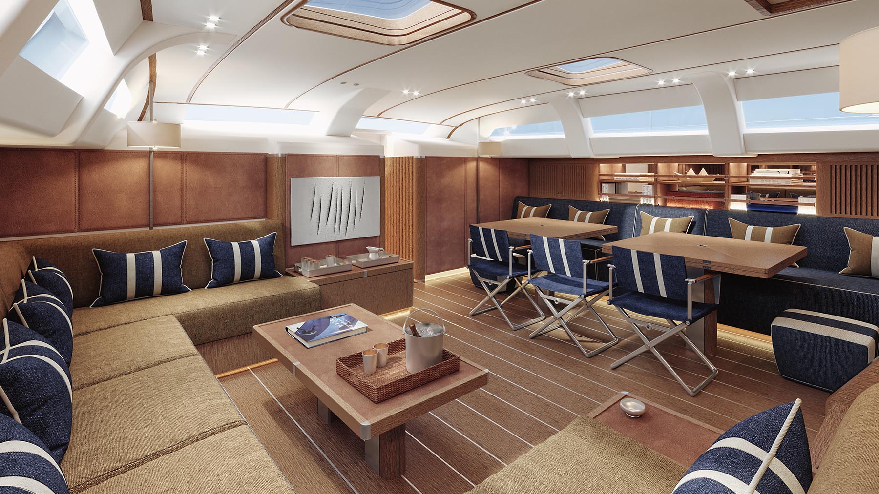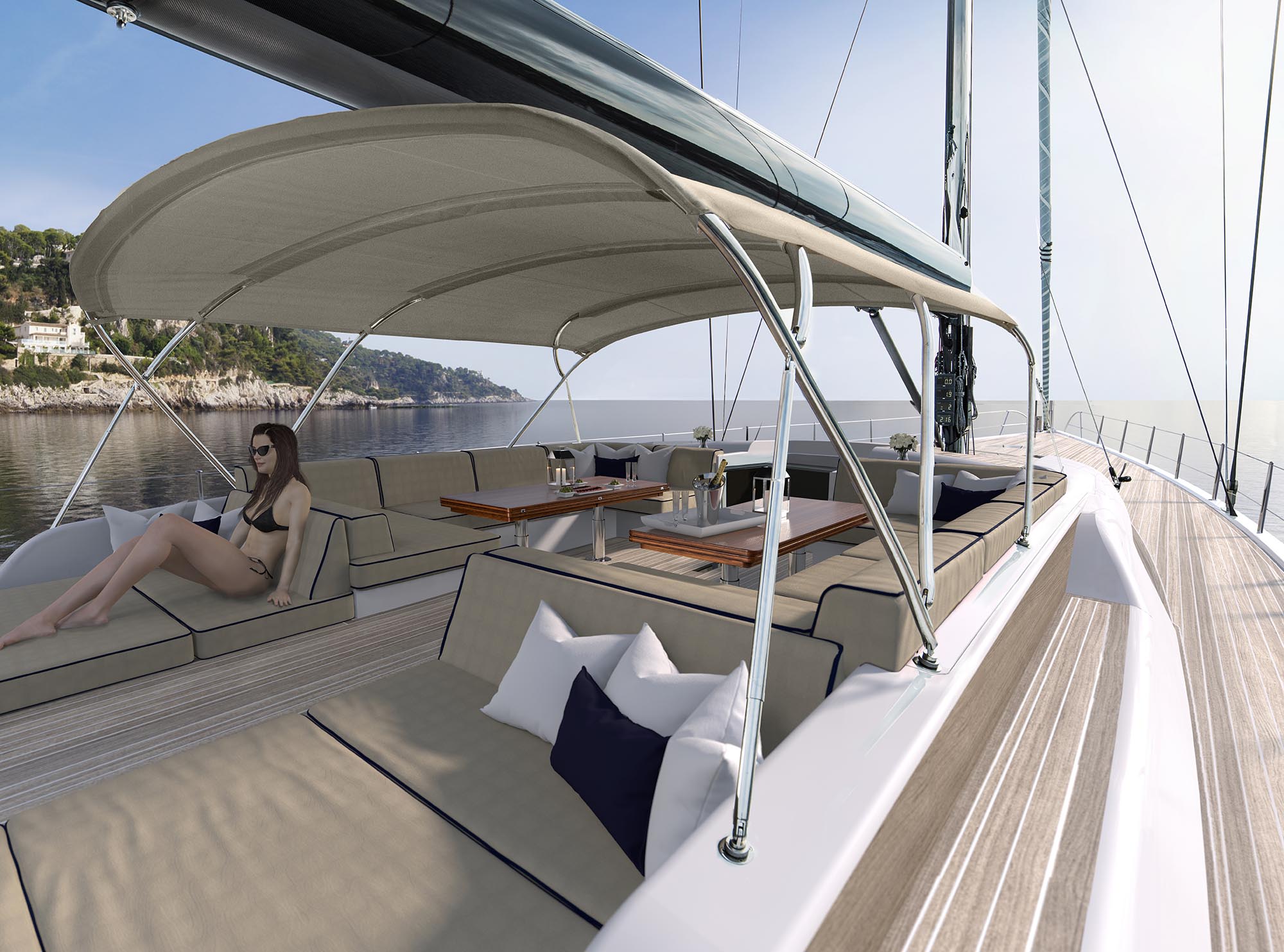 The strong, clean lines and neutral colors of the yacht give her an elegant, sleek look. Built with both racing and cruising in mind, the deck provides dual-purpose spaces that are efficient for sailing as well as extremely comfortable for resting and relaxing. While at anchor, the spacious fore sun deck provides the perfect spot for soaking in the sun and sights. While cruising, the space has ample room for sail handling.