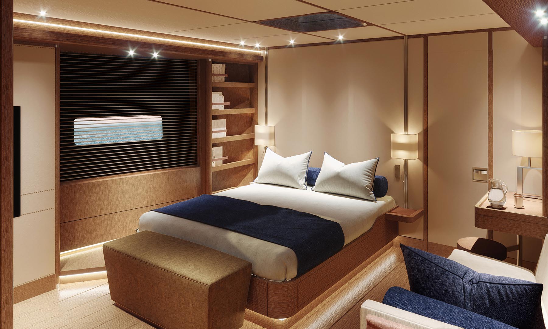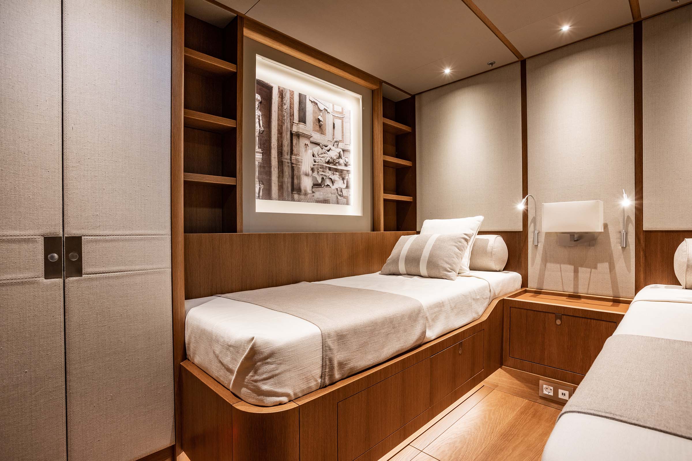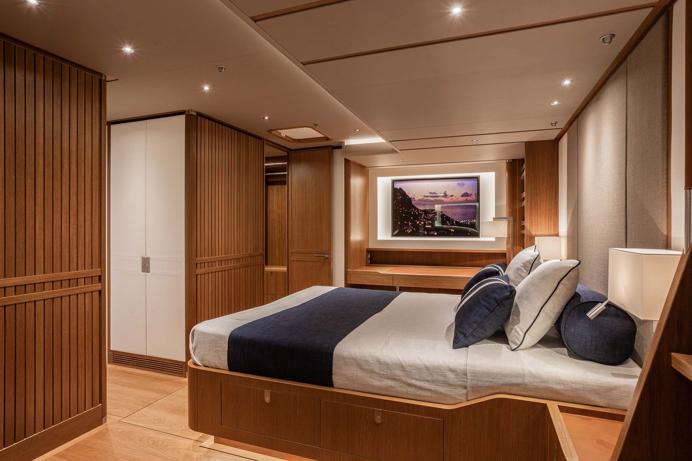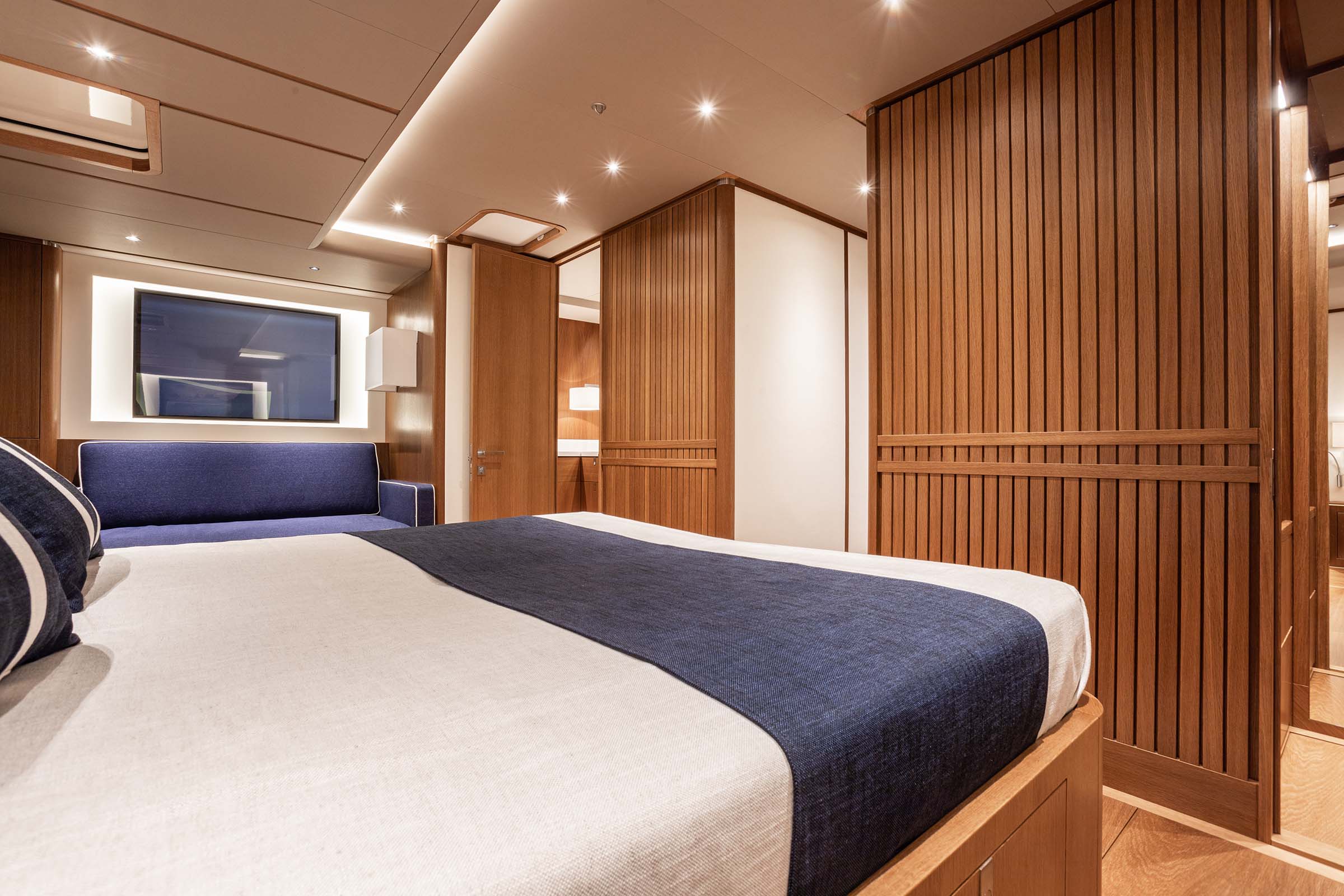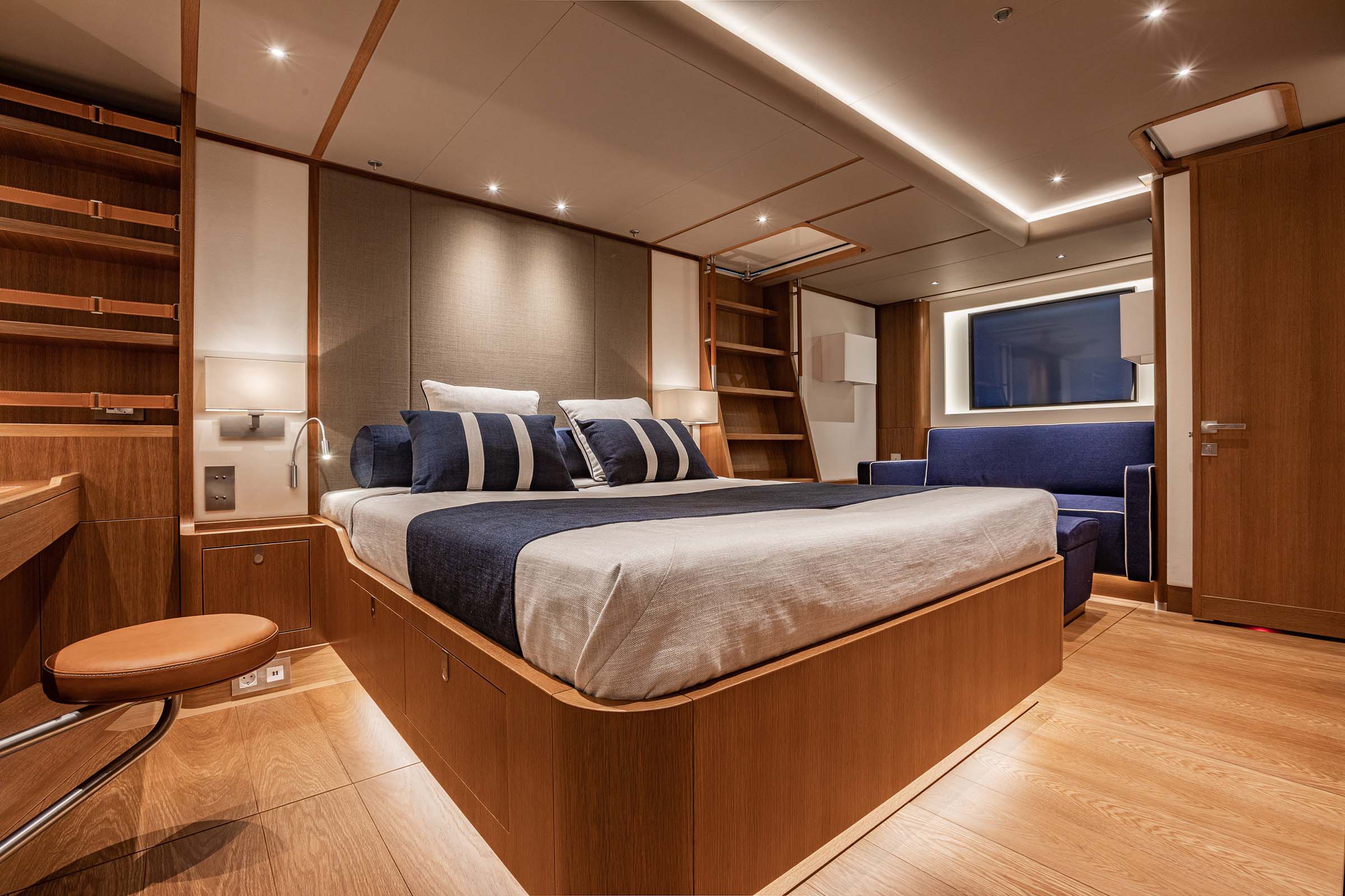 The accommodation sleeps up to 6 guests over 3 en-suite cabins consisting of 1 Owners cabin, 1 double cabin, and 1 twin cabin. The owner cabin is placed forward at the bow, and features the same elegant décor of the rest of this beautiful yacht. The cabin features a large bed, with a desk/vanity area to port, and a couch seating area complete with ottoman on the starboard side. There is ample storage, with two wardrobes plus variety of shelves and cupboards, including under bed storage. Well-proportioned windows and skylights ensure plenty of natural light. The cabin comes complete with its own ensuite, which features sink and mirror area, shower and toilet. Aft of the Owners cabin are the two remaining guest cabins, which consist of a double and a twin, allowing accommodation for a variety of family unit and friend groups. Both these cabins feature wardrobes, ensuite bathrooms, and windows for natural light and enjoying the views. The professional crew of 4 will ensure guests enjoy a smooth and safe stay while on board.