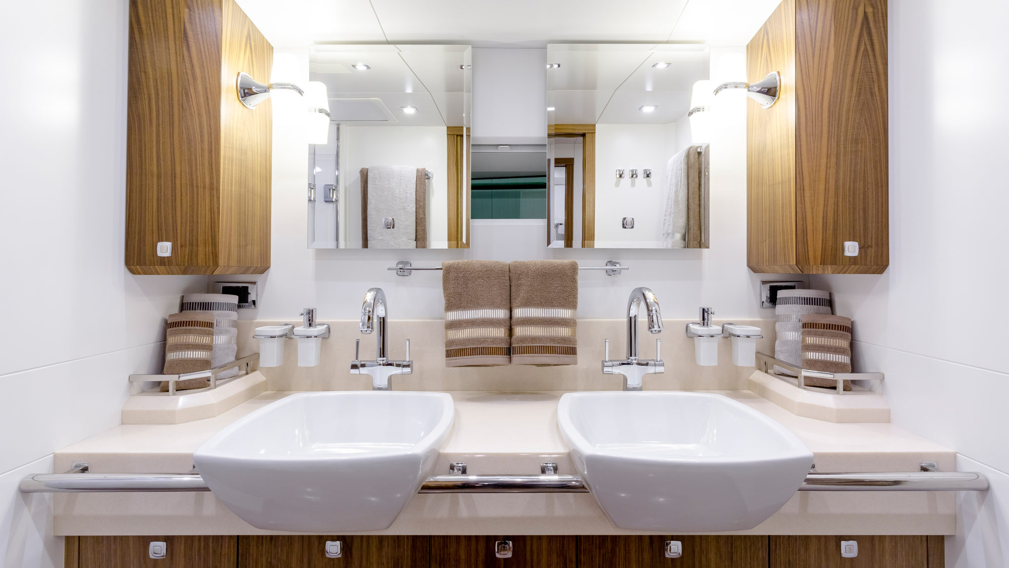There are three guest suites which can accommodate up to six guests. The master suite is forward and features plenty of storage space and a deluxe ensuite with separate ensuite head and bathroom. A flexible double/twin suite is to starboard while a bunk cabin is aft to port – both with ensuite bathrooms.