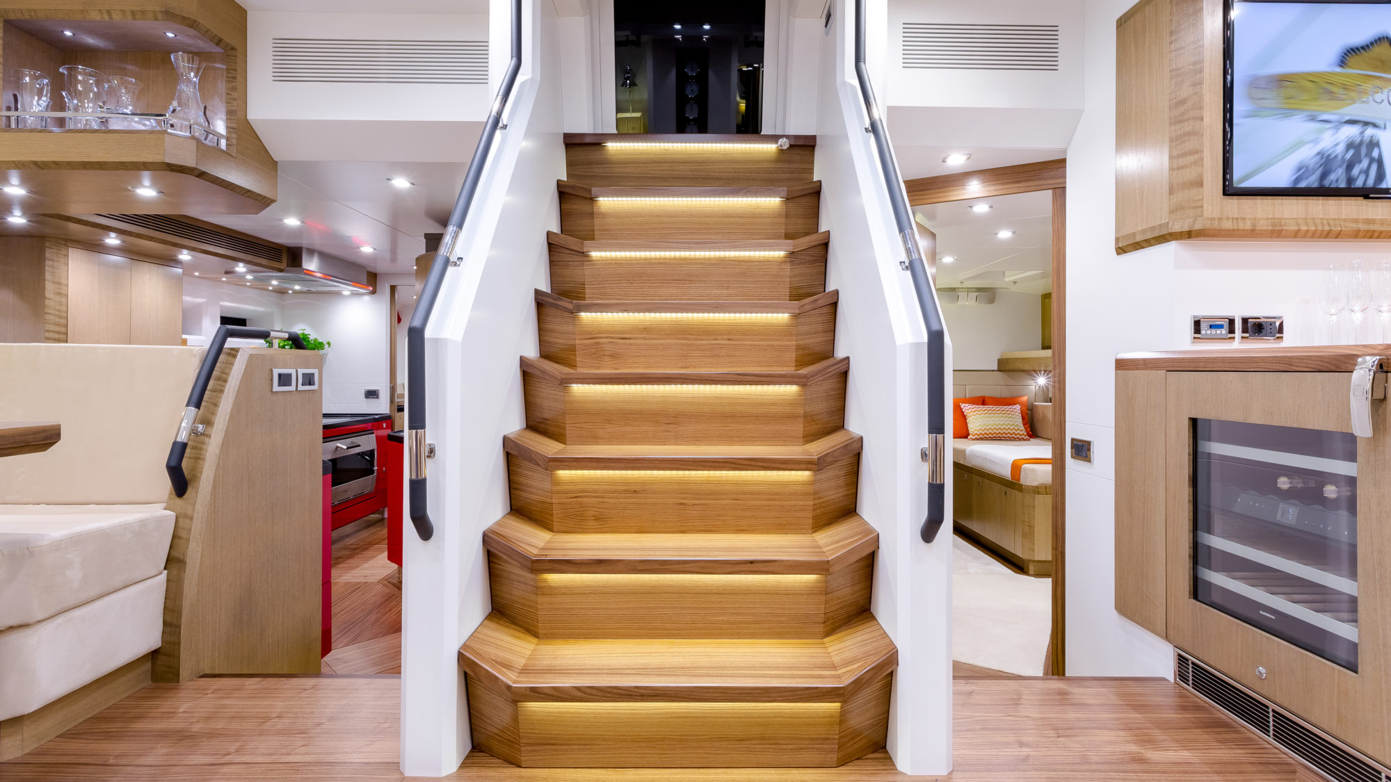 The flush deck offers plenty of space for guests to sunbathe when at anchor and an expansive cockpit area with two u-shaped sofas and adjustable tables. Dual helm controls are aft and there is also a lovely water’s edge swim platform.