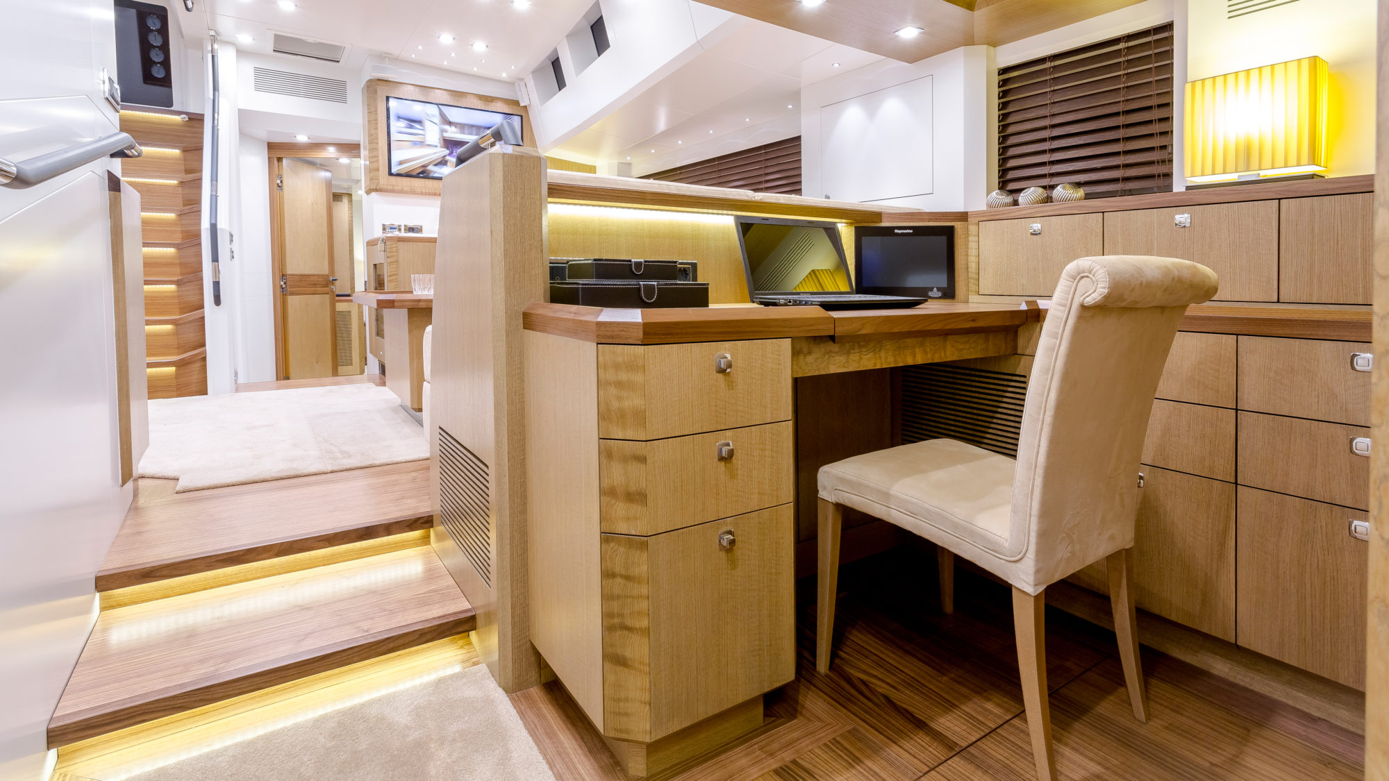 The light and elegant interior provides guests with a sociable main salon with a generous dining setting and separate lounge space. The dining area has a built-in u-shaped sofa and chairs surrounding the table while the lounge is a cosy space with built-in seating and a coffee table. Just forward of the main salon is a semi-separate office space while the galley is aft to starboard and leads into the crew space.