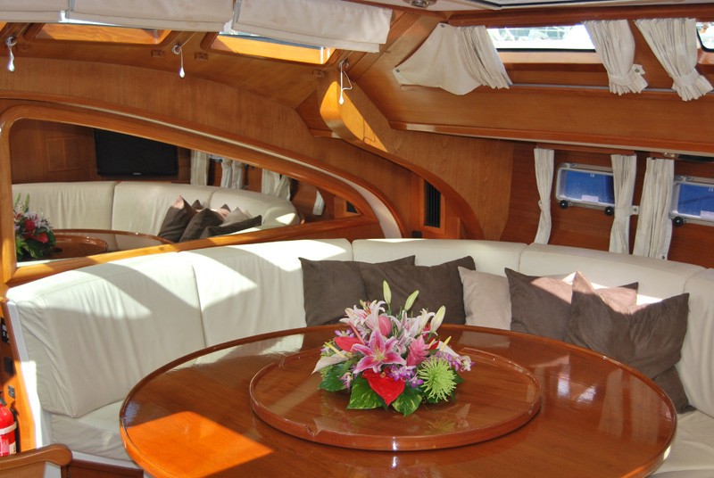 Charter Yacht COCONUT has a fully air-conditioned light an airy interior with warm toned gloss woods throughout. The salon is raised giving the space the added benefit of ample natural light through large windows and hatches. A formal dining table with a custom lazy Suzan and plush leather seating is featured on the starboard side with a flat screen TV and entertainment system, to port sits a smaller booth style table.