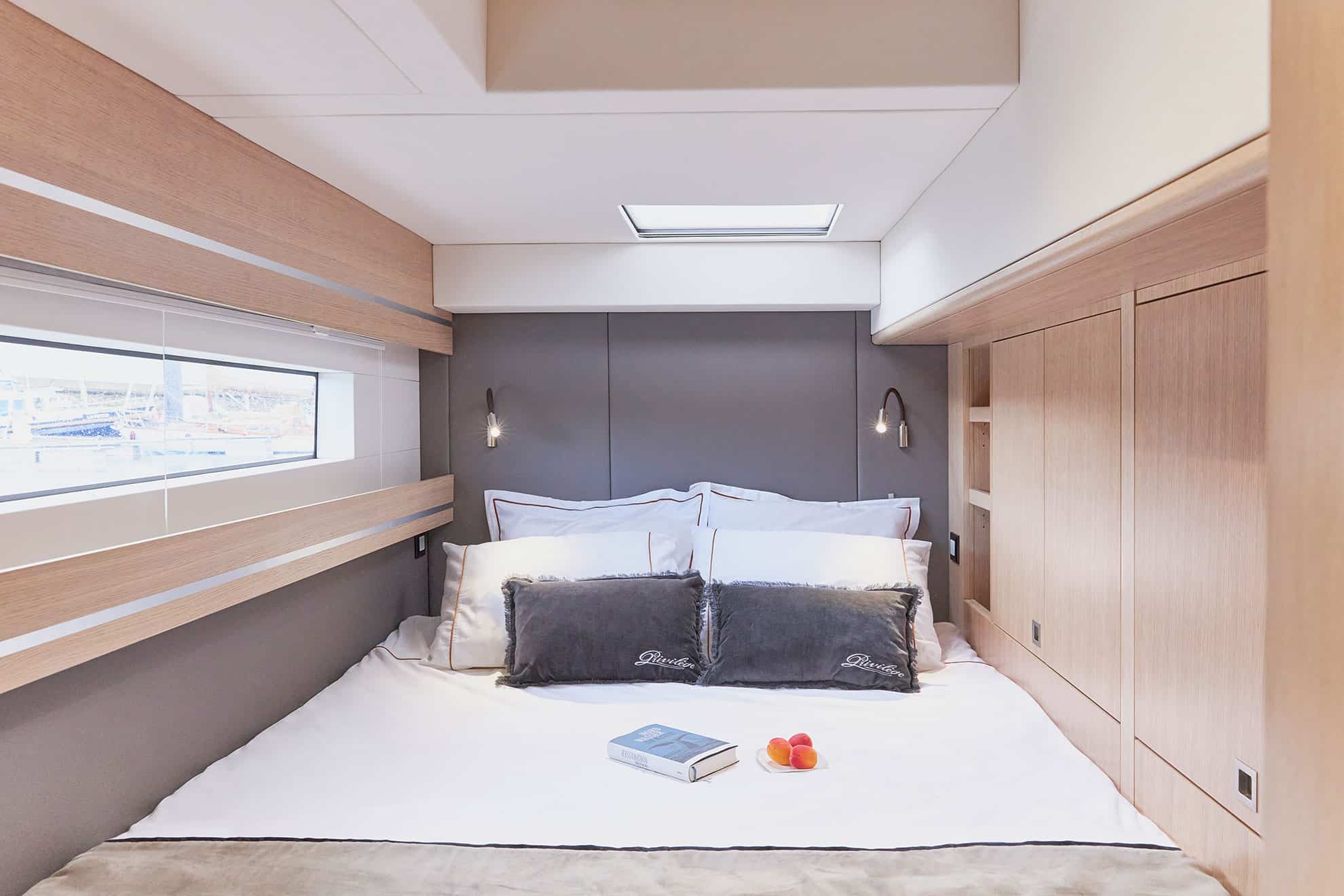 This compact yet spacious catamaran offers a generous sheltered aft cockpit which includes a corner dining setting with a flexible folding table, long sofa and steps down to the water’s edge. There are ladder steps up to the pilot house which benefits from a hard roof.