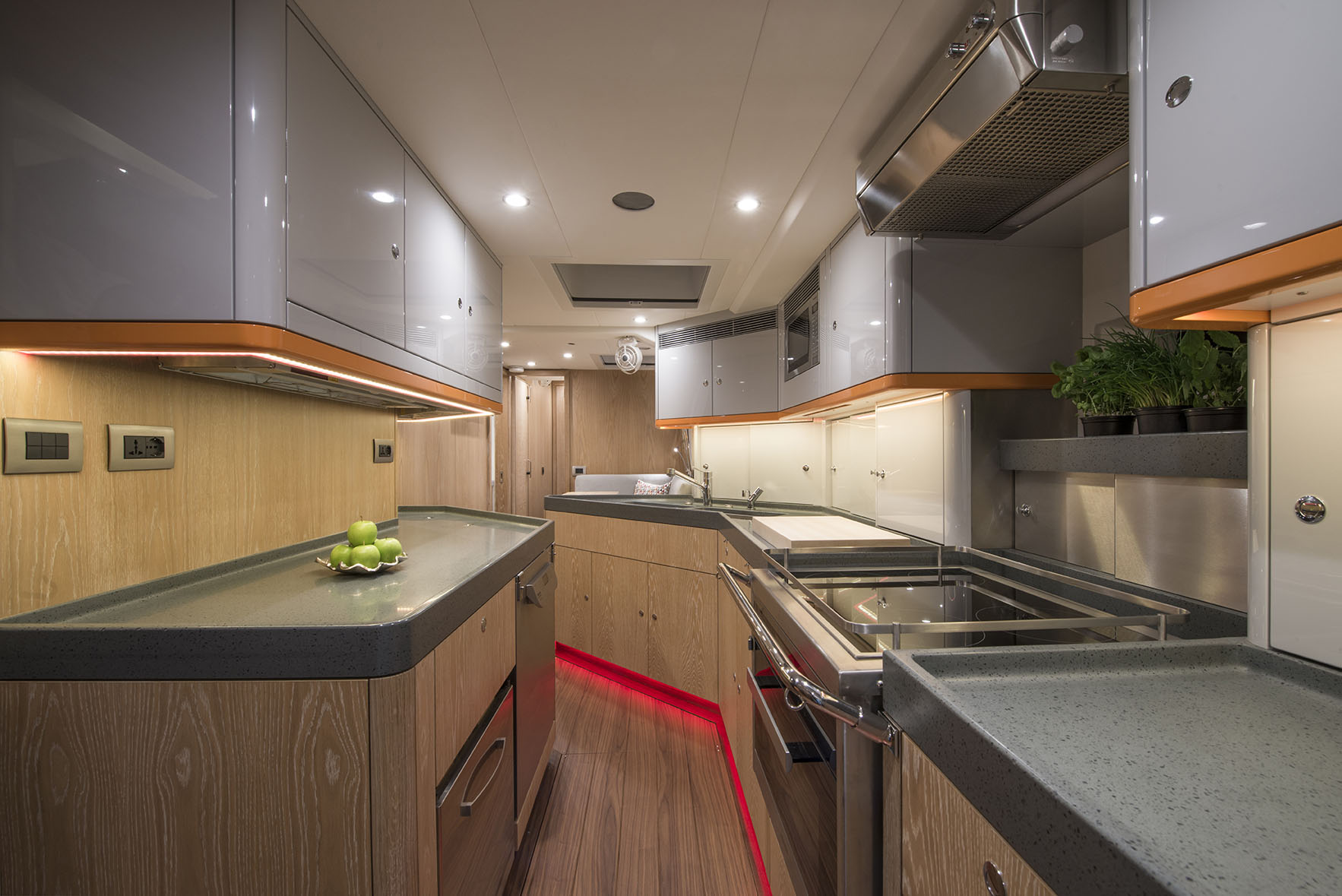 The yachts hull is sleek and powerful, in addition, she boasts a performance rig and sailing package, allowing her to participate in ambitious Superyacht Regattas.