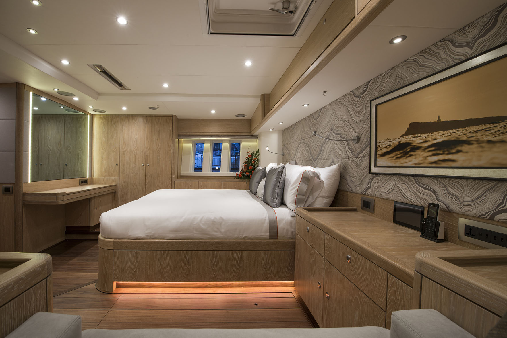 Accommodation is provided in 3 guest cabins. The master stateroom is aft of the yacht, with a full beam layout, double bed and sofa. Two guest cabins each offer double beds and are on port and starboard of the yacht. One mid cabin is available upon request and is suitable for 1 adult or 2 children.