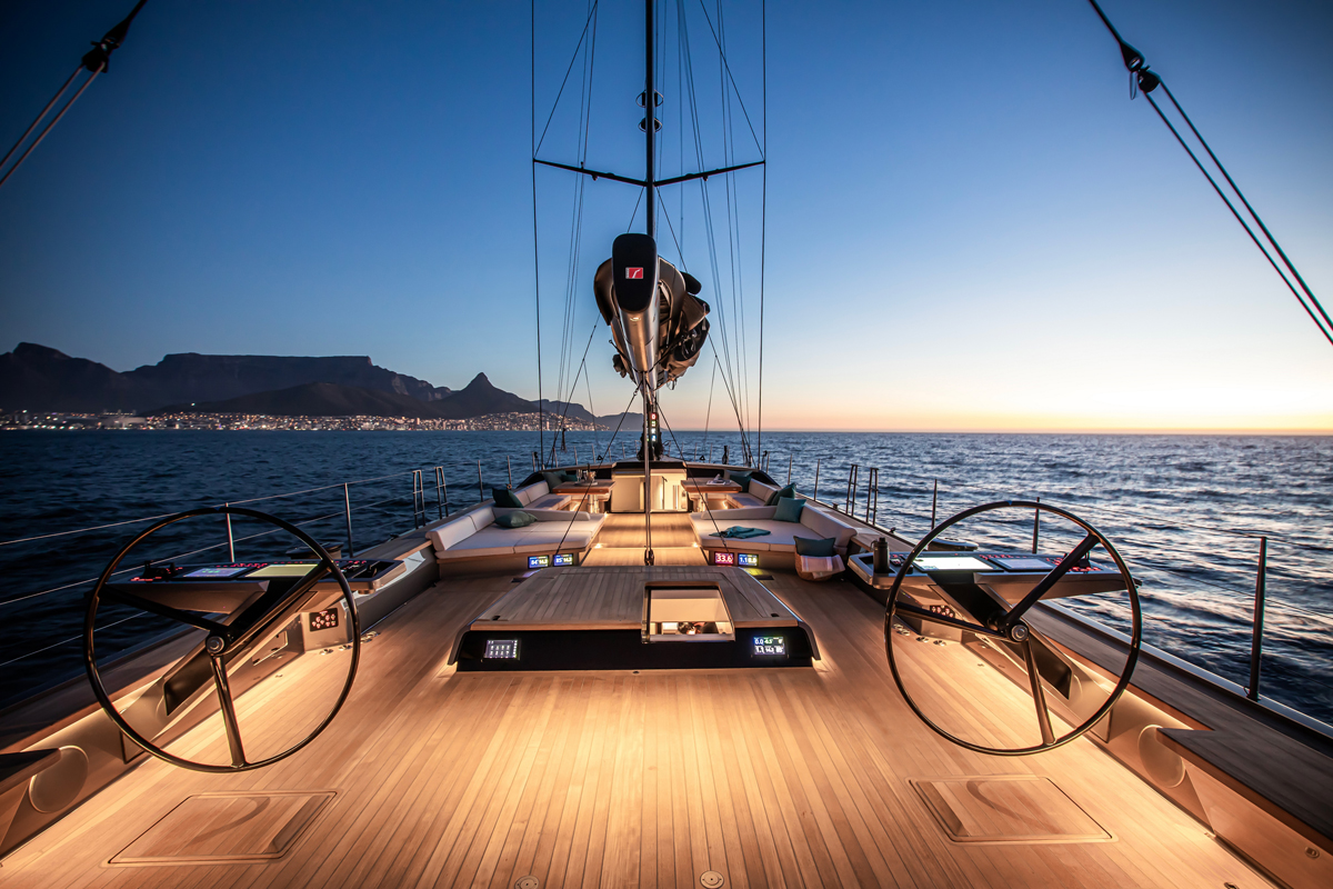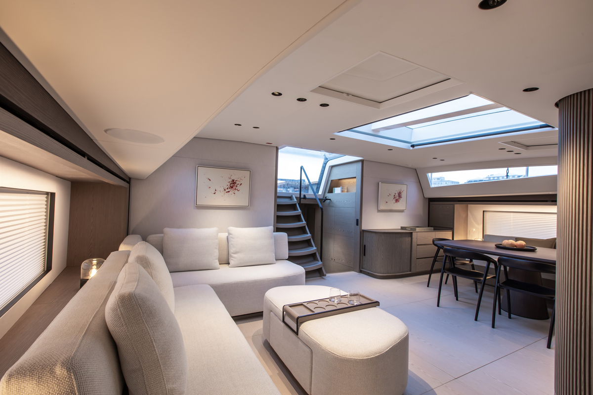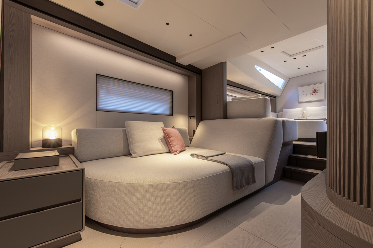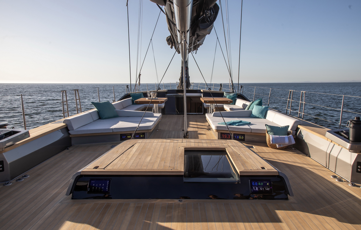 Her flush deck and low pilot house create a contemporary look from every angle with the defining detail being the z-shaped composite coaming o the deckhouse with appears like a stylised lightening bolt. The cockpit appears like a continuous flow of teak but clever built in banquette seating can be made comfortable with the addition of cushion pads. Dual helm controls to aft have plenty of space for the crew to convene. The foredeck is open and can be used for sunbathing if required.