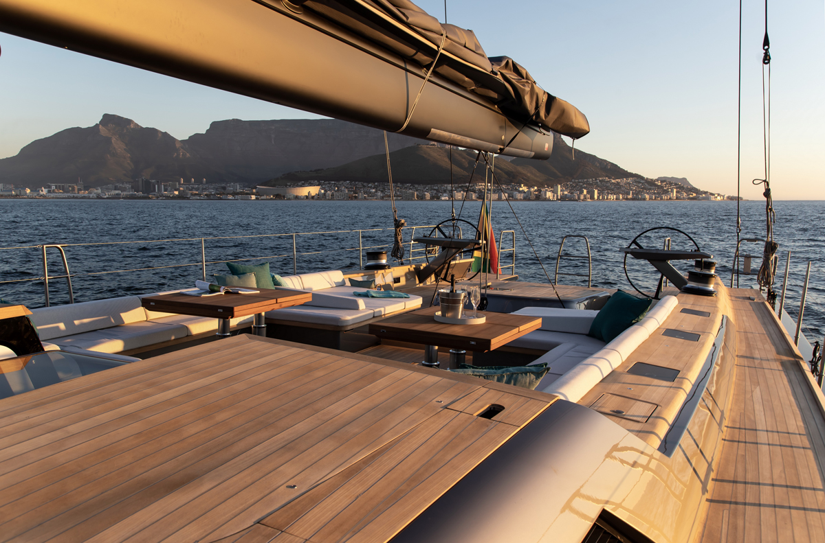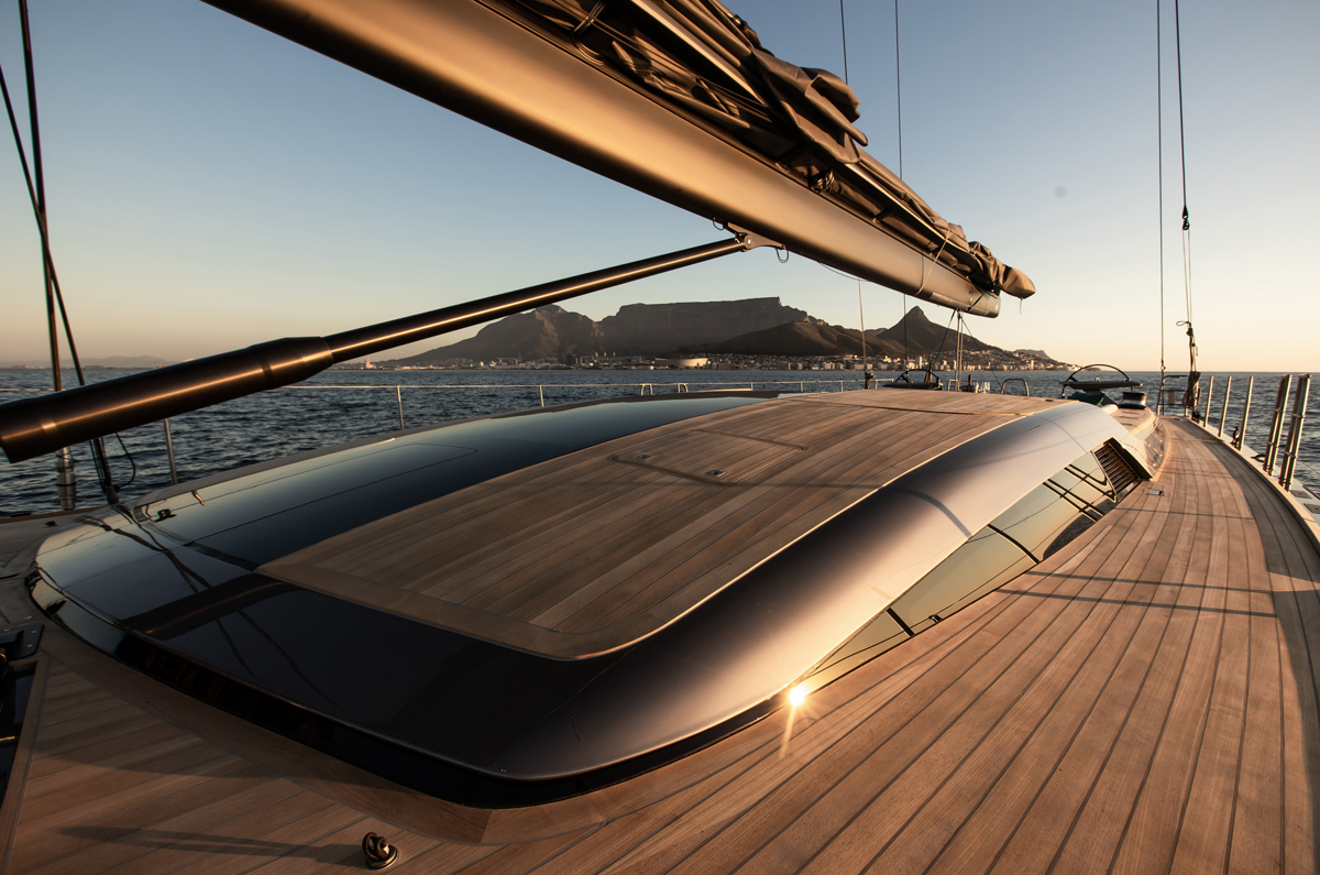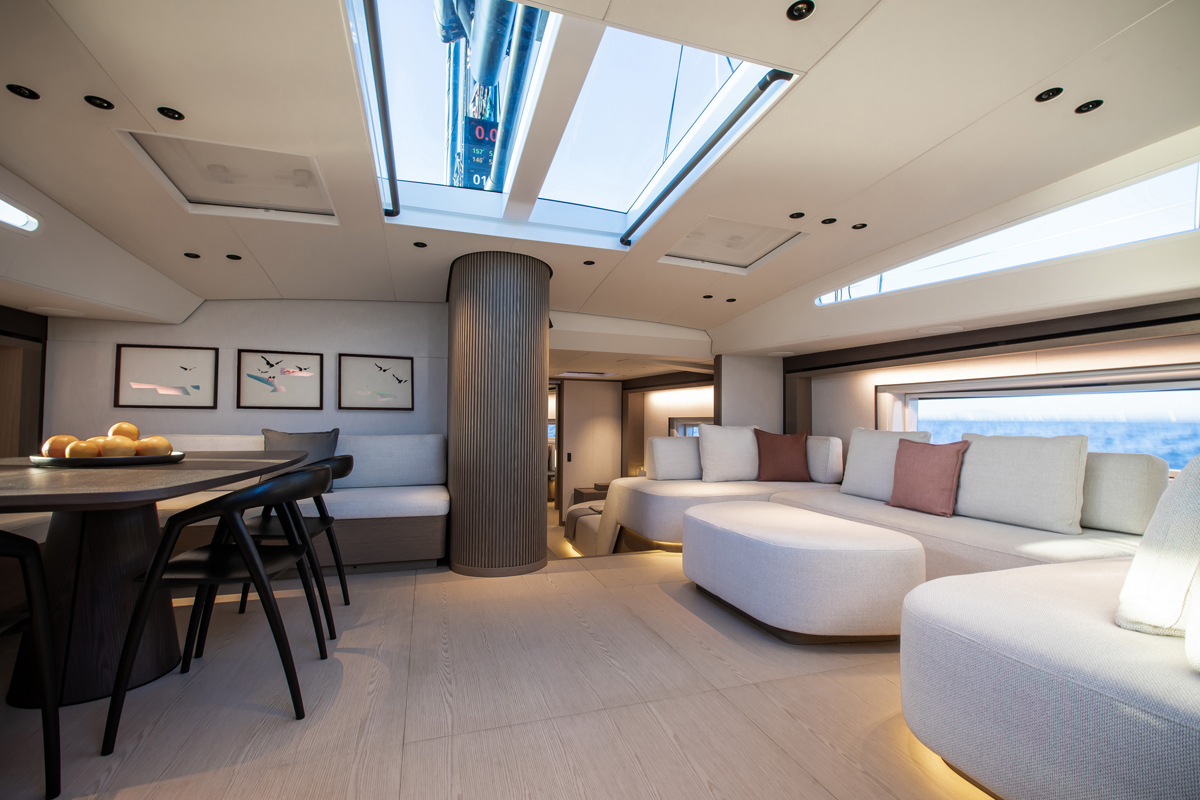 Her flush deck and low pilot house create a contemporary look from every angle with the defining detail being the z-shaped composite coaming o the deckhouse with appears like a stylised lightening bolt. The cockpit appears like a continuous flow of teak but clever built in banquette seating can be made comfortable with the addition of cushion pads. Dual helm controls to aft have plenty of space for the crew to convene. The foredeck is open and can be used for sunbathing if required.