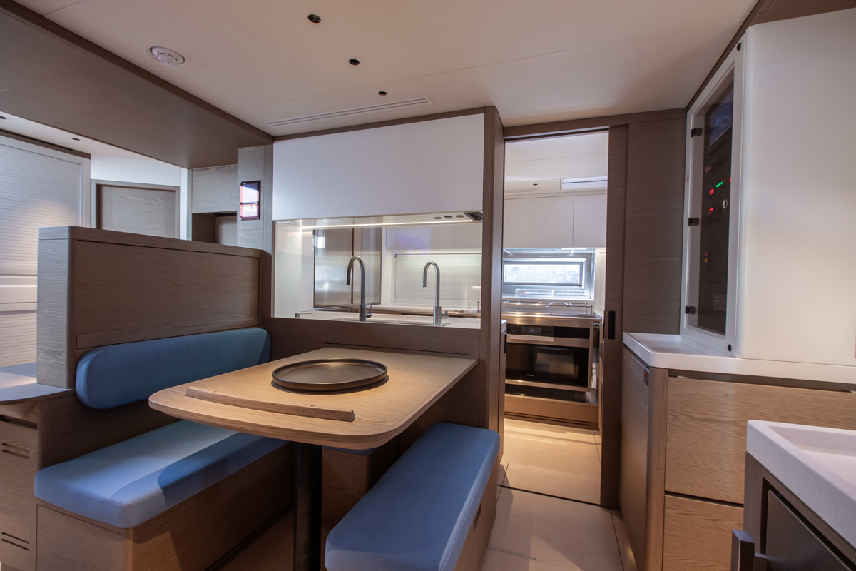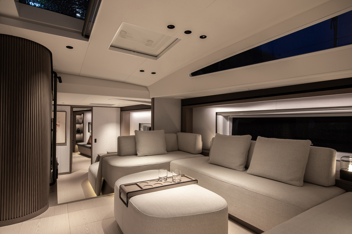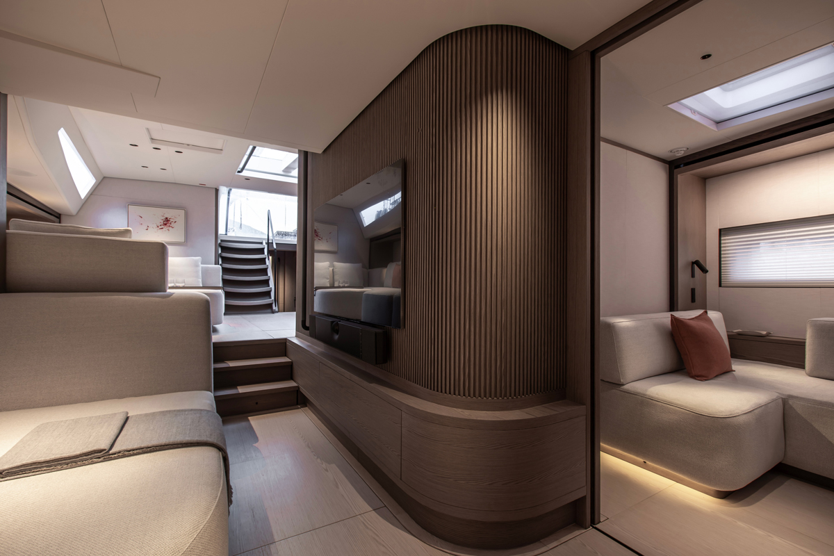 The four-cabin layout sees the master suite forward and three guest suites aft. All the cabins benefit from the luxury and privacy of ensuite bathroom facilities finished to the highest standard with contemporary stain-black hardware and accessories.