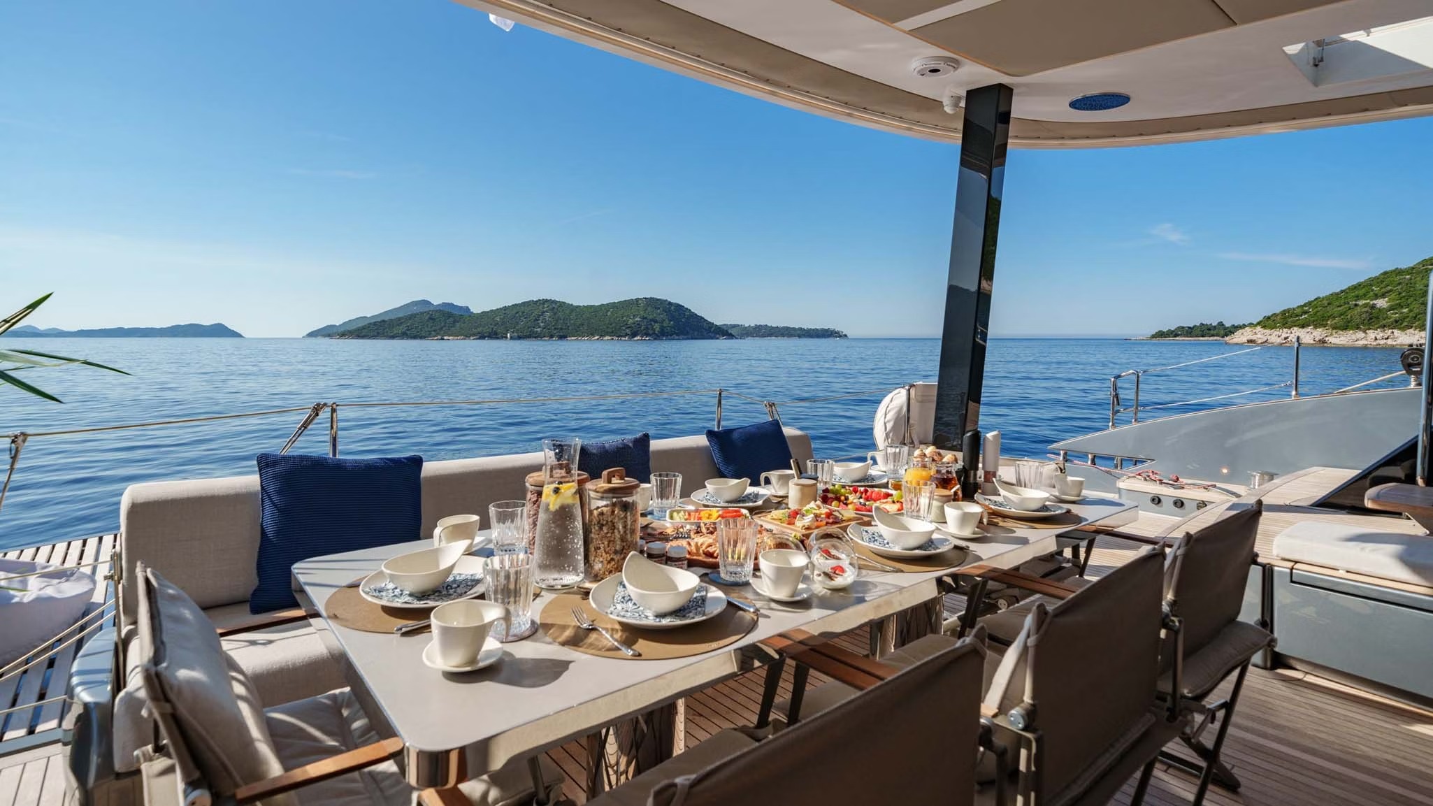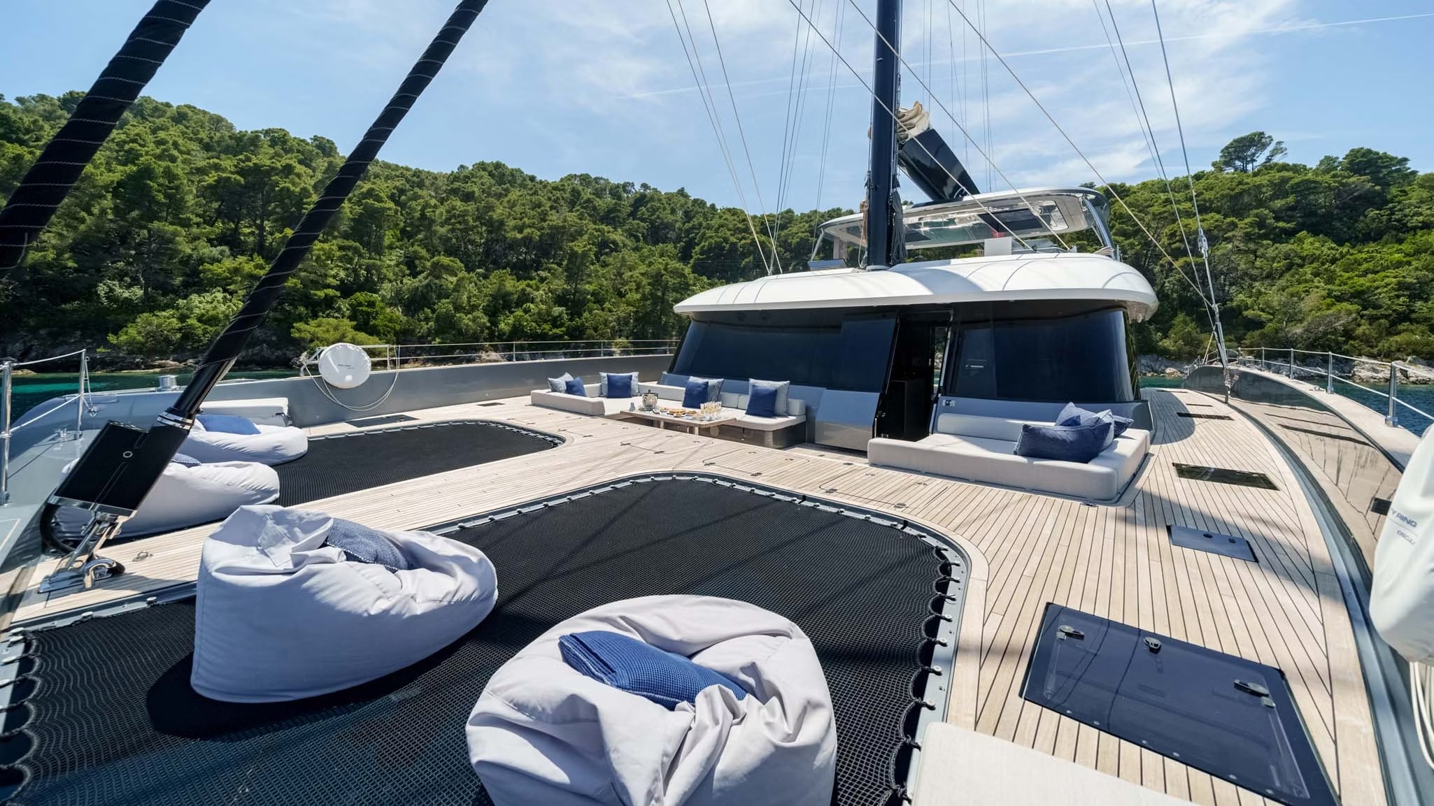 The bow benefits from a cosy lounge, well shielded from sun and wind. There are also two forward trampolines with views out to sea. To aft, the main salon merges with the generous cockpit which is further extended by a large transom platform. The cockpit is configured with an al fresco dining table, bar and sun pads.