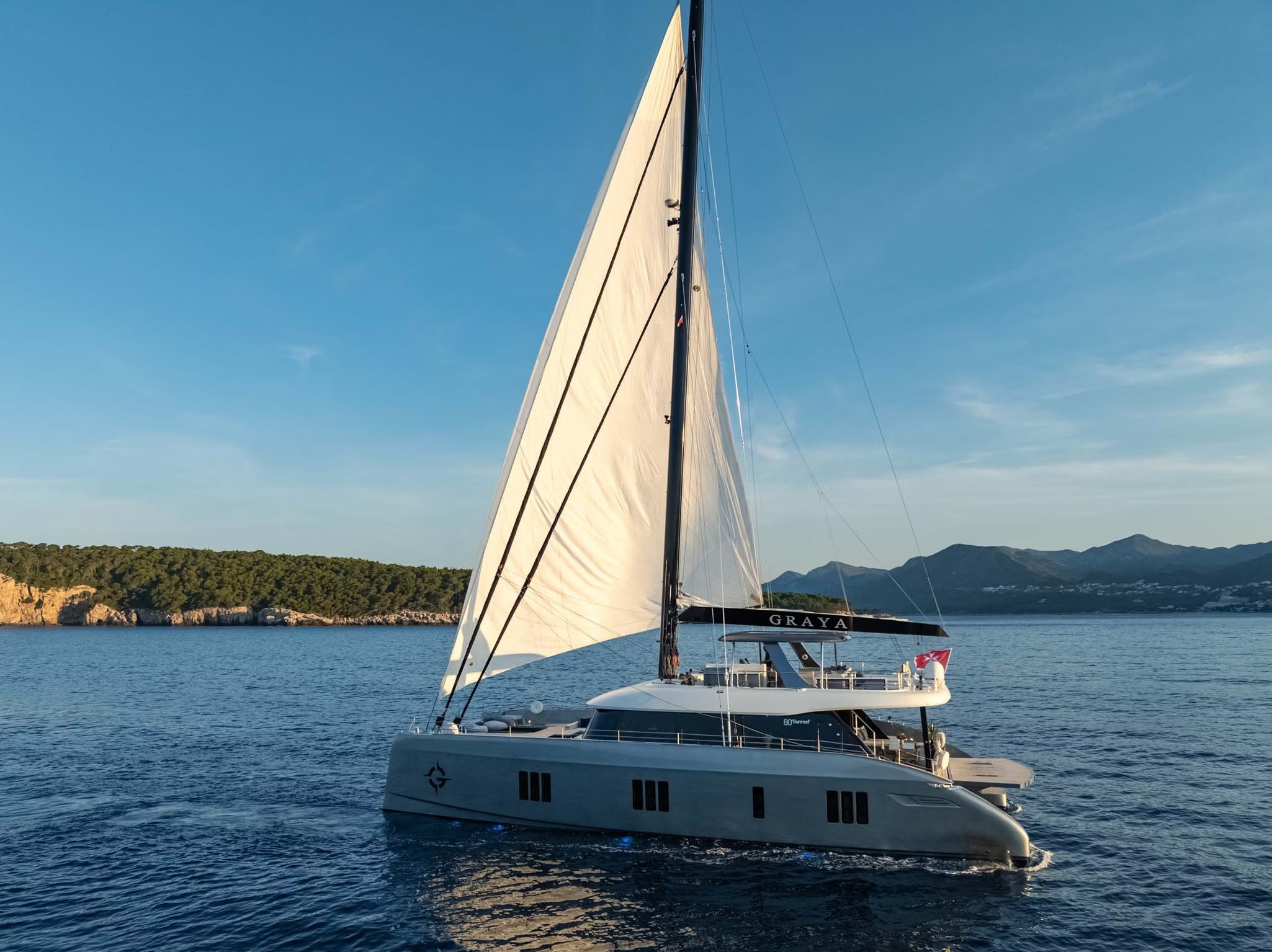 Sailing yacht GRAYA is a 24.40m (80' 1") luxury catamaran built by Sunreef in 2022 and is an all-round leisure yacht ideal for exclusive getaways, charters and ocean adventures. The interior and exterior spaces flow beautifully between one another and can host up to 9 guests in 4 suites, looked after by a crew of four.