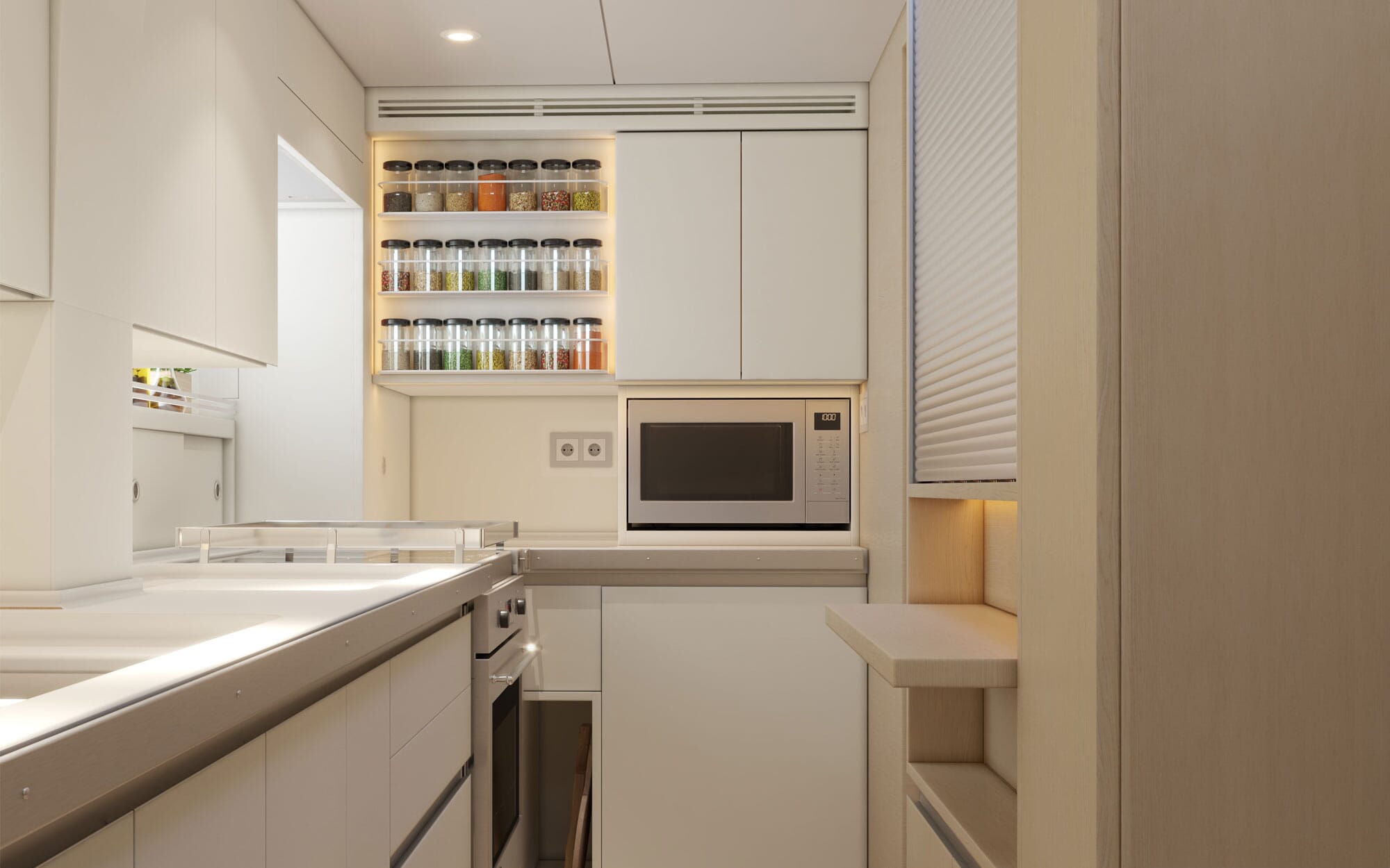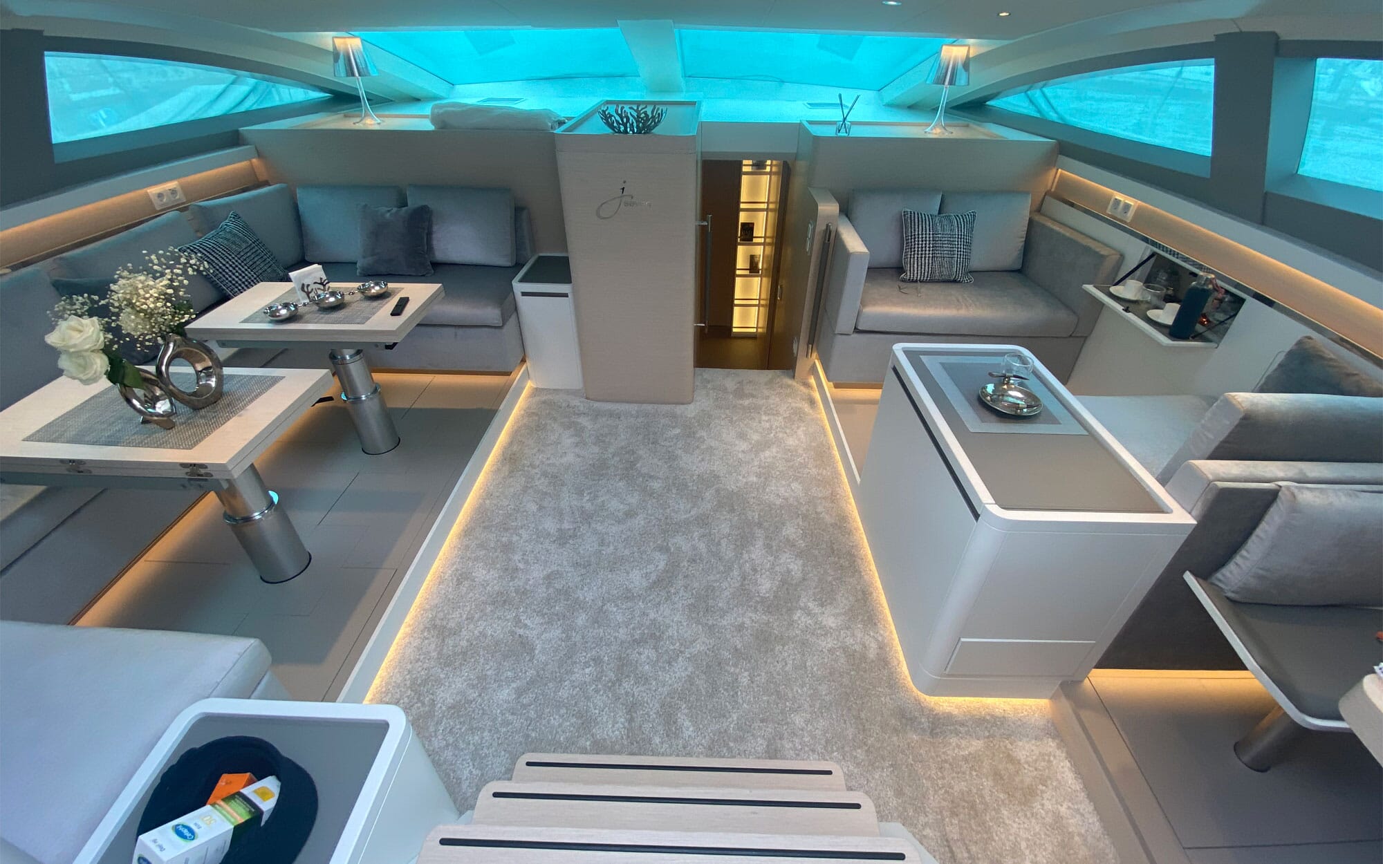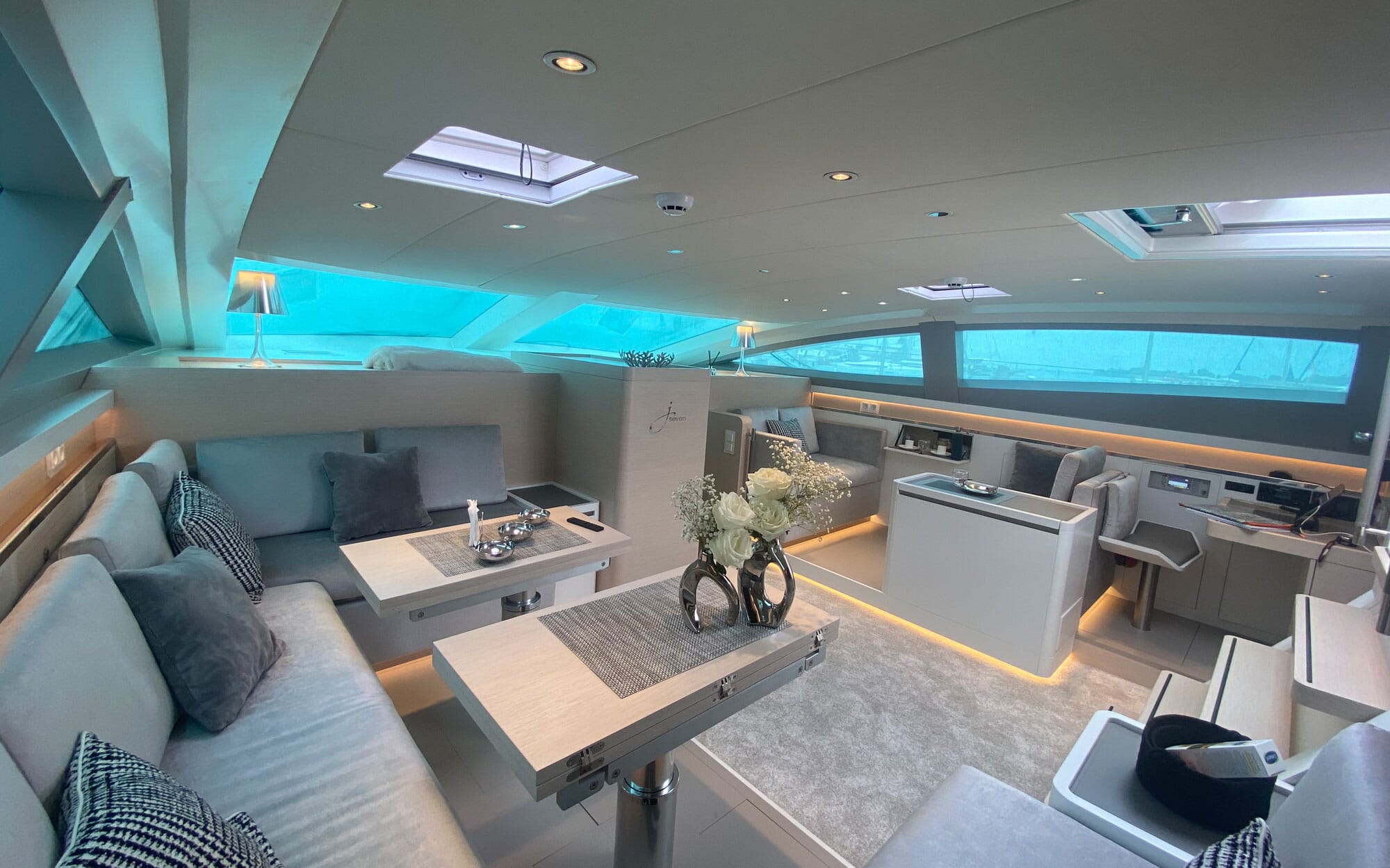 The interior is beautifully presented with a neutral finish and elegant lighting. The main salon features fitted, u-shaped banquette seating where two adjustable up/down tables create a flexible guest space. There is another cosy seating area with two built-in armchairs facing each other making a convivial space.