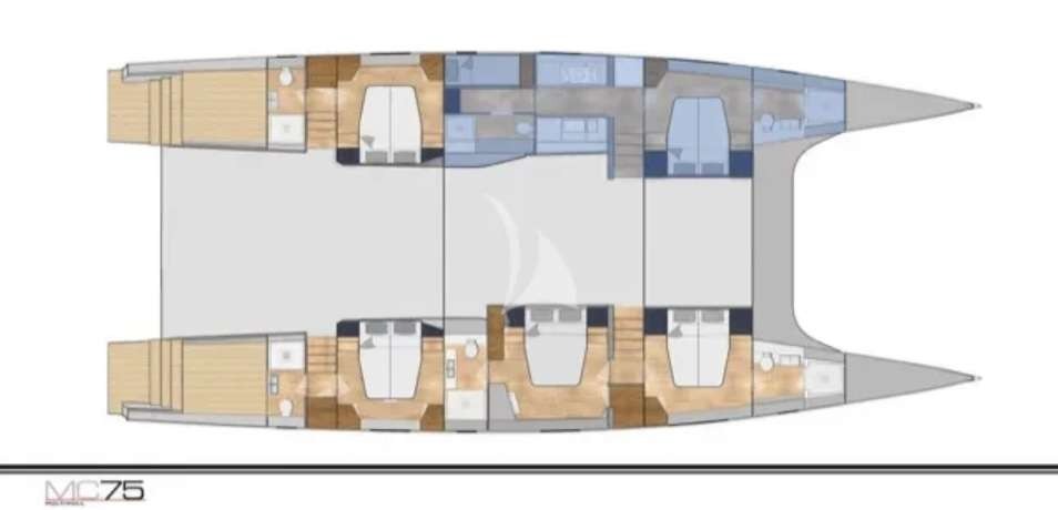 The layout is great for groups of friends, offering four equal sized double suites – three on the starboard hull and one on the port hull, all with the luxury and privacy of ensuite bathroom facilities. The crew space including cabins and galley/pantry is forward in the port hull.