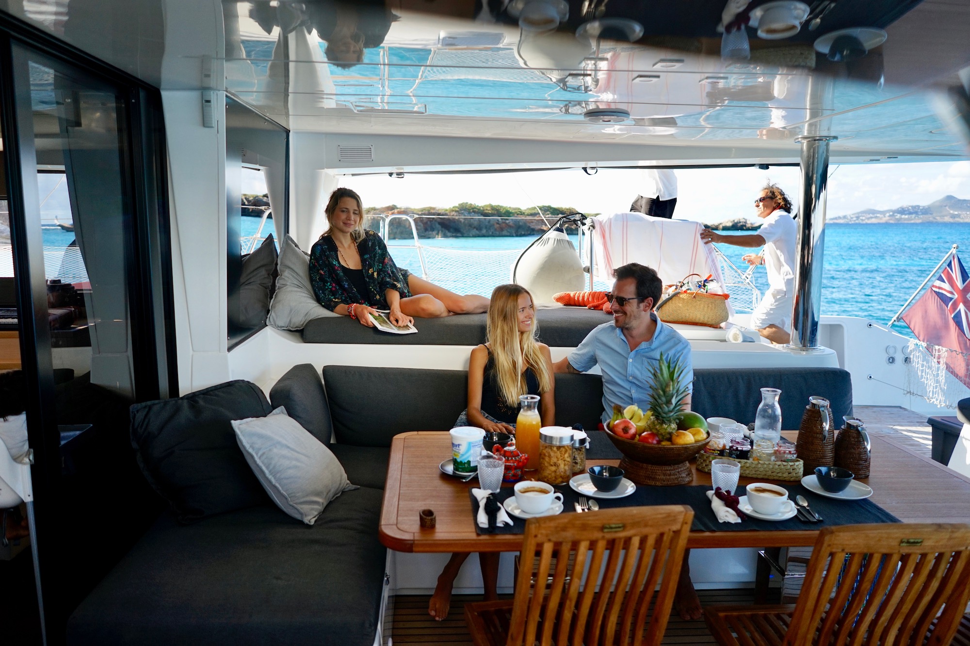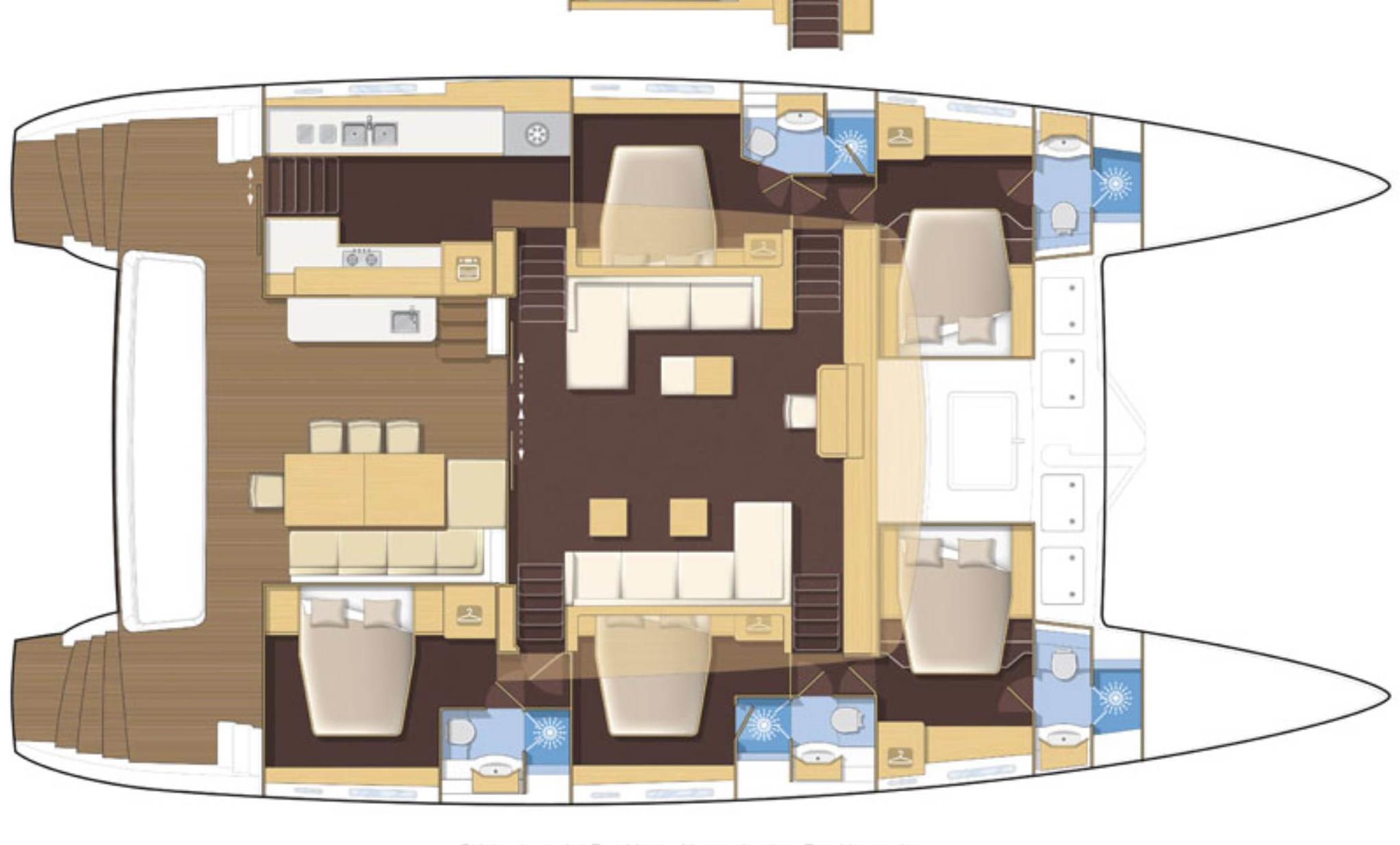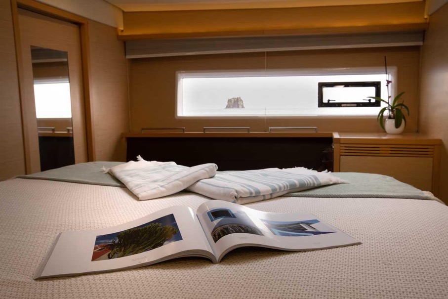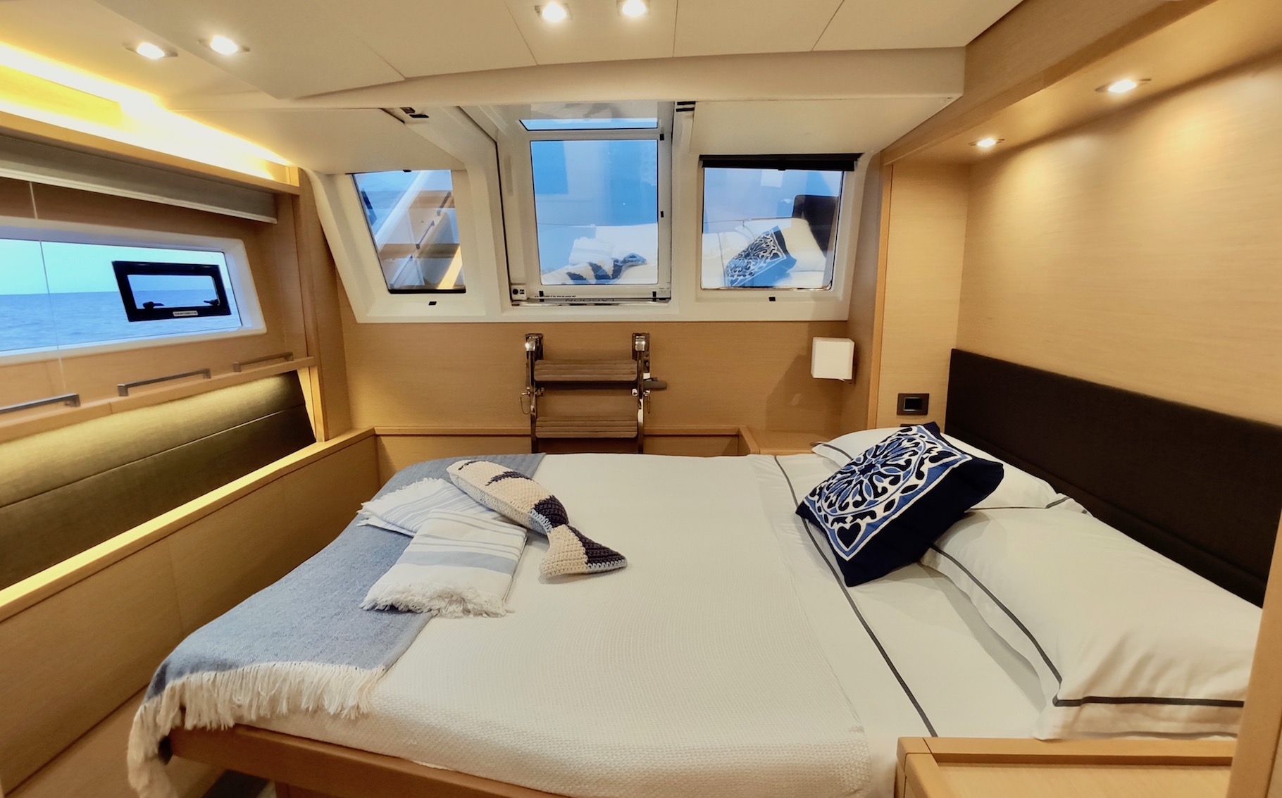The exterior living areas are generous, ideal for a relaxed charter experience. A shaded aft deck is a real social hub, with alfresco dining, raised side sun pads and a large aft seating arrangement. On the foredeck are 2 fitted safety trampolines, which are great for sunbathing. Her upper deck features seating, shade and sun pads.