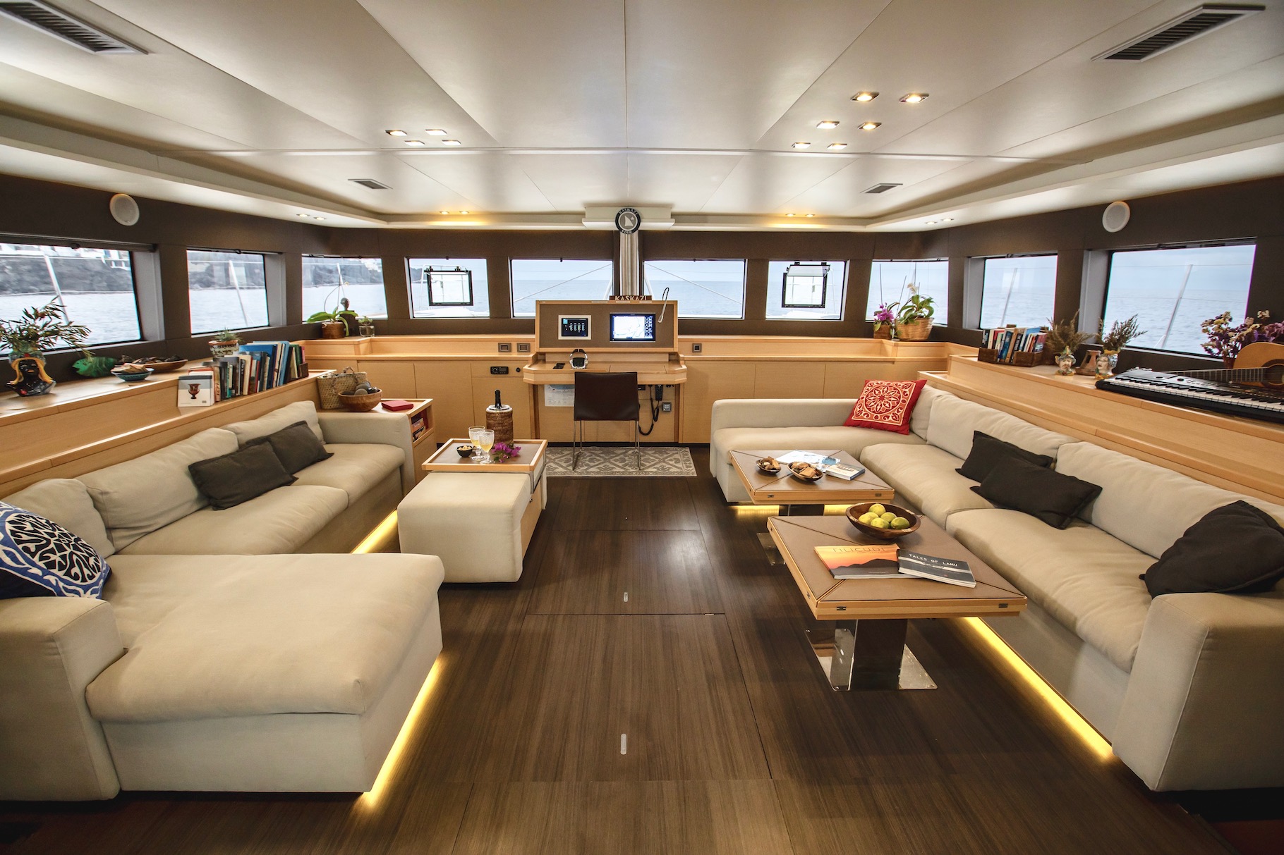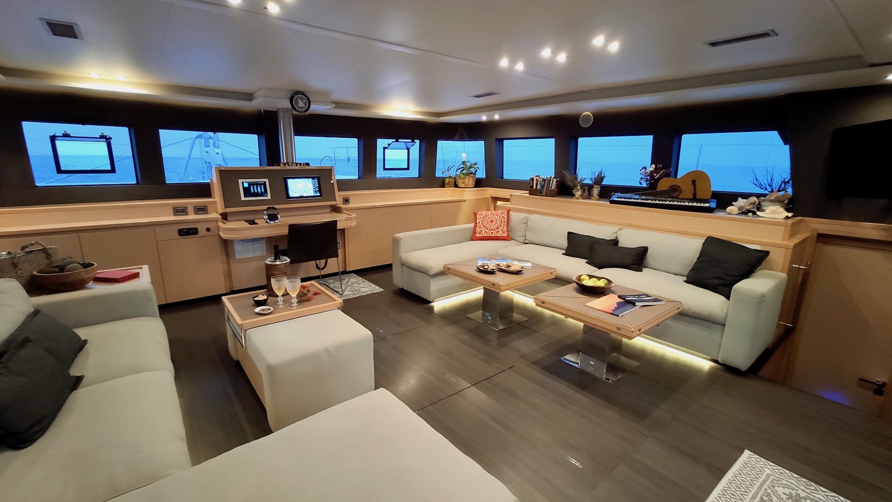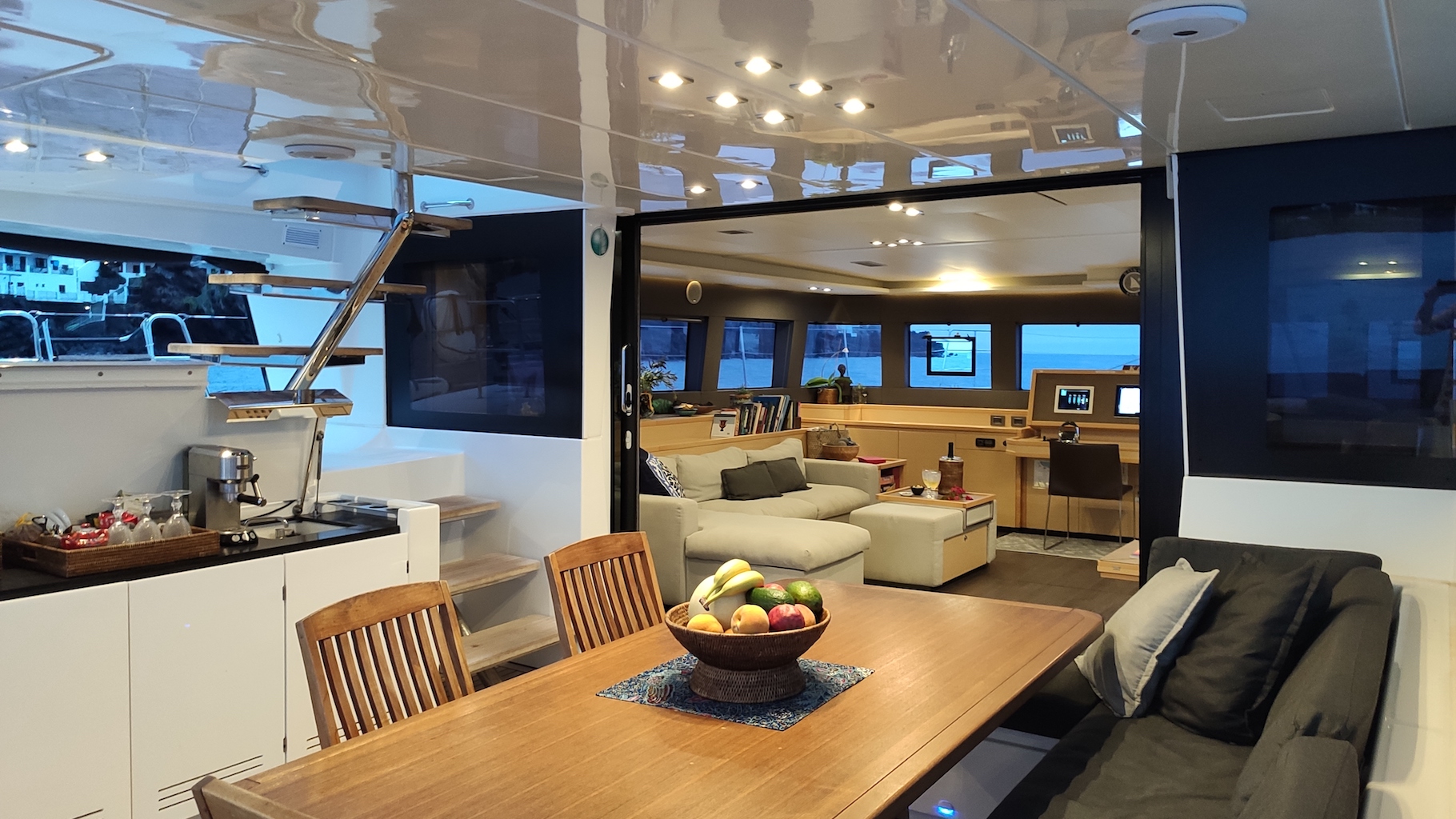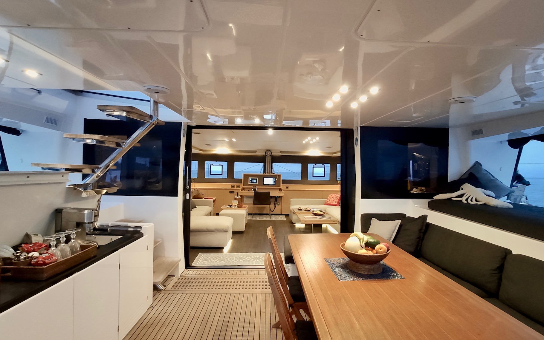 Her interior décor is contemporary a blend of dark and light woods, complimenting the neutral furnishings. The salon is an open plan, offering a comfortable seating area to port and formal dining to starboard. Surrounding vertical windows allow ample natural light while providing scenic views.