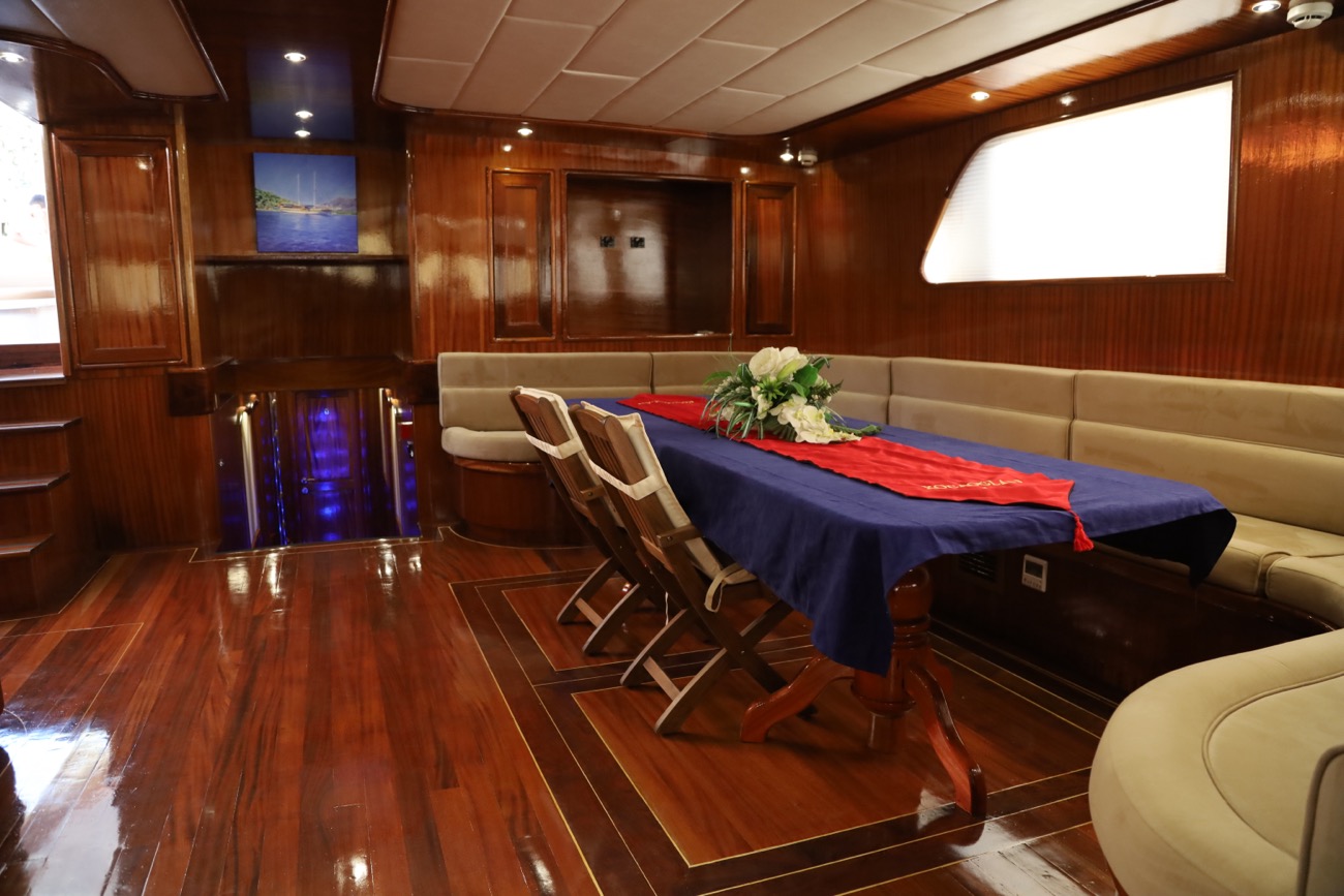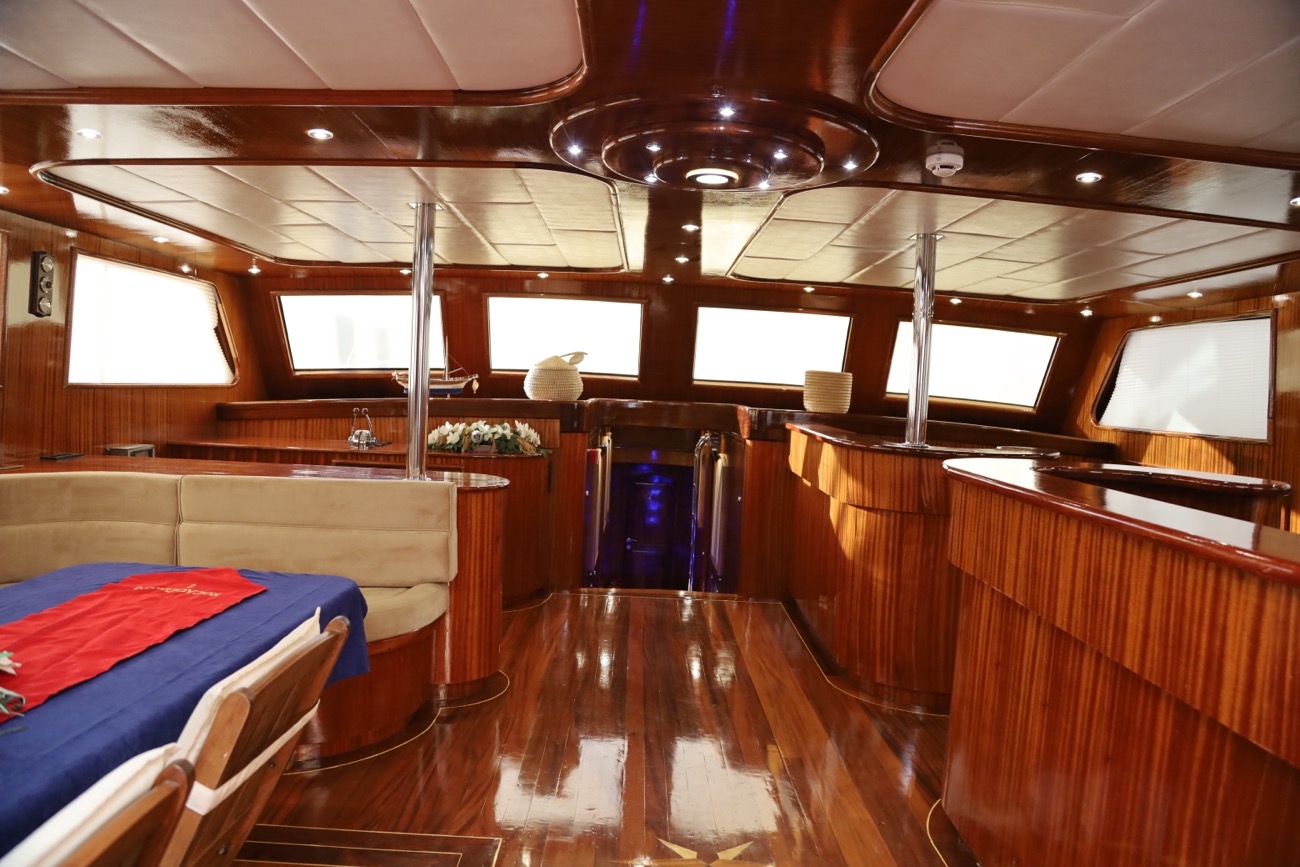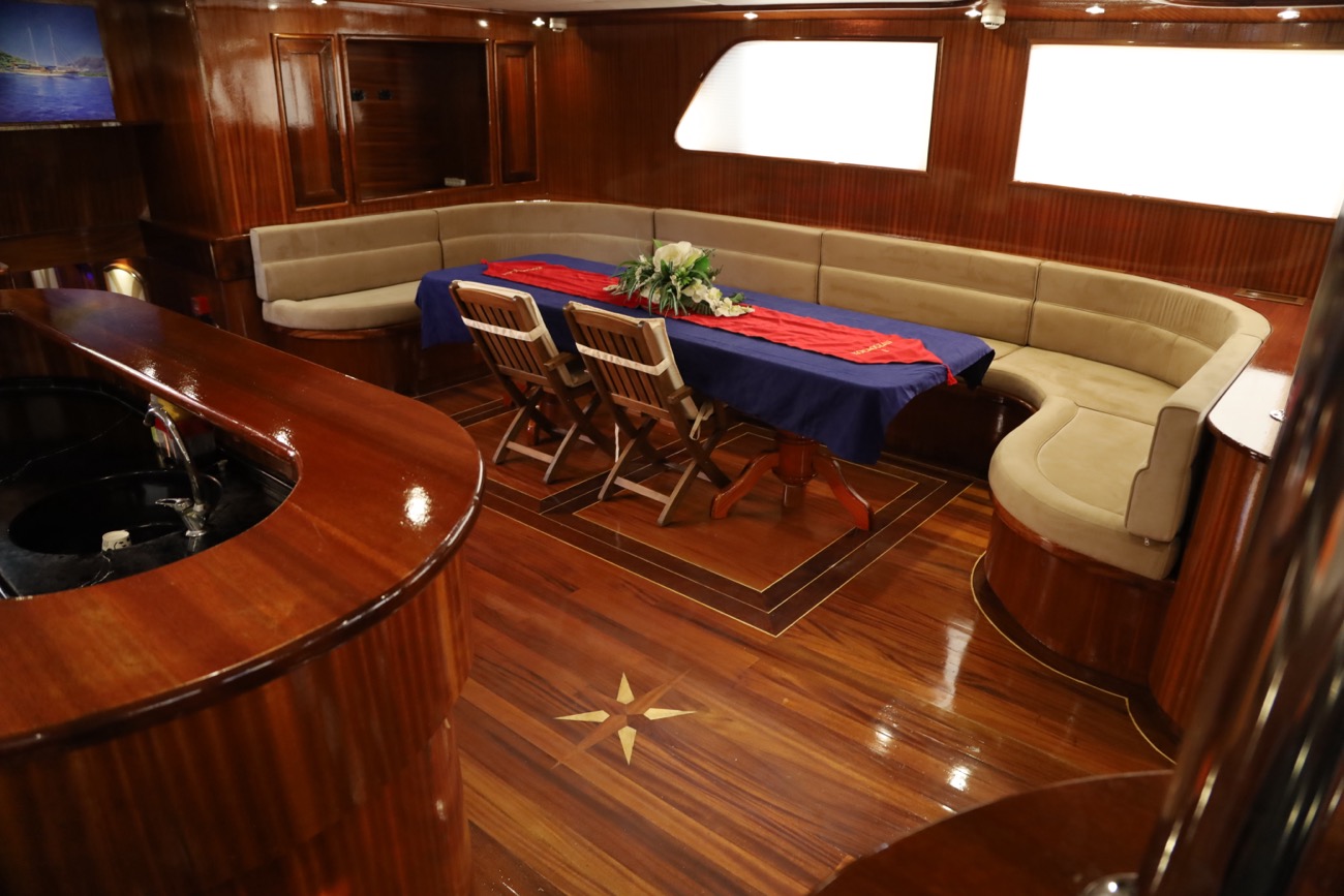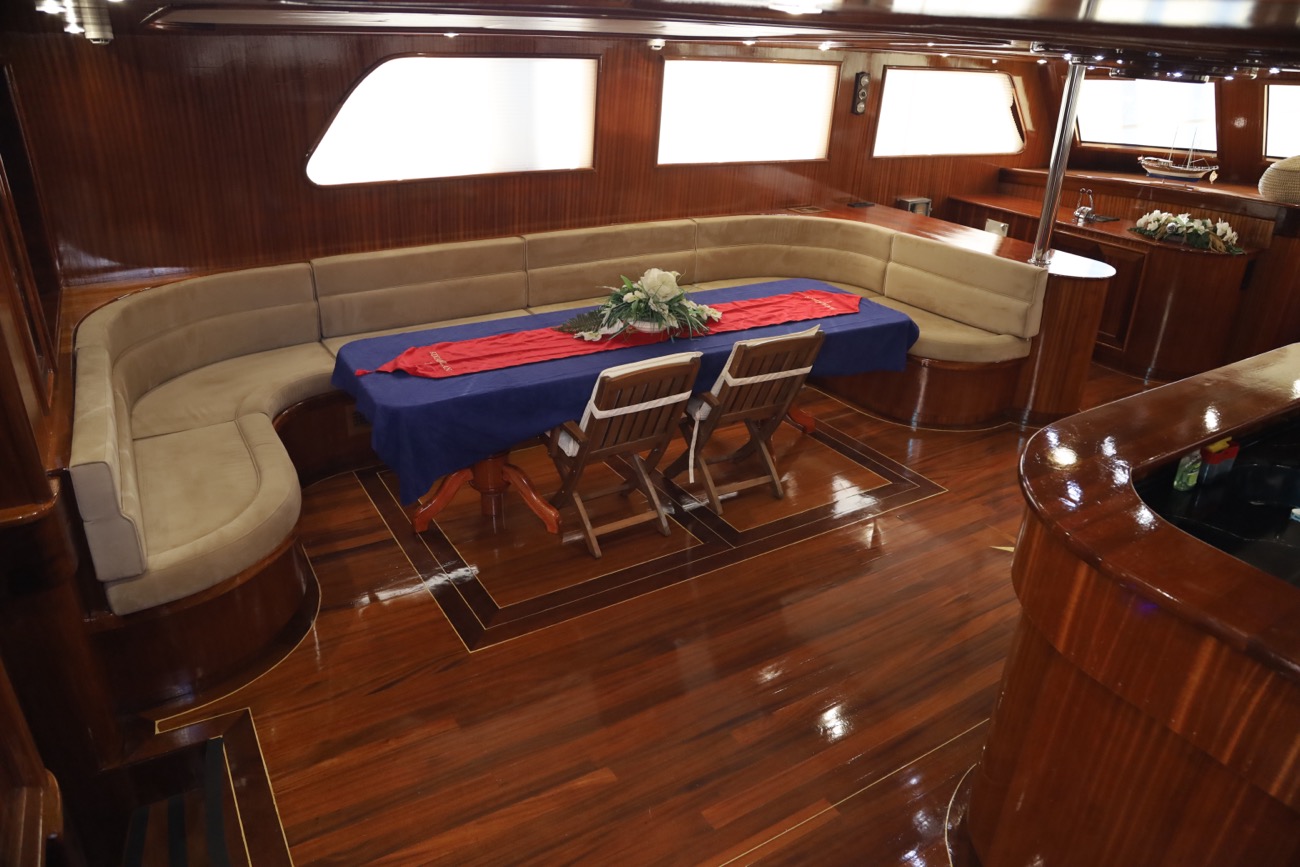 The main salon has a classic yacht vibe with high gloss wood flooring and panelling and is configured with a u-shaped dining setting and a bar. The accommodation is on the lower deck.