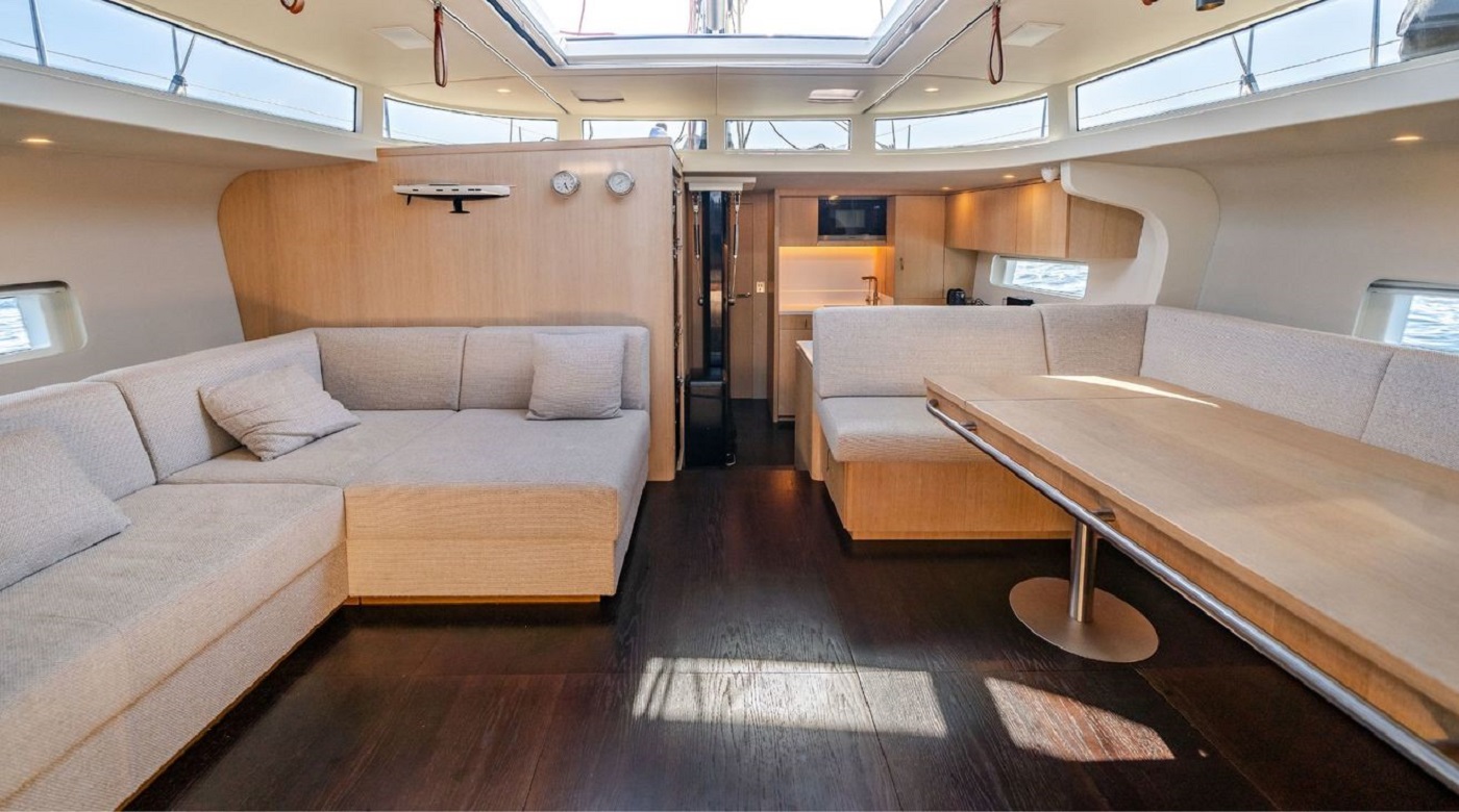 The interior is finished to a high standard with dark wooden floors and blonde wooden panelling and built in furniture. The soft furnishings are a neutral tone and the communal areas are filled with light. There is a lounge space opposite a dining area, with the galley positioned aft down a few steps.