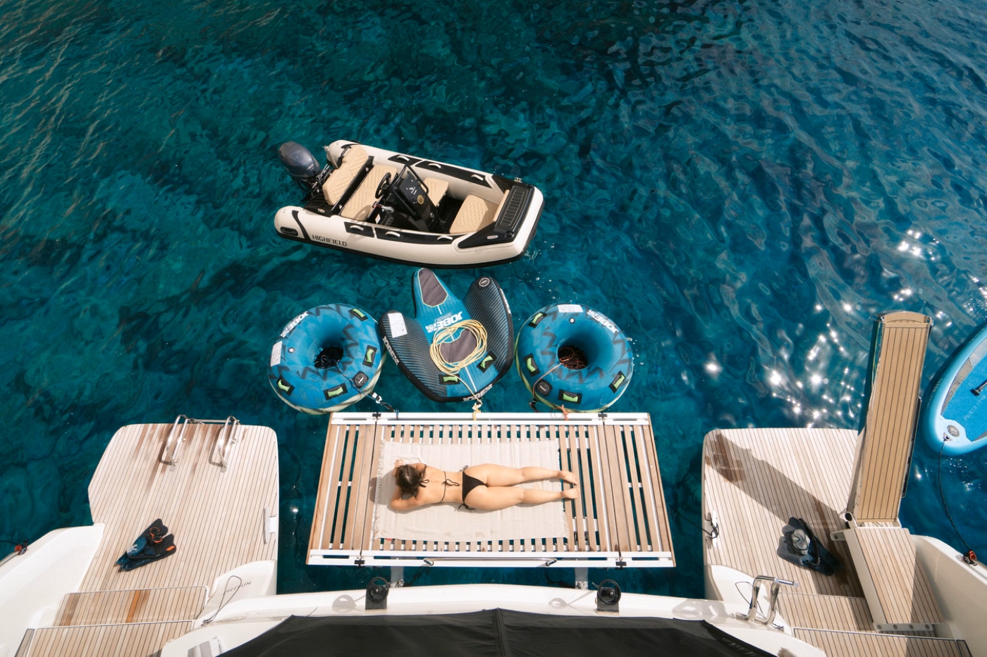 The outdoor areas are very impressive, offering a choice of spaces for relaxation and entertainment. The expansive flybridge provides a panoramic view across the water complete with comfortable sunbeds, a wet bar and a dining area perfect for relaxing in the cool sea breeze. The aft deck cockpit is wide and well-furnished creating a tranquil space for alfresco dining or simply unwinding while taking in the stunning views. Steps lead down to the hydraulic swim platform from where the crew will launch the water toys.