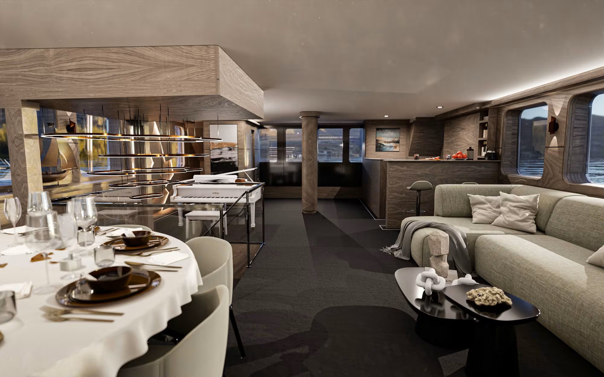 The main deck aft is dedicated to al fresco dining and is fitted with a built-in semi-circular dining settee which surrounds a huge dining table – there is additional seating to create a sociable table setting. Aft on the main deck is another wide sun pad with views over the stern. Steps lead down to the water’s edge beach terrace with a hydraulic section guiding guests into the sea.