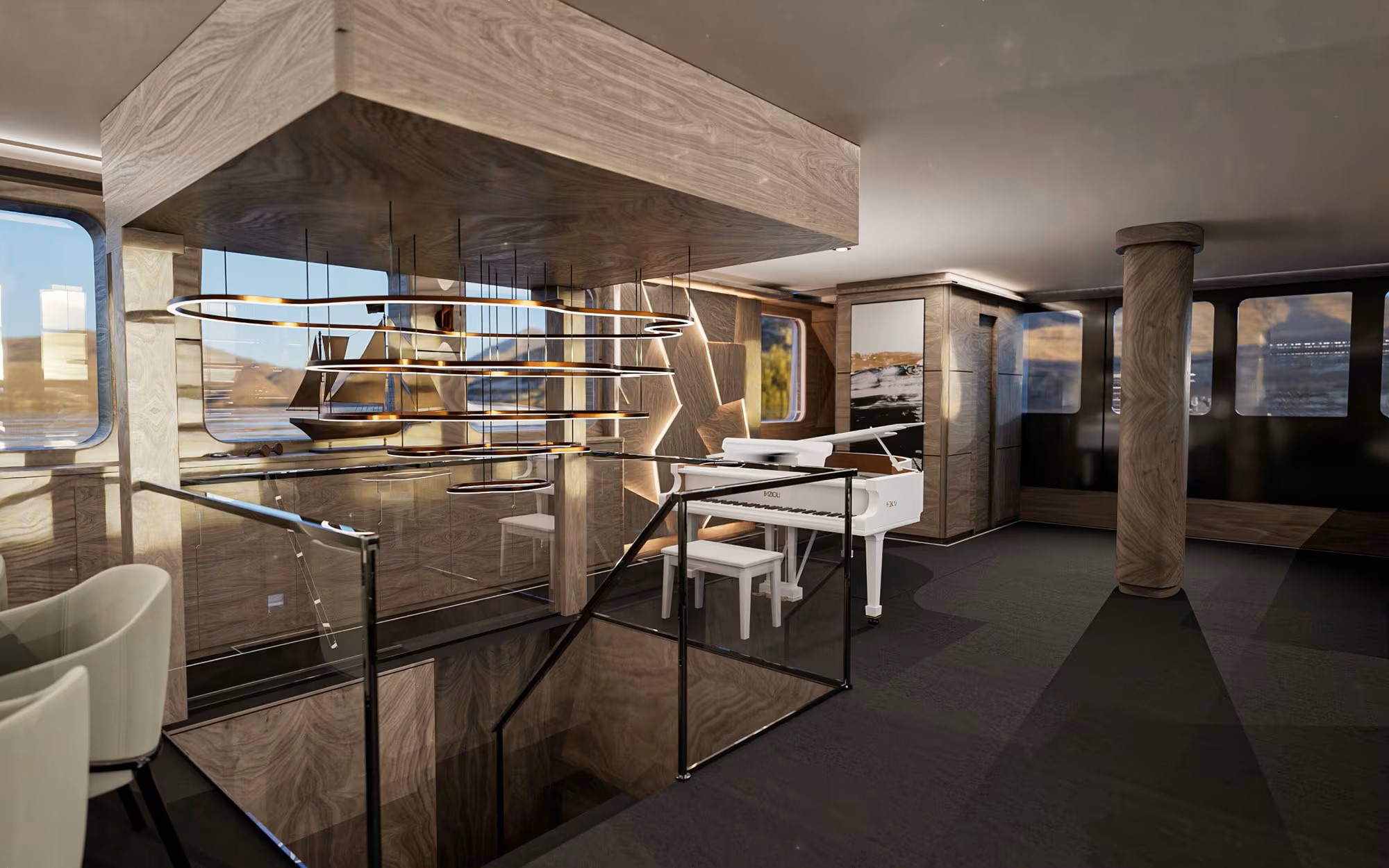 The stylish interior has a rich and cool design language which include dark flooring, oversized furnishings and modern architectural features and finishes. There is a lounge area, dining setting, bar area and grand piano making the space perfect for hosting.