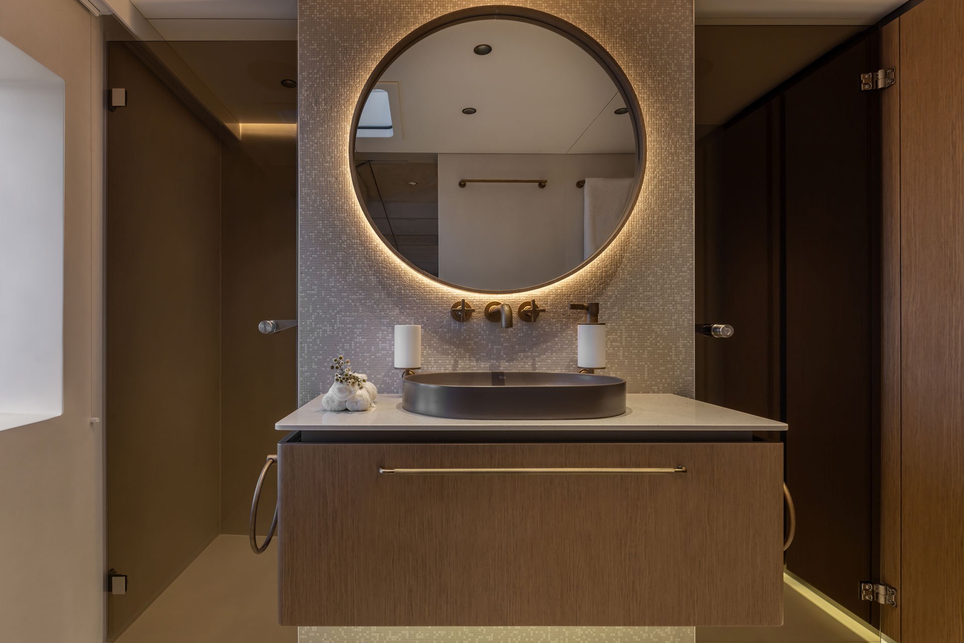 The foredeck is configured with a sunken terrace and two trampolines forward – there is also convenient access into the main salon. Side decks allow guests complete freedom to navigate the yacht from stern to bow. At the stern is a wonderfully sociable cockpit with a dining setting, sun pad and steps down to the water’s edge where a hydraulic central platform can be raised or lowered to create a flexible terrace area.