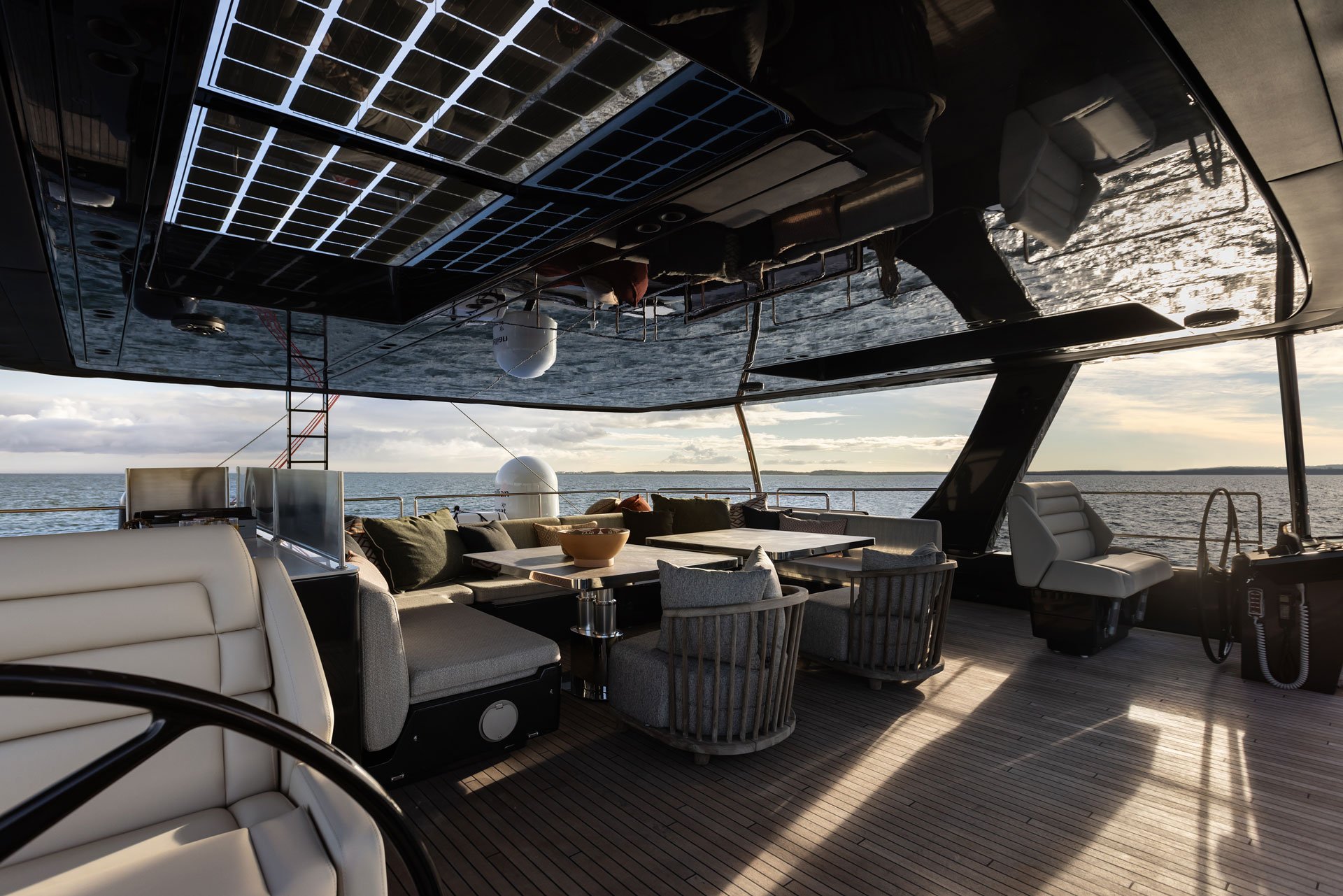 Sailing catamaran OTOCTONE is a contemporary and stylish yacht with sleek black hull, superstructure and sails. On the sundeck there is a beautiful dining setting with a u-shaped bench sofa wrapping around a flexible table. Dual helm controls are forward and there is plenty of space to sit back, relax and take in the views.