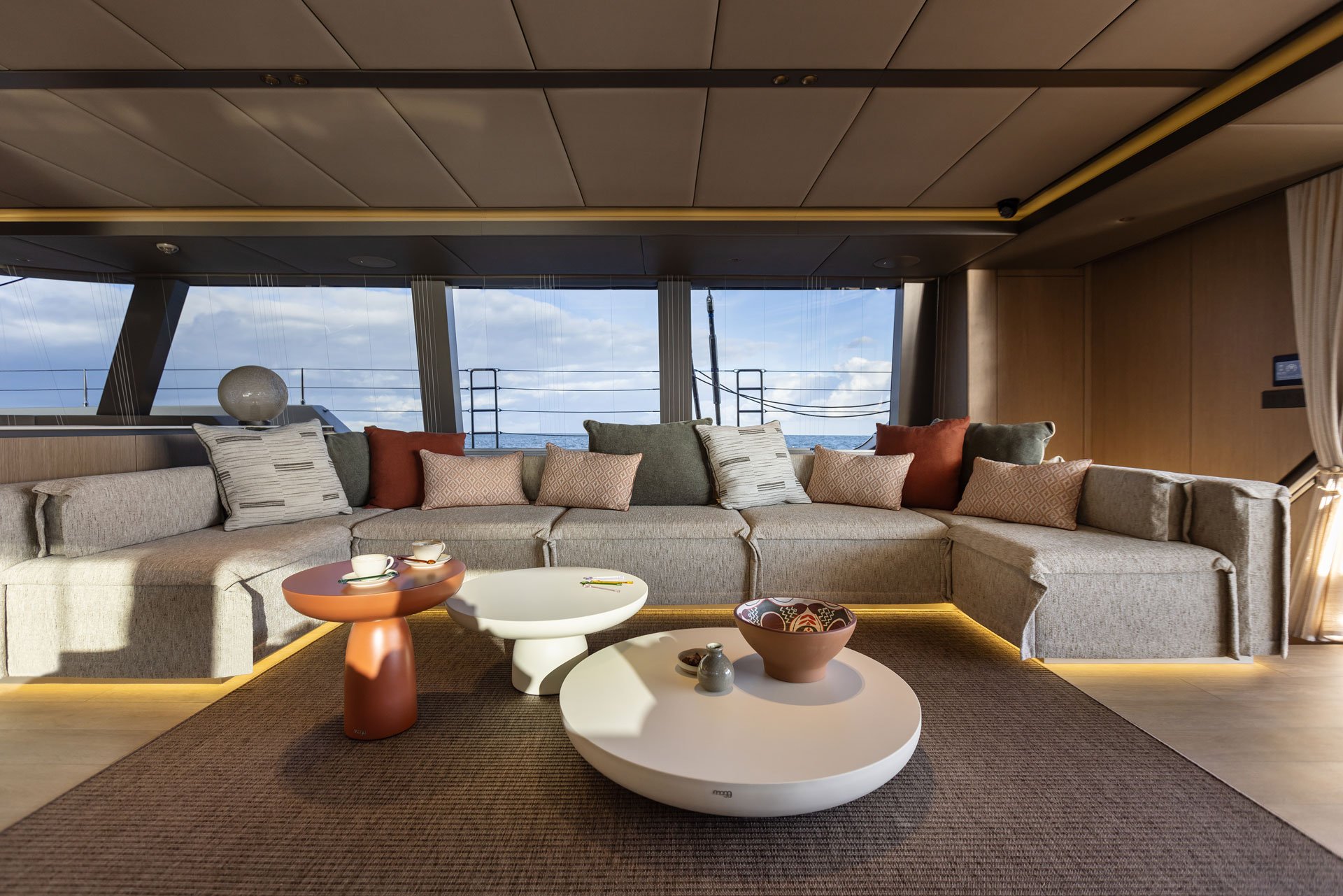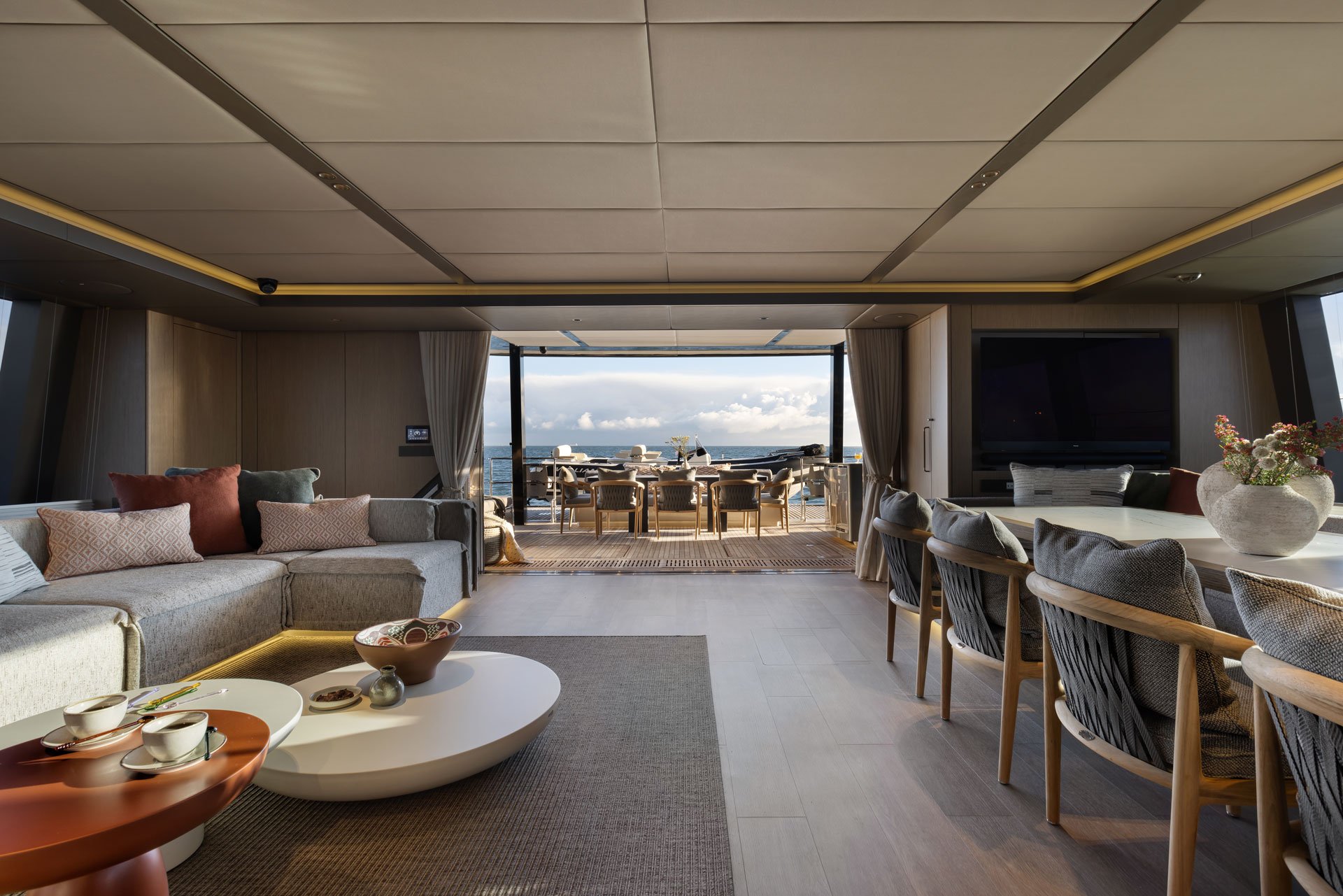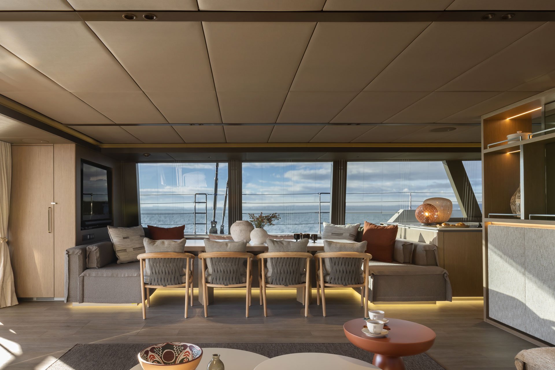 The interior décor is understated, elegant and chic including soft grey upholstery, subtle colour accents and a thoughtful layout which makes the most of the wide beam. There is a dining setting to port and a sofa to starboard with a crew pantry area and technical area forward, semi-screened by a built-in storage unit.