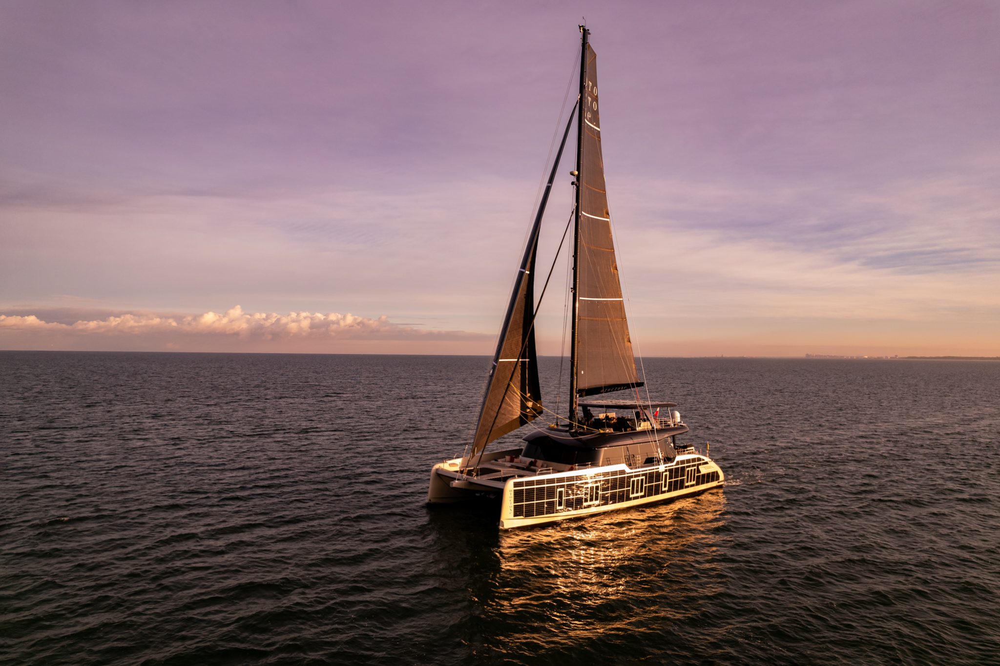 NOTABLE FEATURES OF OTOCTONE: ~Innovative solar powered catamaran ~Cool black superstructure and sails ~Comfortable, stylish interior ~Expansive decks ~Air conditioning ~WiFi