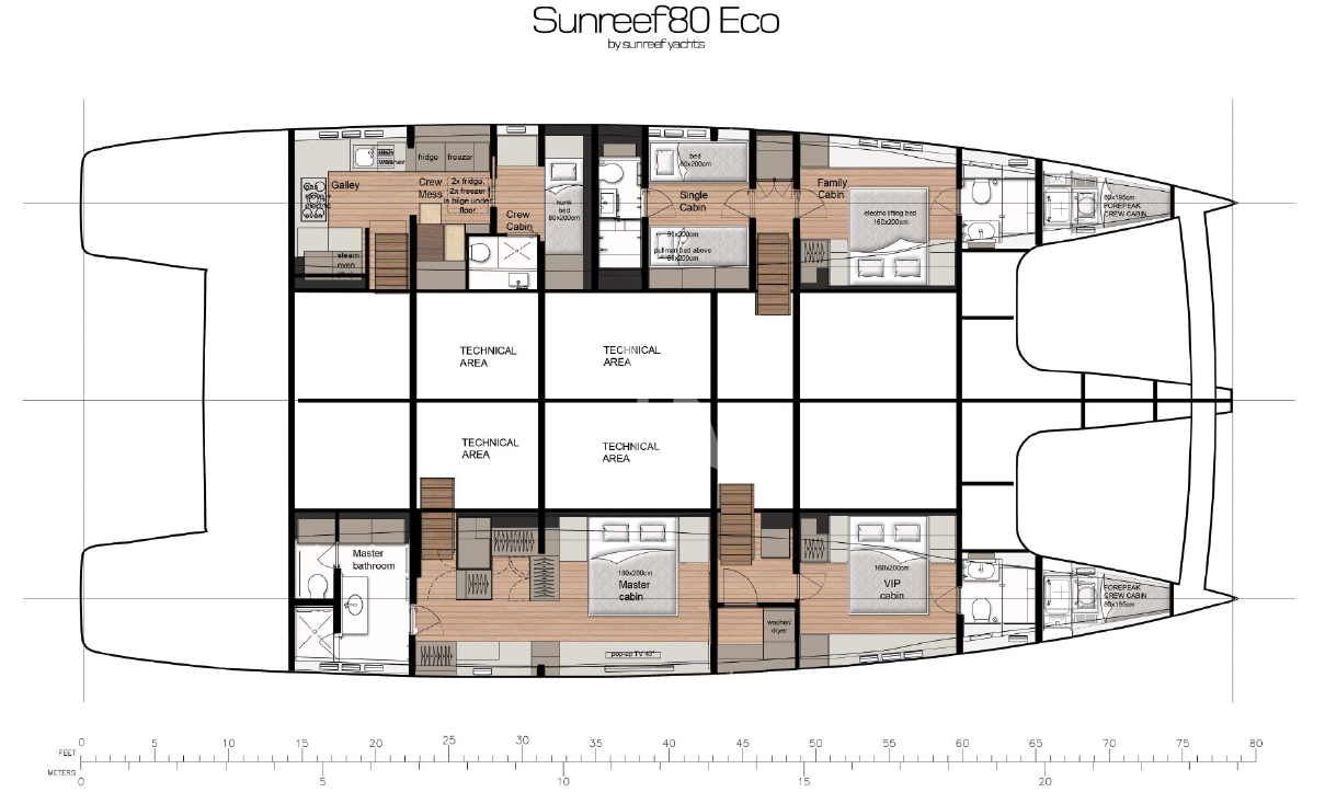 The guest accommodation and the galley/crew quarters are on the lower deck.