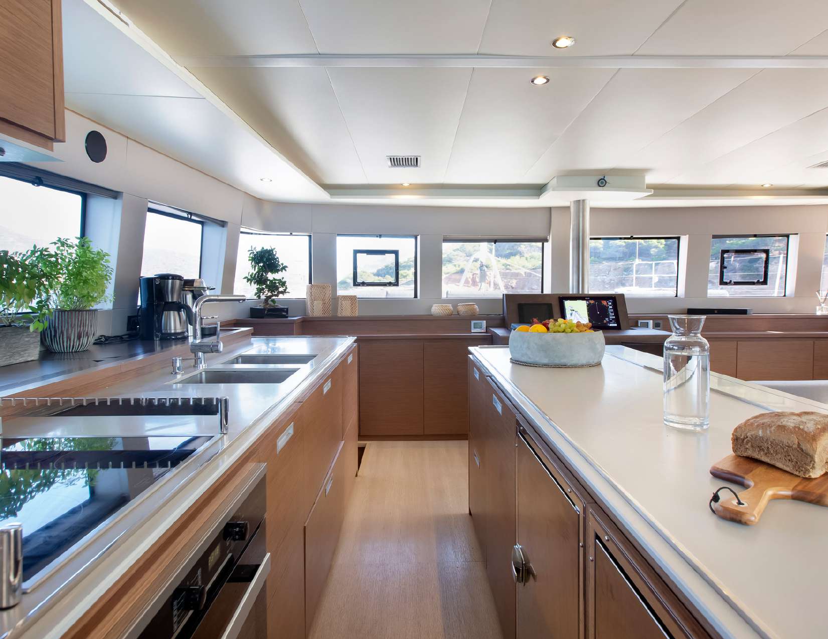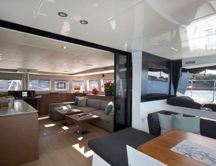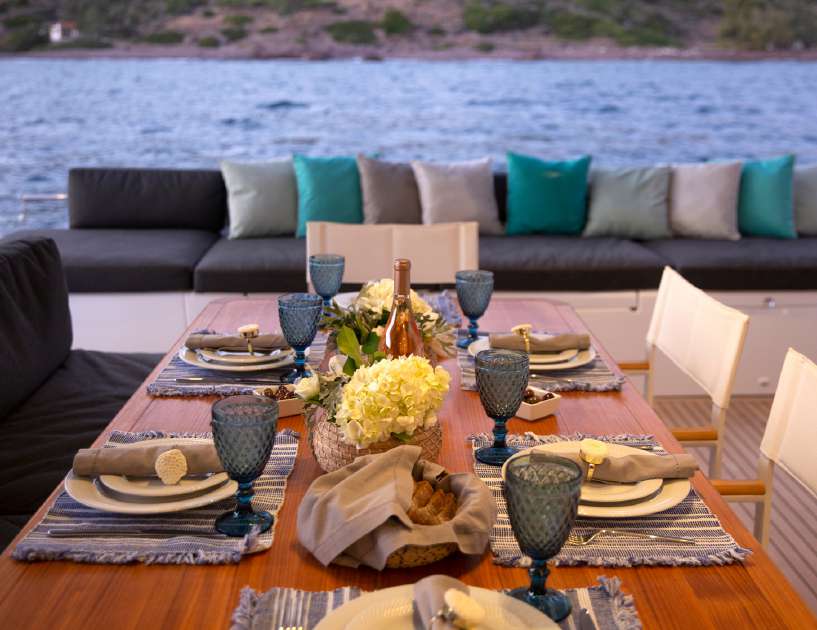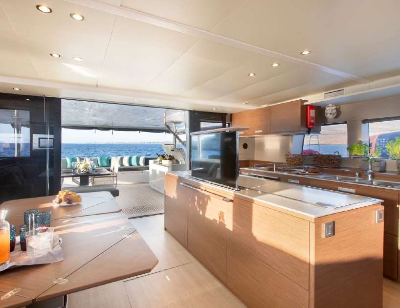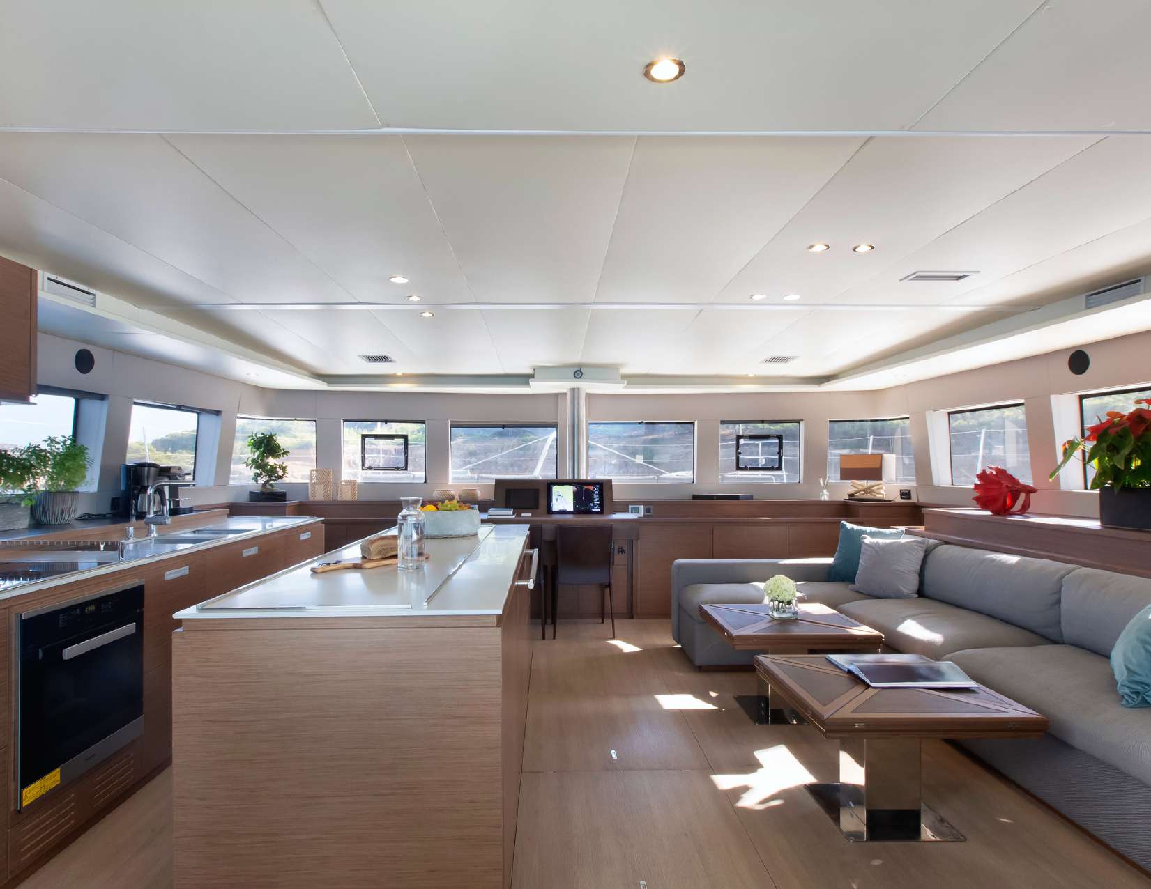 Extensive glazing on all sides creates a light and airy interior and provides a port side galley and a starboard L-shaped seating area with drinks tables that can extend out for formal dining as a large group. The helm station forward and centre divides the two sections.