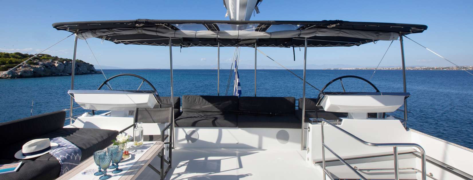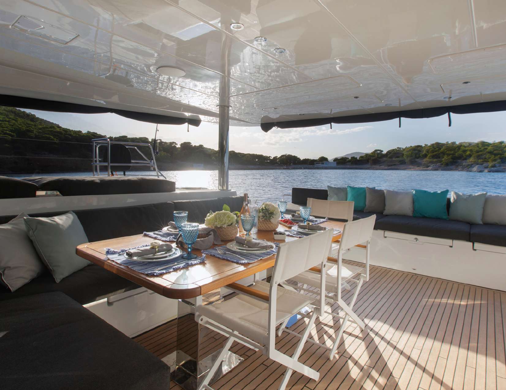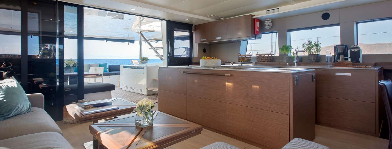 Extensive glazing on all sides creates a light and airy interior and provides a port side galley and a starboard L-shaped seating area with drinks tables that can extend out for formal dining as a large group. The helm station forward and centre divides the two sections.
