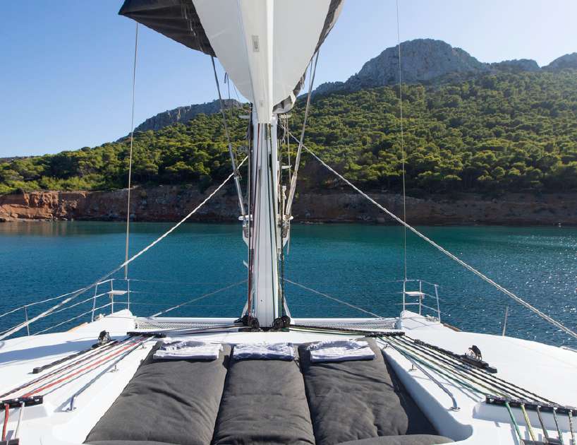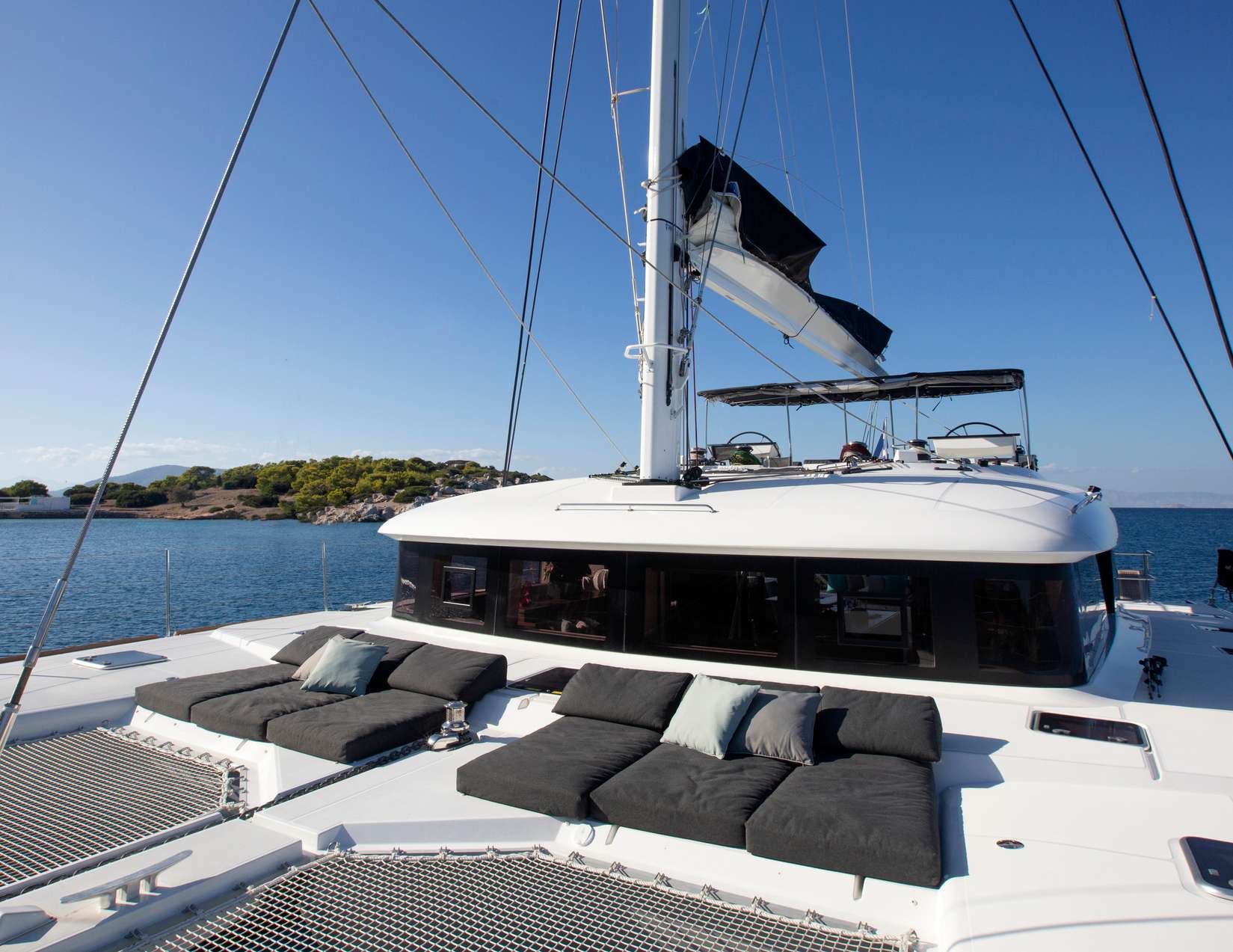 On the foredeck, there is a row of sun pad seating in front of the helm station and two forward trampolines provide an additional place to sunbathe.